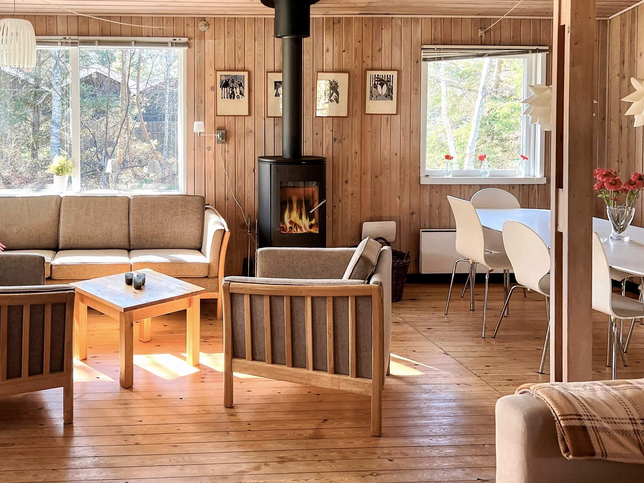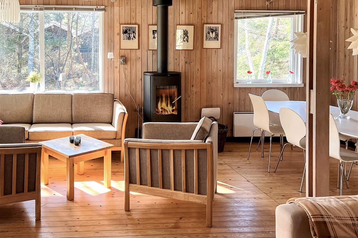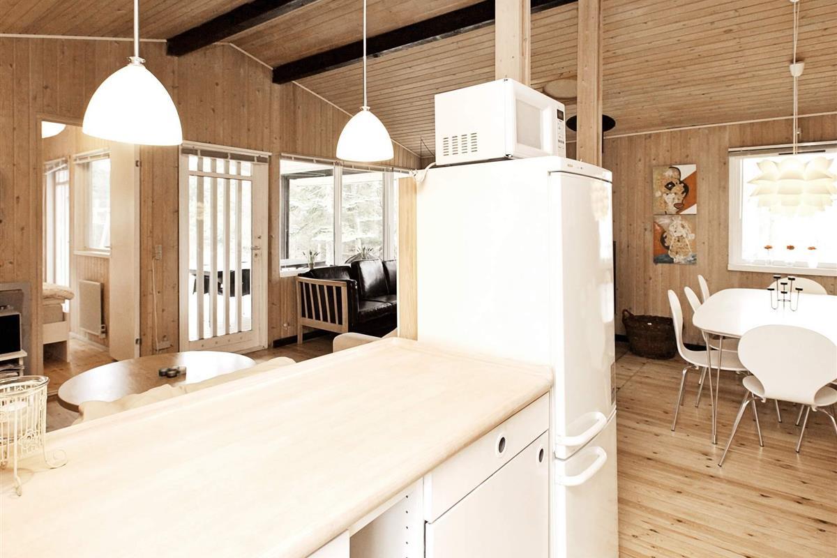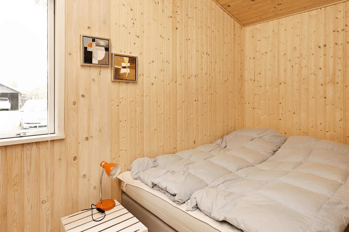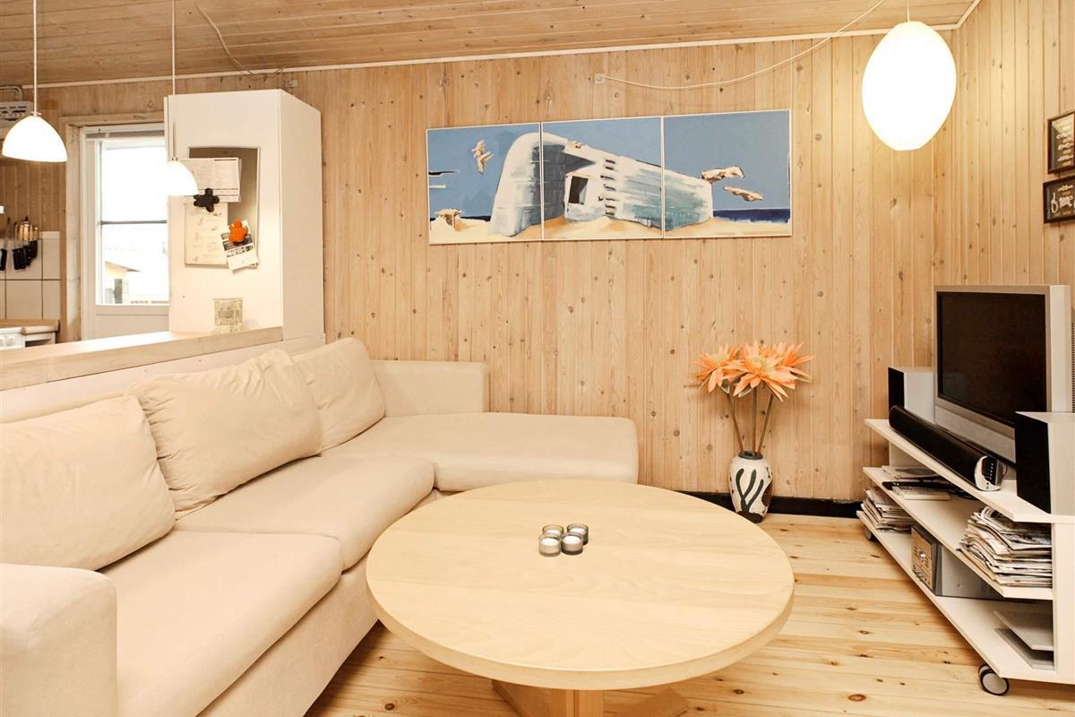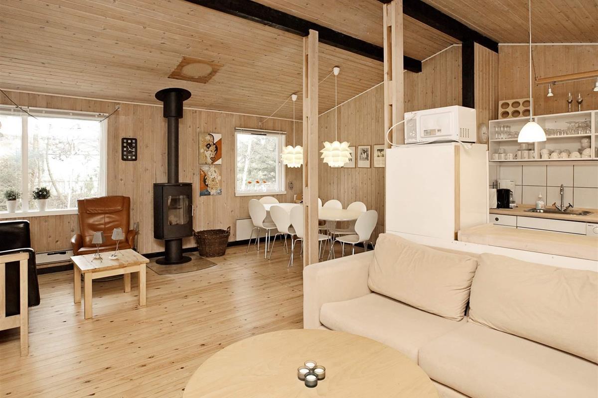 Ferienhaus in ruhiger Umgebung bei Napstjert Strand, zu dem Sie freien Zugangn über einen kleinen, gemeinschaftlichen Pfad haben. Das helle eingerichtete Haus hat ein geräumiges Bad mit Whirlpool und Sauna für Wellness und Erholung. Im offenen Küchen-/Wohnbereich gibt es eine Sitzecke mit TV und Holzofen für kühlere Abende. Vom Sofa aus können Sie die Aussicht auf die umliegende Natur durch die großen Fenster hindurch genießen. Das Naturgrundstück ist eingezäunt.