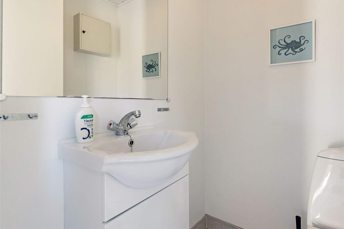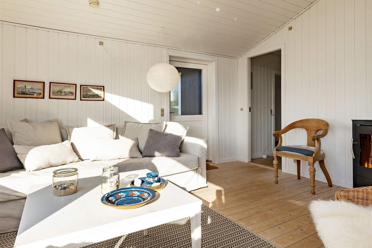In der großen Abteilung befindet sich ein helles Wohnzimmer mit Holzofen, TV, Sofaecke und Essbereich sowie ein Aktivitätsraum mit Tischfußball, Sofa und Ausgang auf die Terrasse nach Westen hin. Der Küchen-/Essbereich hat Ausgang auf die Ostterrasse. Zwei gute Schlafzimmer, eins davon mit Zugang zur Südterrasse und dem Hems, von dem Sie ein wenig vom Meer sehen können.