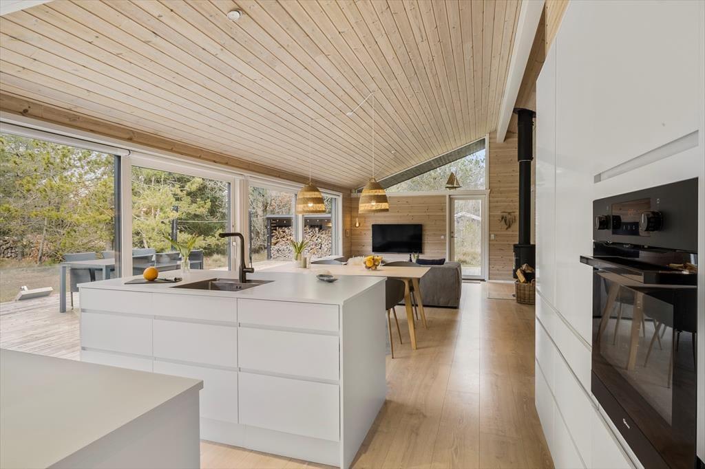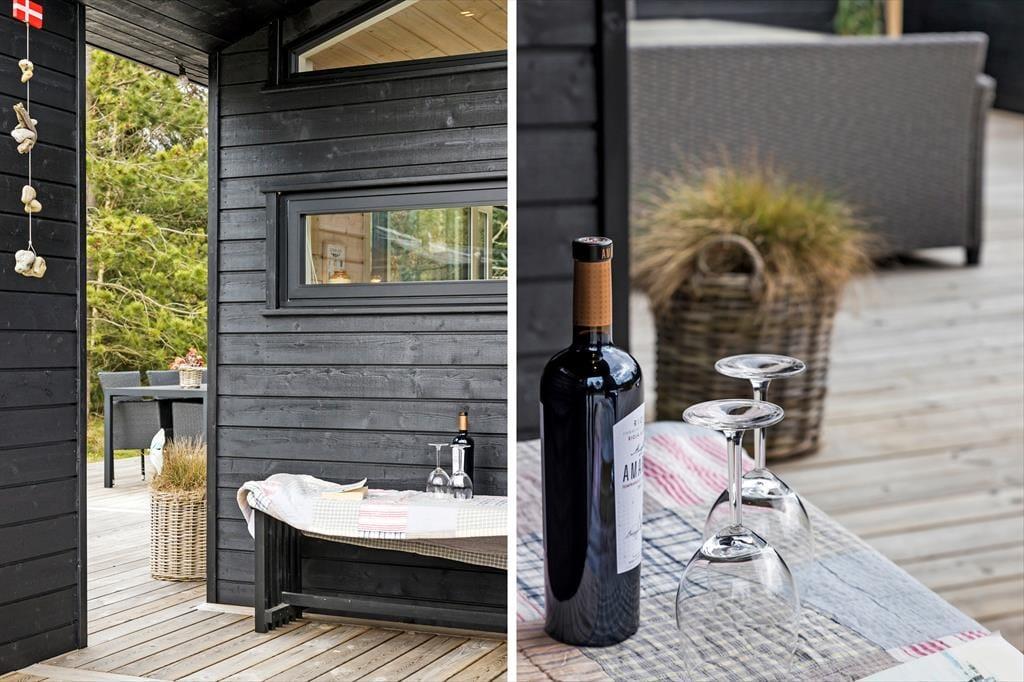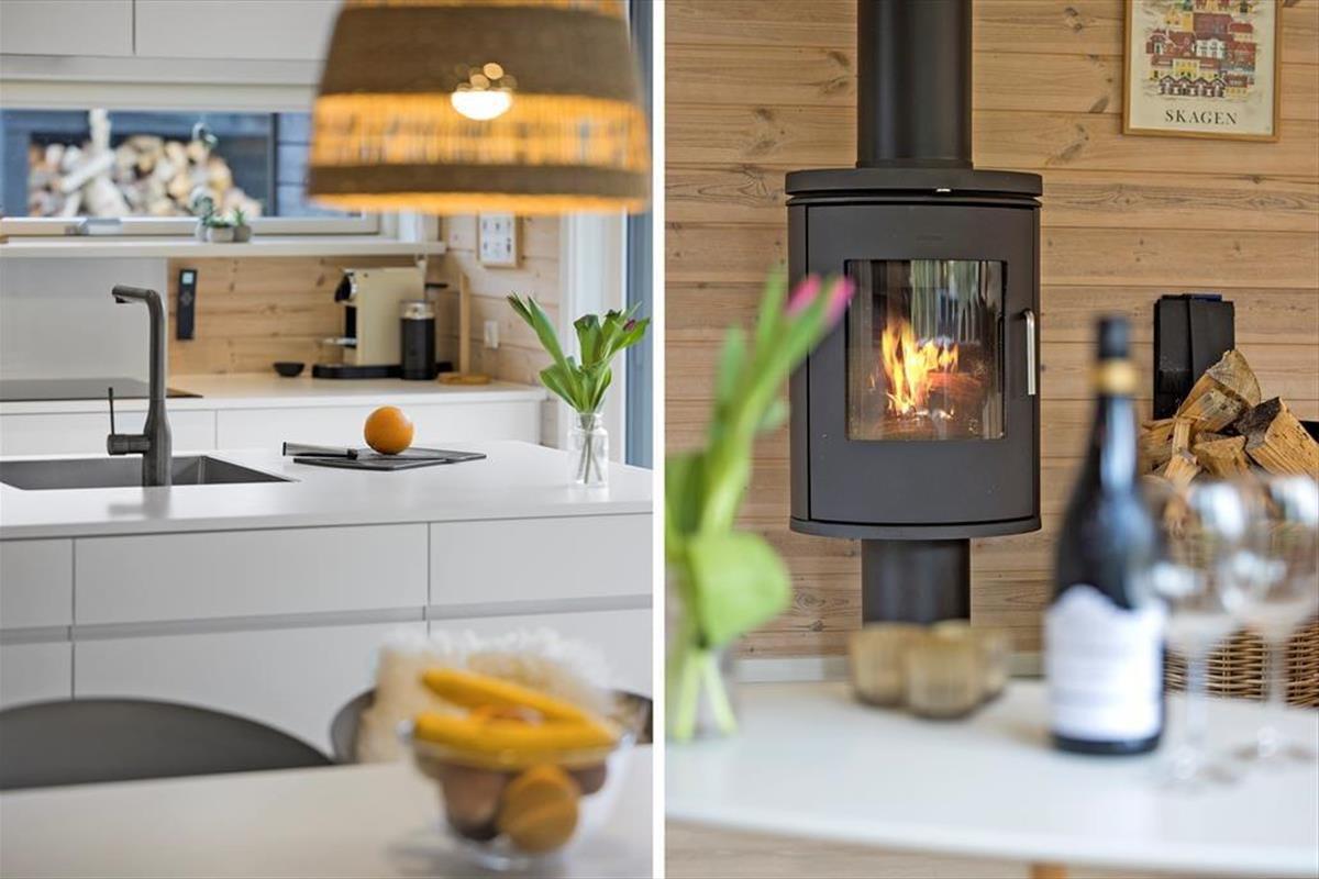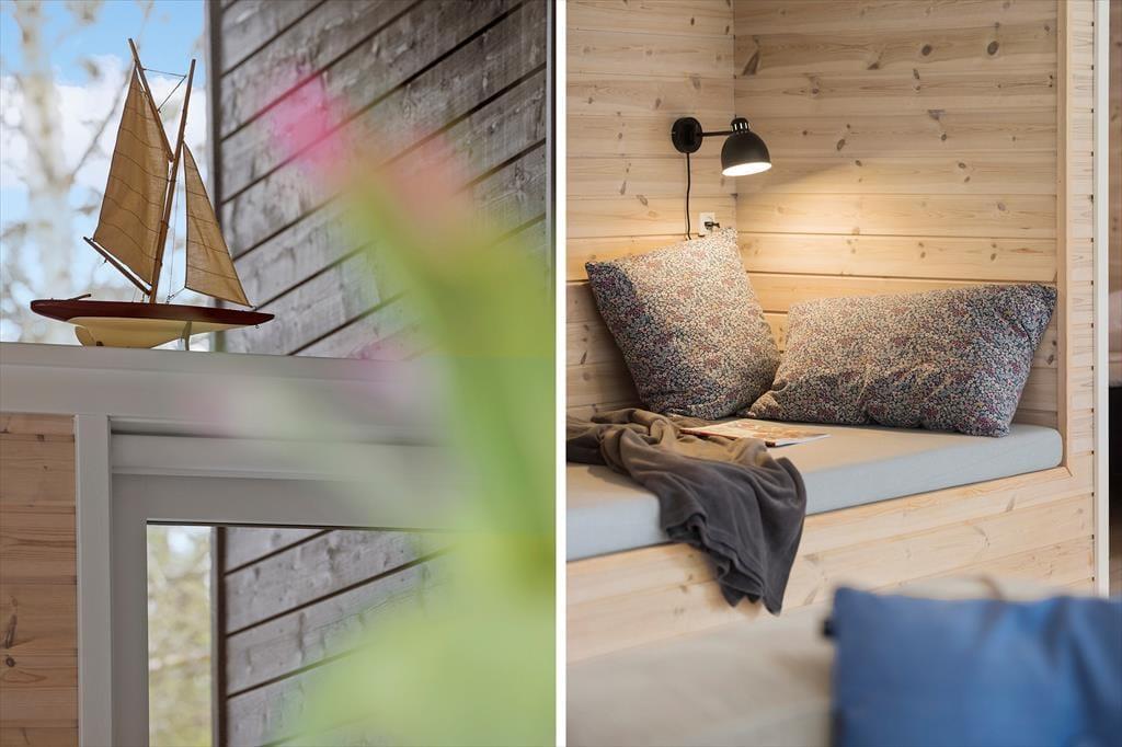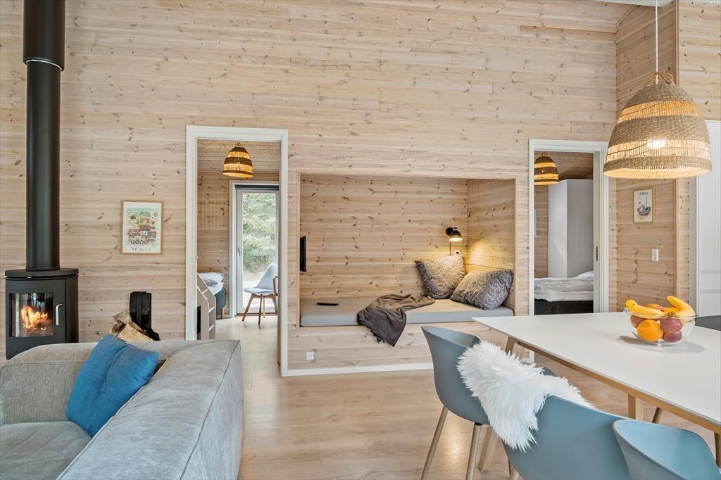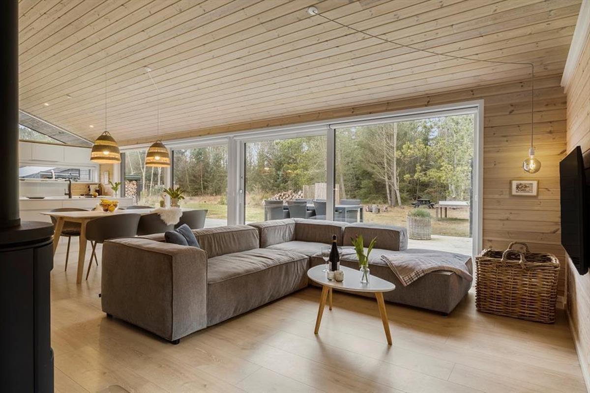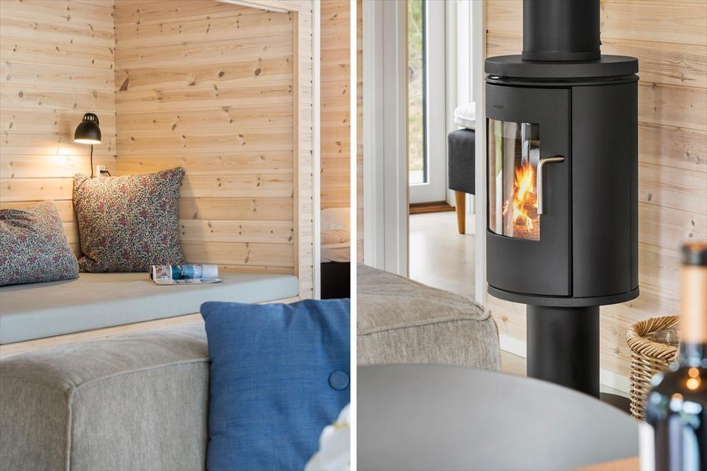 Die schwarze Holzfassade des Ferienhauses wird von großen Glasscheiben durchbrochen, die das Tageslicht ins Innere lassen und den Blick auf die schönen Bäume auf das Naturgrundstück freigeben. Es ist herrlich, hier zu sitzen und das viele Grün zu betrachten – und vielleicht kannst du auch die Vögel beobachten oder einen Fuchs vorbeiziehen sehen, während du dich auf dem Sofa entspannst oder es dir mit deiner Familie am Esstisch gemütlich machst. In den Wohnbereich ist eine schöne Küche integriert, die auch mit einem Kaminofen und einem Alkoven charmant ausgestattet ist. Letztere ist vor allem für Mittagsschläfchen und zum Lesen gedacht, denn in den drei Schlafzimmern des Hauses befinden sich sieben Betten. Wenn ihr das Haus zu mehreren bewohnt, ist es auch schön, dass es zwei Bäder im Haus gibt.