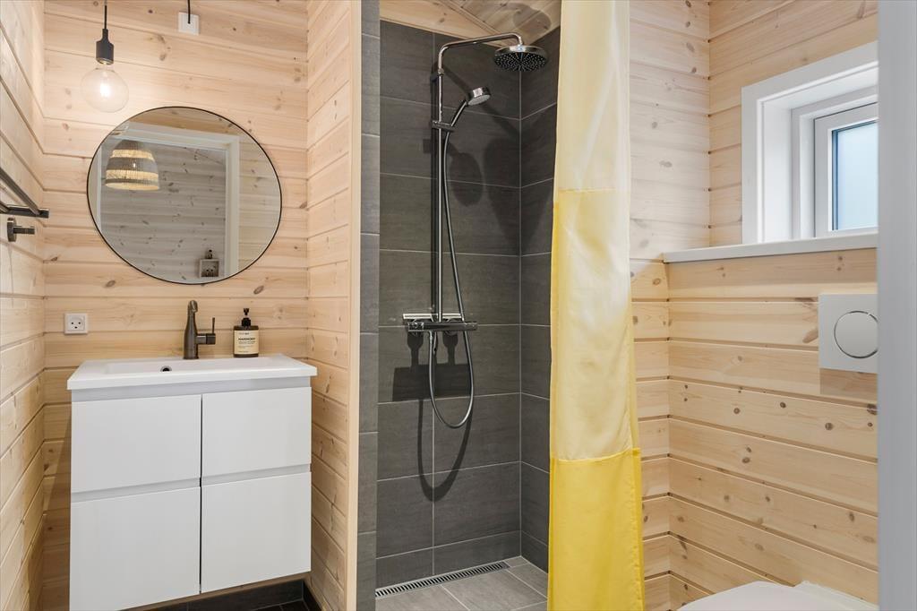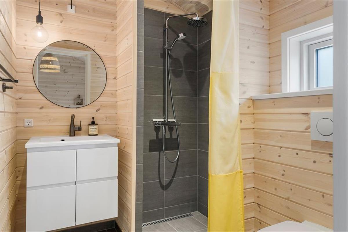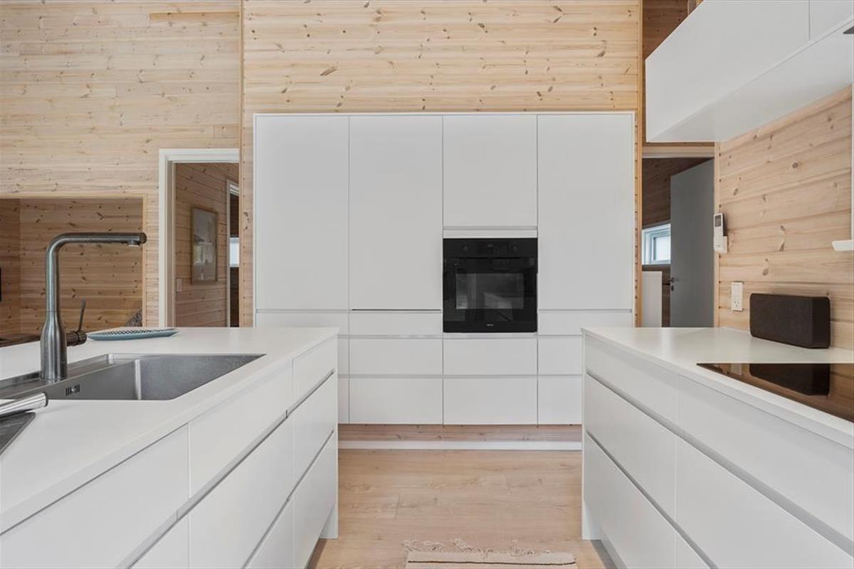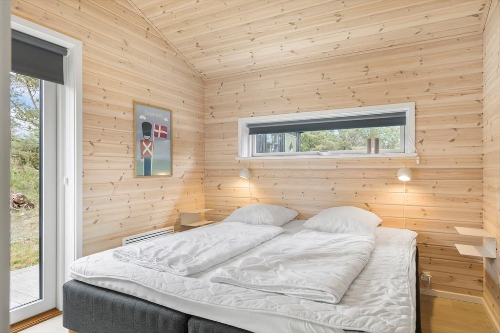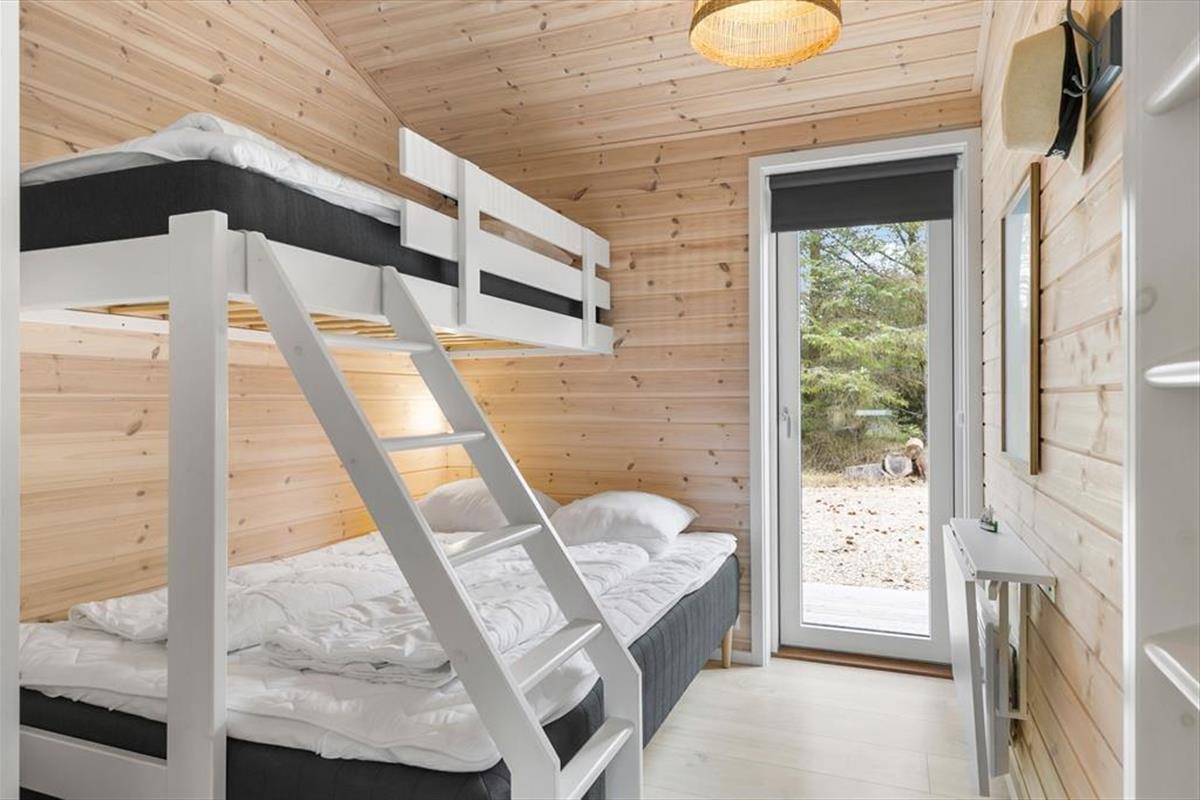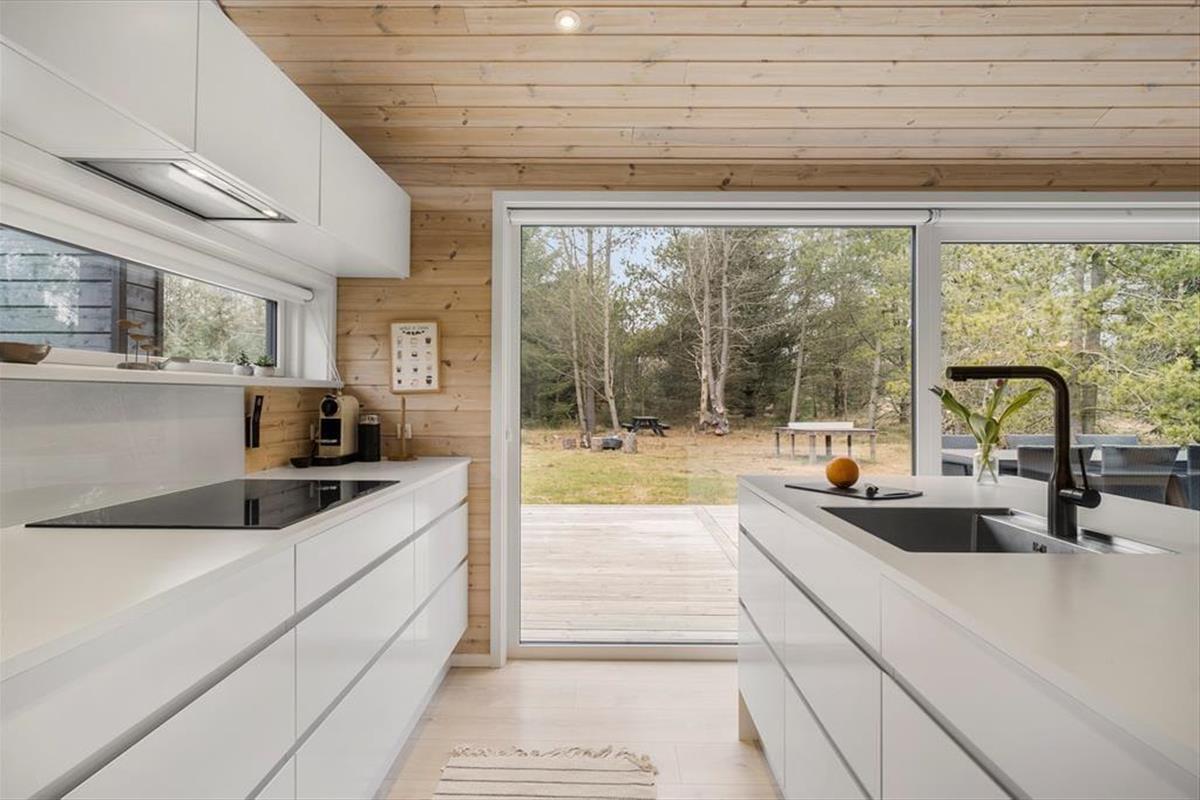 Die schwarze Holzfassade des Ferienhauses wird von großen Glasscheiben durchbrochen, die das Tageslicht ins Innere lassen und den Blick auf die schönen Bäume auf das Naturgrundstück freigeben. Es ist herrlich, hier zu sitzen und das viele Grün zu betrachten – und vielleicht kannst du auch die Vögel beobachten oder einen Fuchs vorbeiziehen sehen, während du dich auf dem Sofa entspannst oder es dir mit deiner Familie am Esstisch gemütlich machst. In den Wohnbereich ist eine schöne Küche integriert, die auch mit einem Kaminofen und einem Alkoven charmant ausgestattet ist. Letztere ist vor allem für Mittagsschläfchen und zum Lesen gedacht, denn in den drei Schlafzimmern des Hauses befinden sich sieben Betten. Wenn ihr das Haus zu mehreren bewohnt, ist es auch schön, dass es zwei Bäder im Haus gibt.