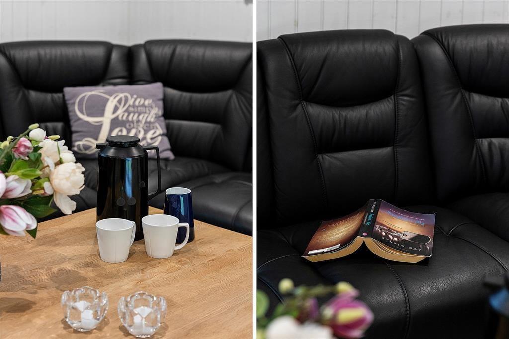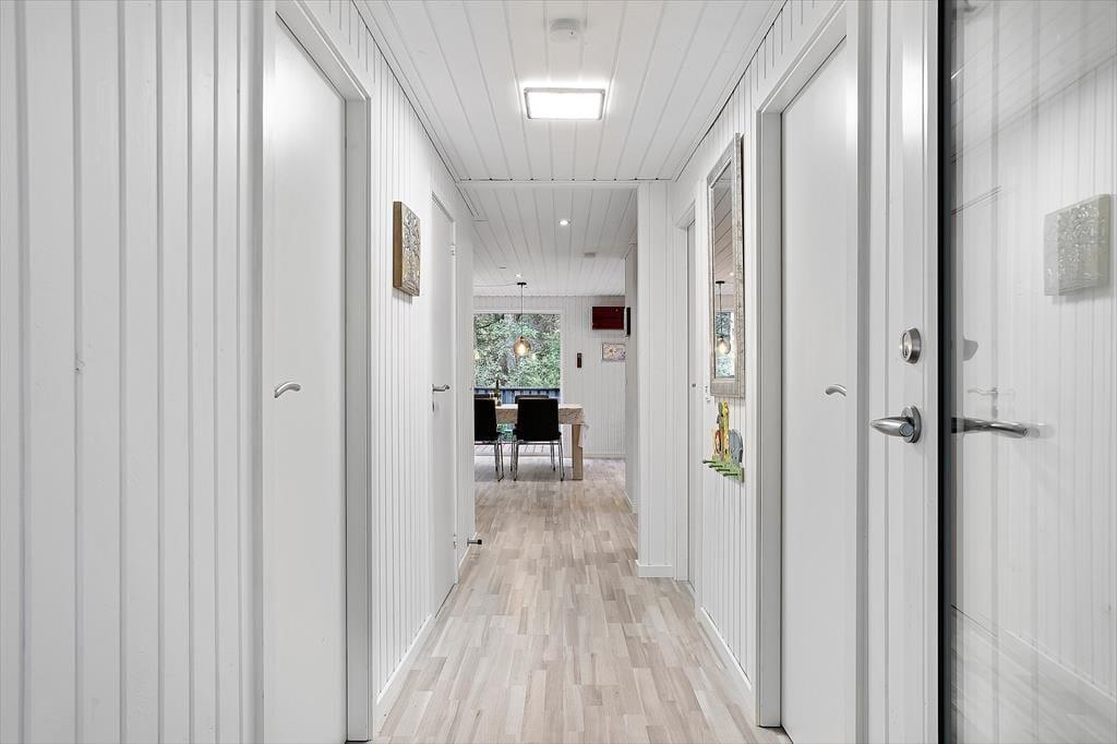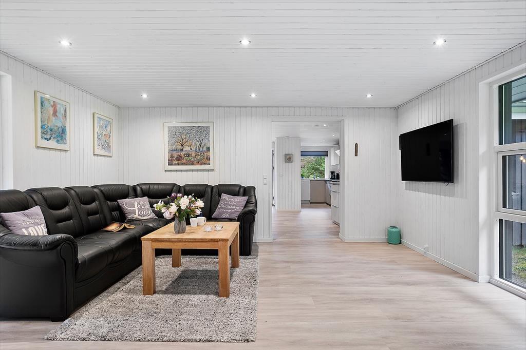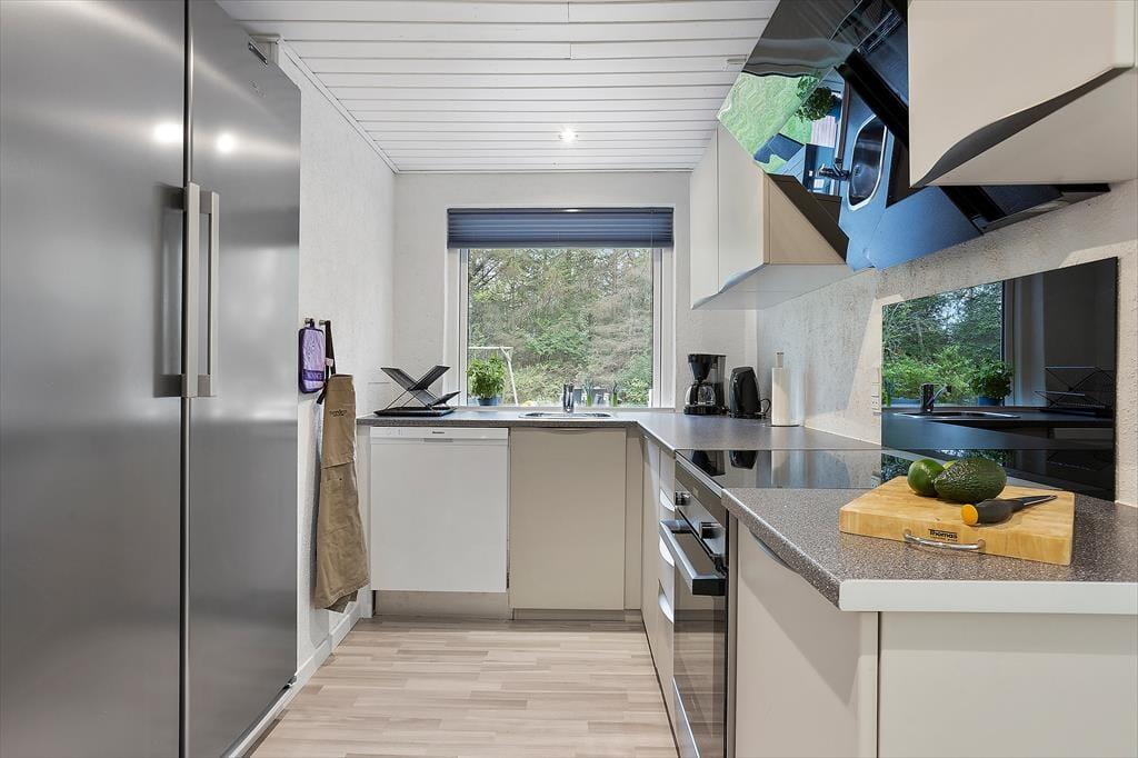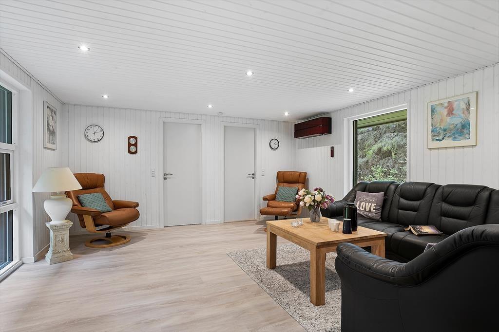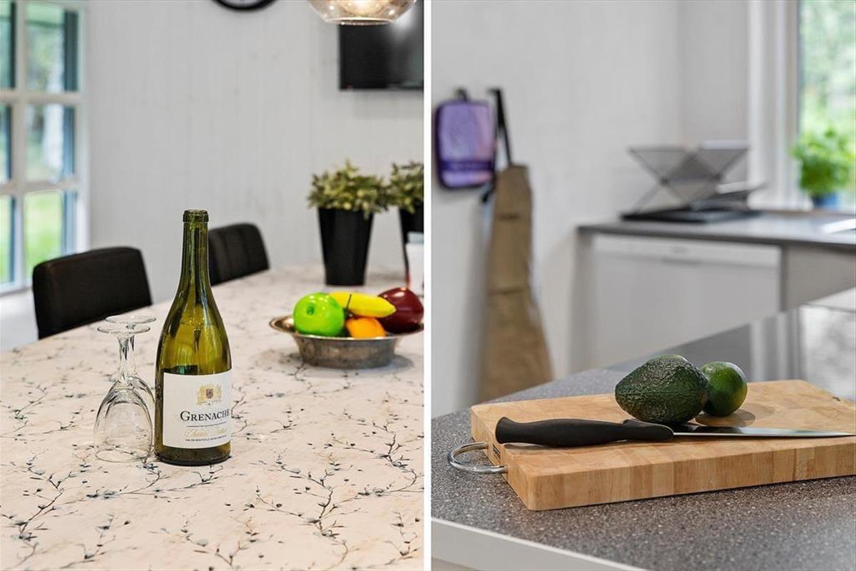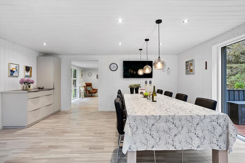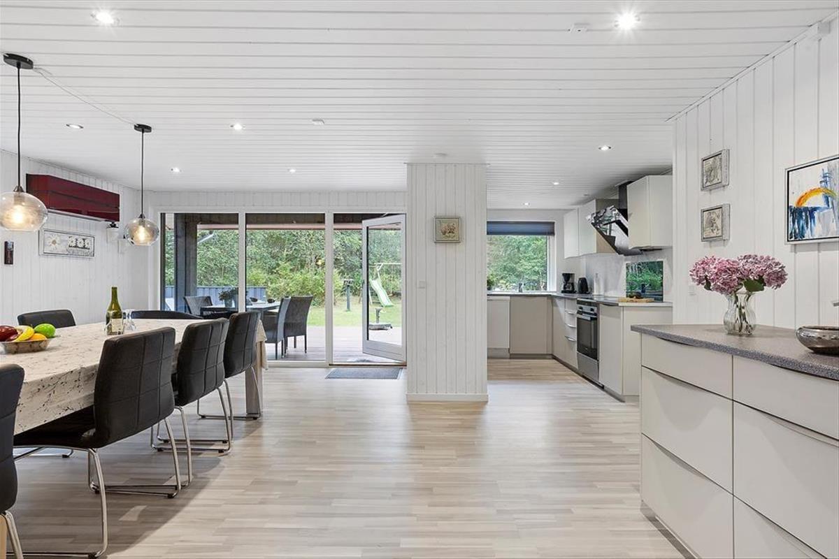 Das Ferienhaus empfängt Sie mit einer warmen und einladenden Urlaubsstimmung. Helle Räume schaffen eine angenehme Atmosphäre, in der sich die ganze Familie zu schönen Momenten versammeln kann – sei es zum gemeinsamen Entspannen oder für gemütliche Spieleabende. Das geräumige Wohnzimmer öffnet sich zur Terrasse mit großen Fenstern, die viel Tageslicht hereinlassen und ein Gefühl von Nähe zur Natur vermitteln. Die Küche ist einfach und funktional – perfekt, um leckere Urlaubsmahlzeiten zuzubereiten. Das Haus ist ideal für Hundebesitzer, da zwei Hunde erlaubt sind und sich auf dem großen, sicheren Grundstück frei bewegen können.