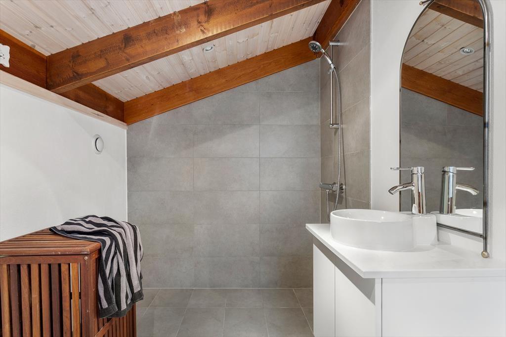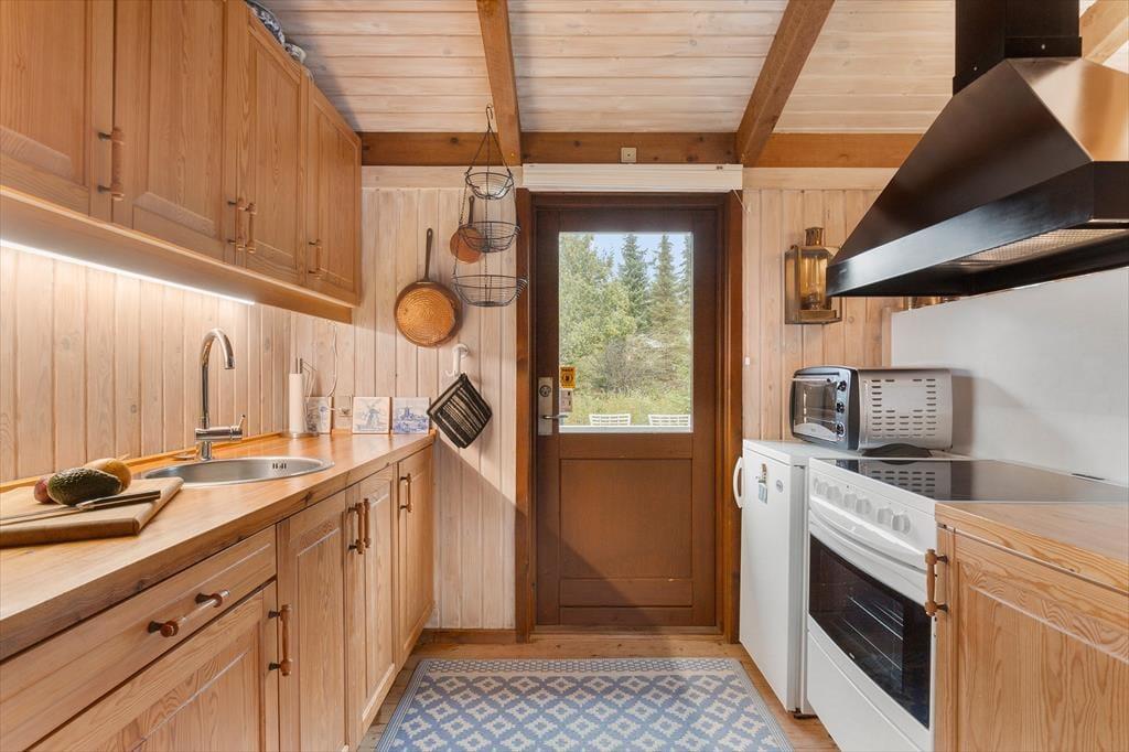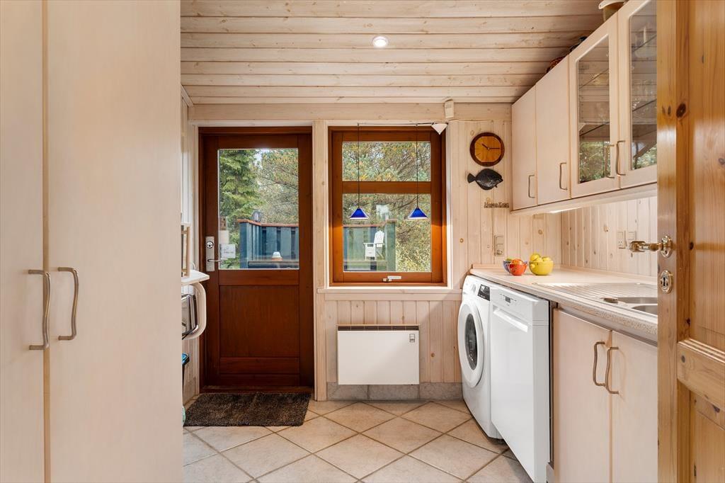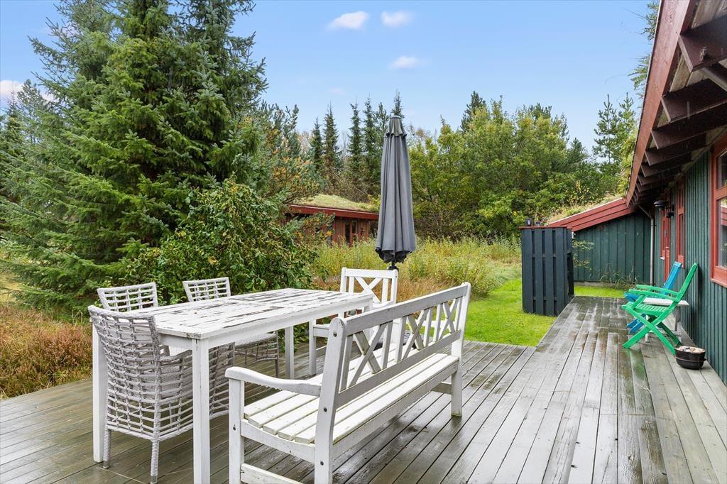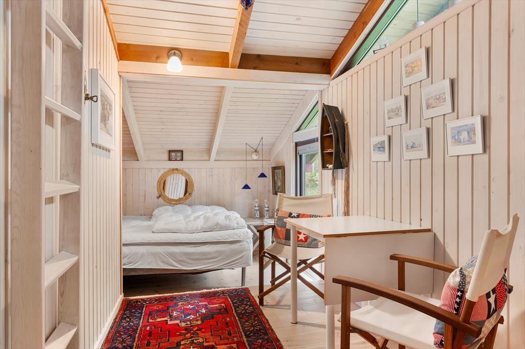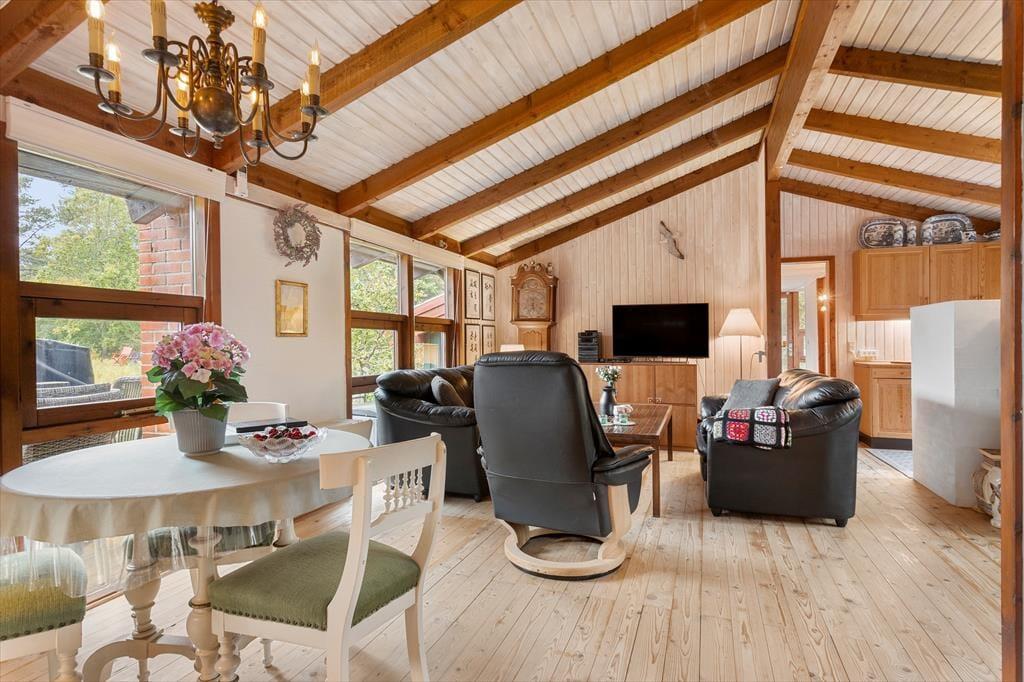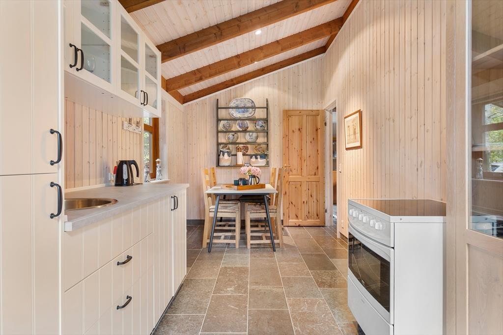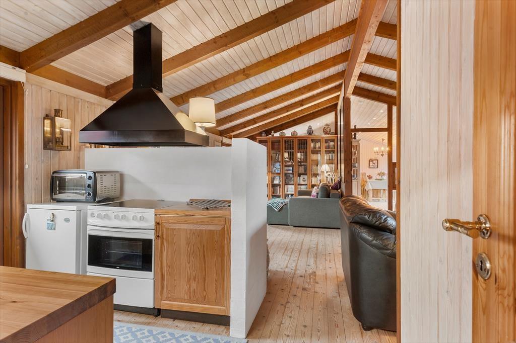 Das Ferienhaus empfängt Sie mit einer hellen und einladenden Atmosphäre, in der Gemütlichkeit und Komfort perfekt harmonieren. Die offene Küche ist direkt mit dem Wohnraum verbunden, sodass Sie beim Kochen und Essen immer miteinander plaudern können. Am Esstisch lassen sich gesellige Mahlzeiten genießen, und später lädt das Sofa vor dem Elektrokamin zu entspannten Filmabenden ein. In der Leseecke im Wohnzimmer können Sie mit einer Tasse Kaffee und einem guten Buch den Tag ausklingen lassen. Das Haus verfügt über drei schöne Schlafzimmer und zwei geräumige Badezimmer – ideal für Familien oder befreundete Paare. Zusätzlich gibt es ein großes Annex mit eigenem Bad, Teeküche, Doppelbett und gemütlichem Wohnbereich – perfekt für Teenager, Großeltern oder Gäste, die etwas mehr Privatsphäre wünschen.