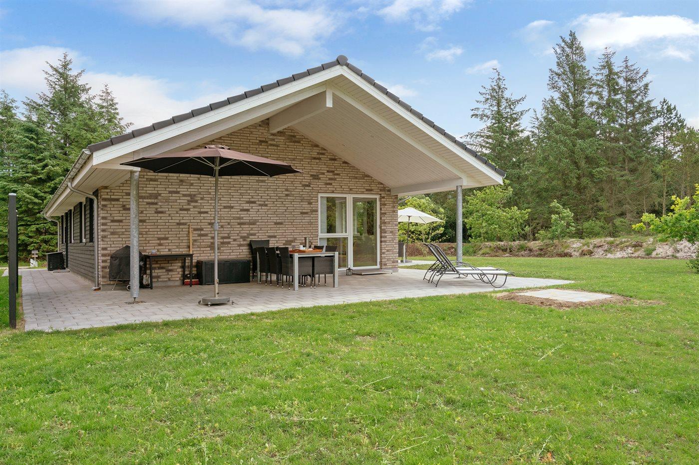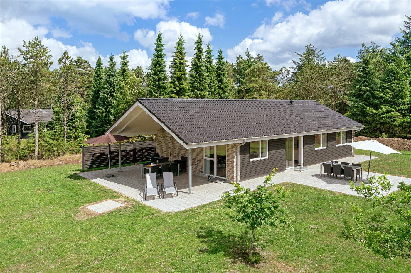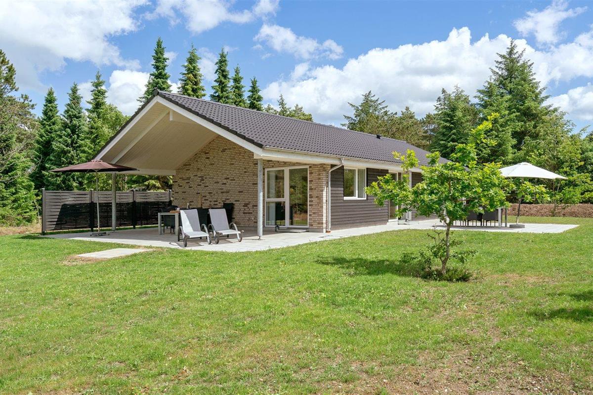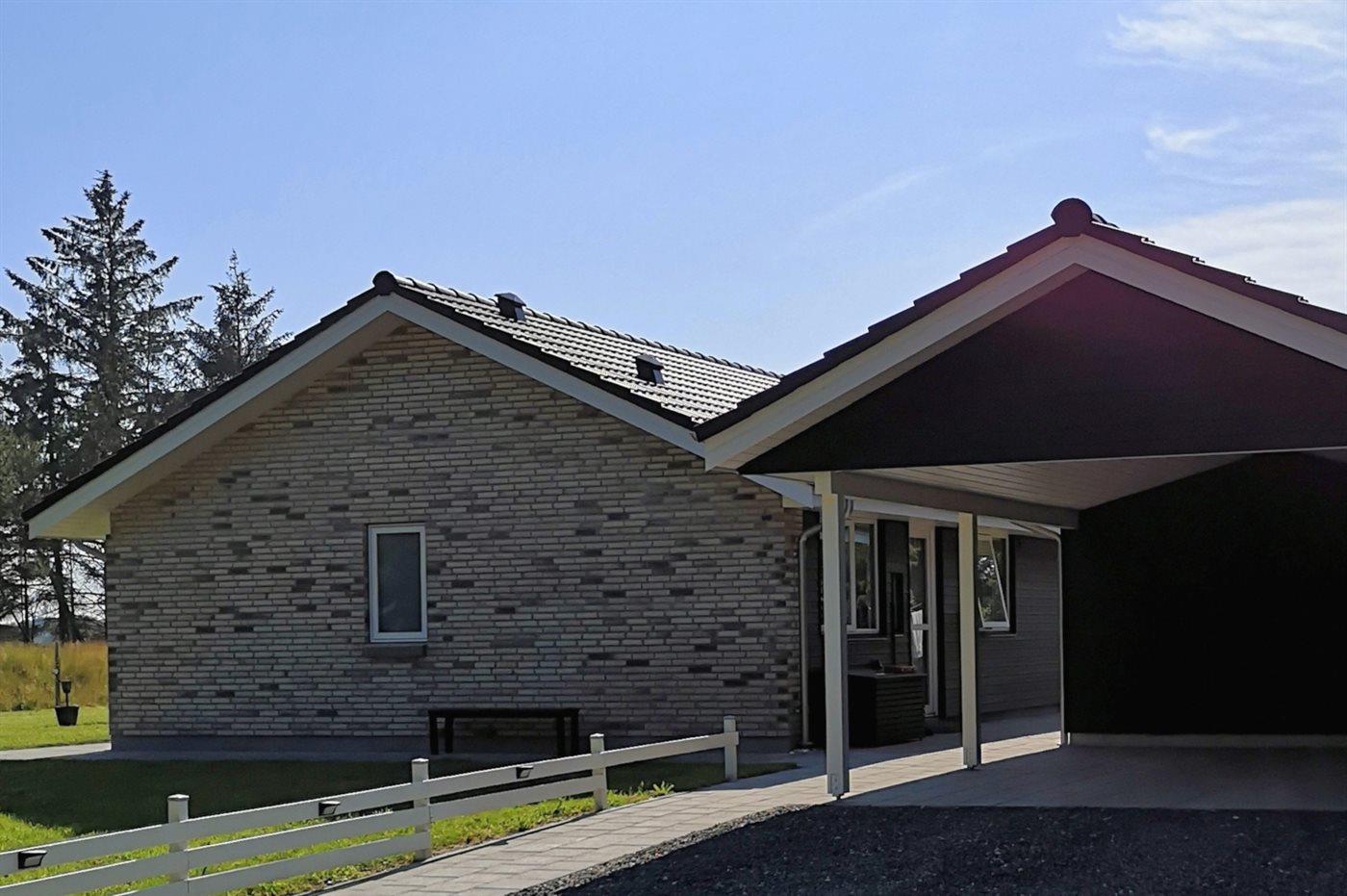 Modern vakantiehuis vlak bij zee met overdekt terras en ruime tuin in Jerup, Denemarken.