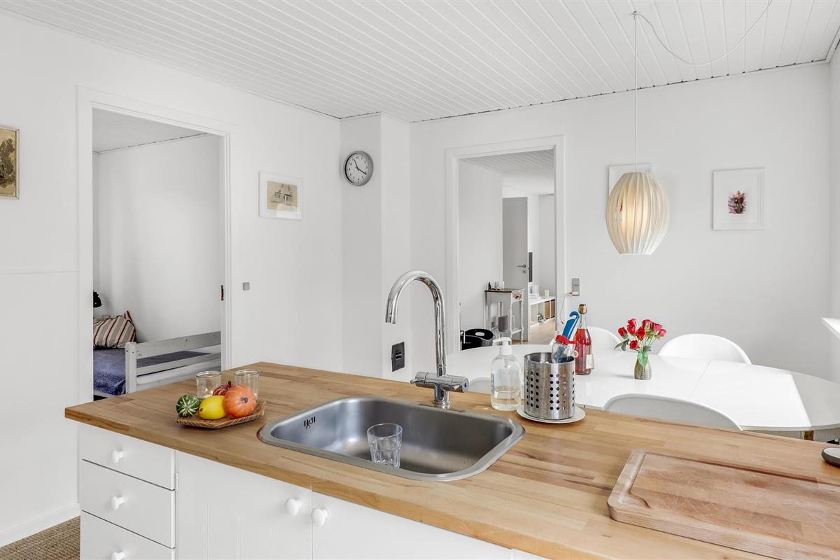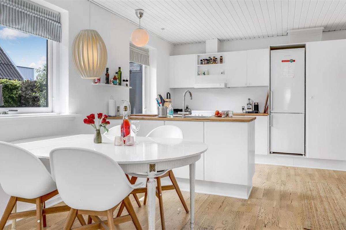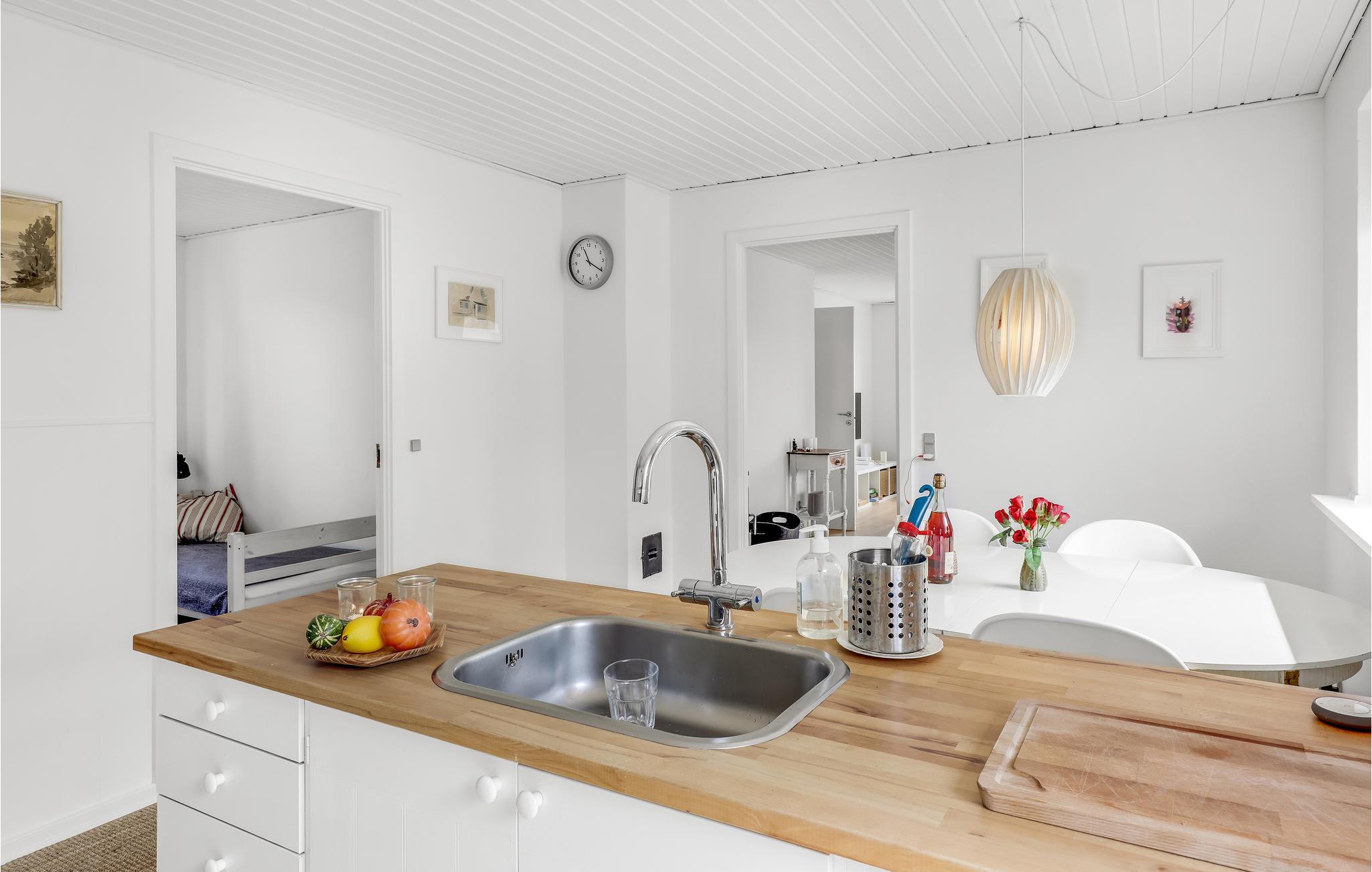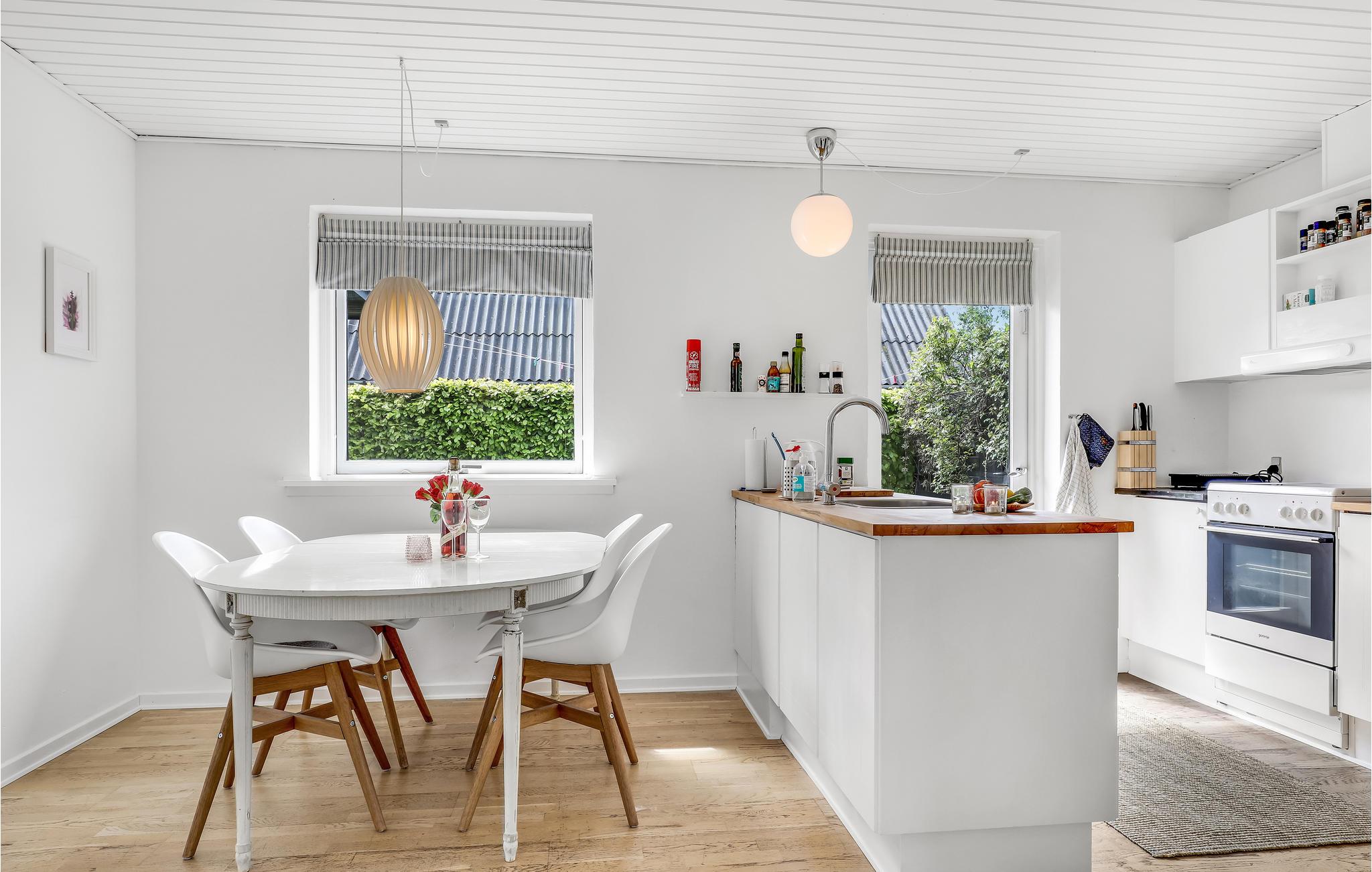 Deze villa met uitzicht op zee ligt in het kleine vissersdorp Årsdale, ca. 3 km ten zuiden van Svaneke. Het interieur van het huis is ingericht in lichte kleuren.