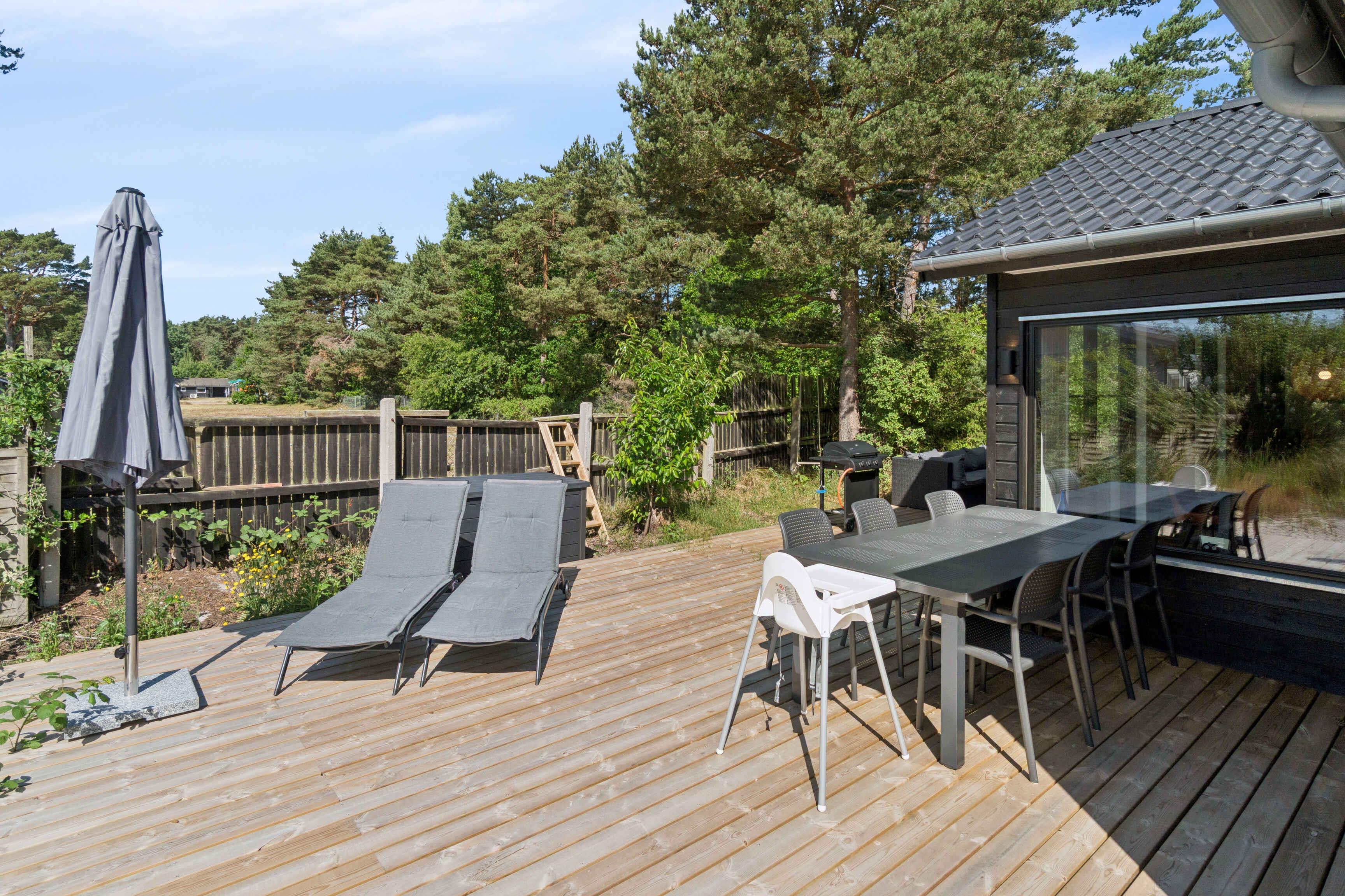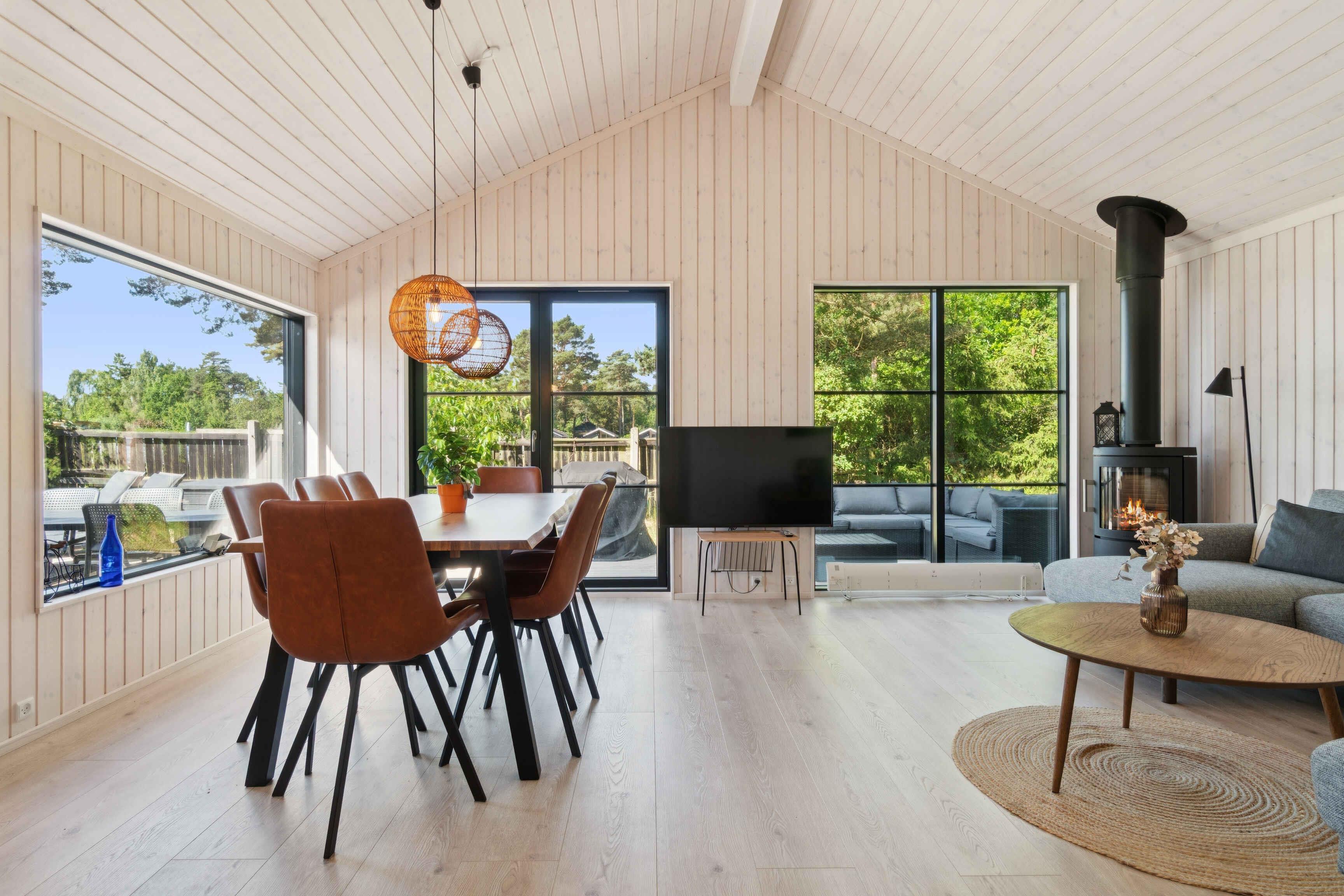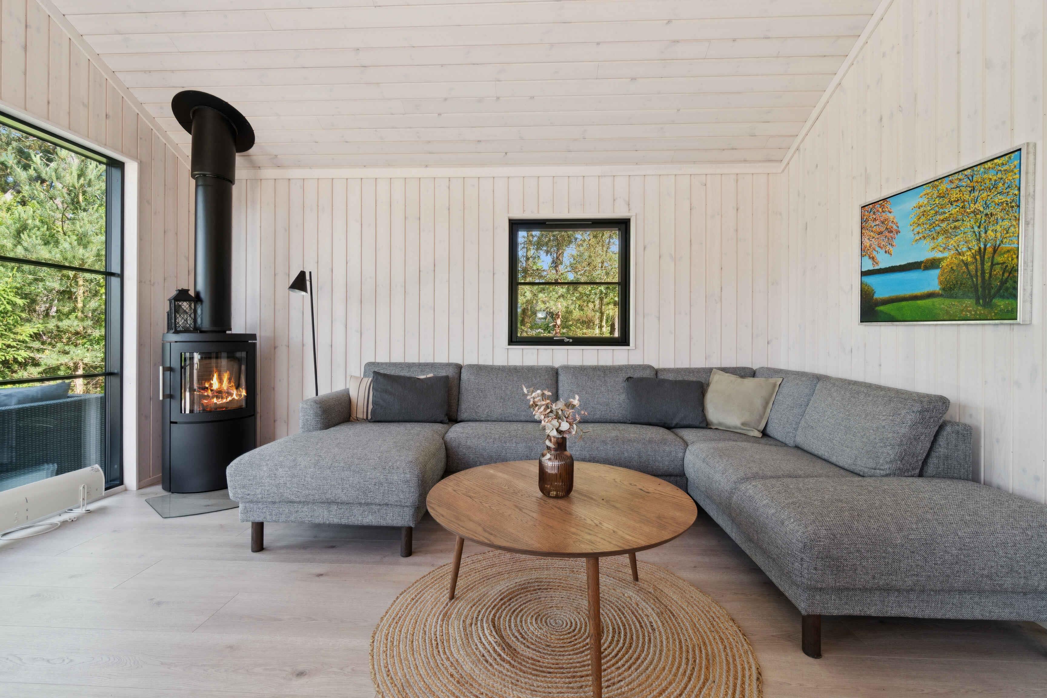 Modern vakantiehuis met groot terras en houtkachel, vlak bij het strand en natuur op Bornholm.