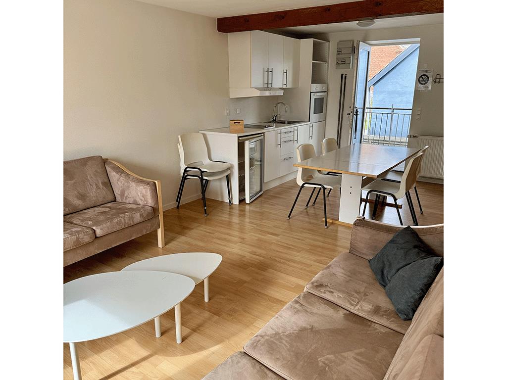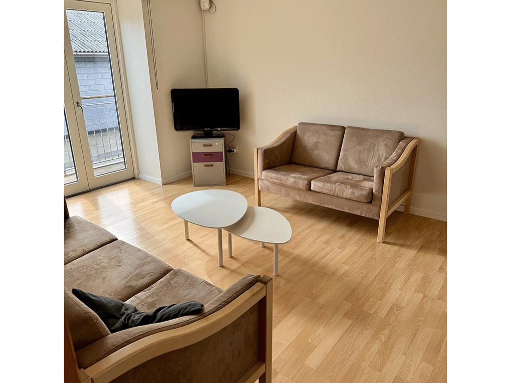 Lejlighed nr. 2 til 6 pers. Lejligheden er 30 kvm og har eget køkken og bad og indeholder derudover et soveværelse med dobbeltseng 120 cm bred, 2 køjesenge, lille hems, spisebord og sofa og tv med Cromecast.