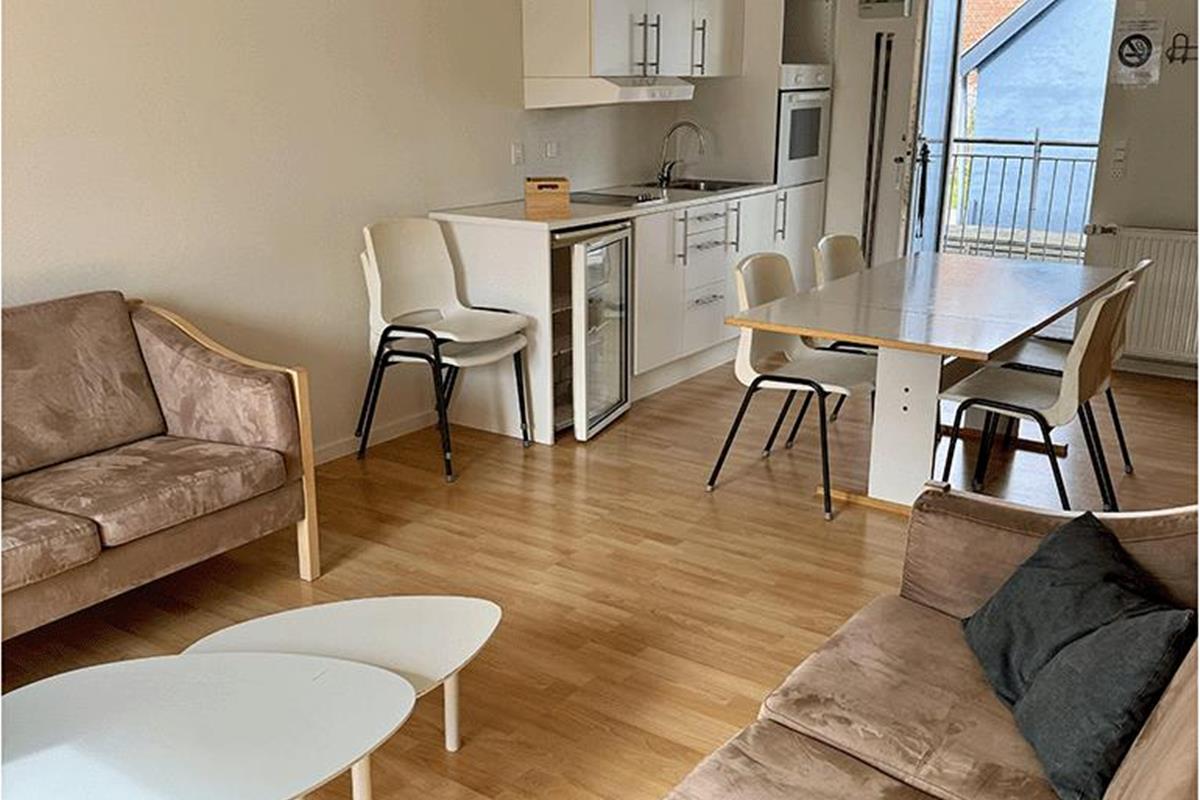 Udlevering af nøgler foregår hos købmanden som ligger lige ved siden af lejlighederne.