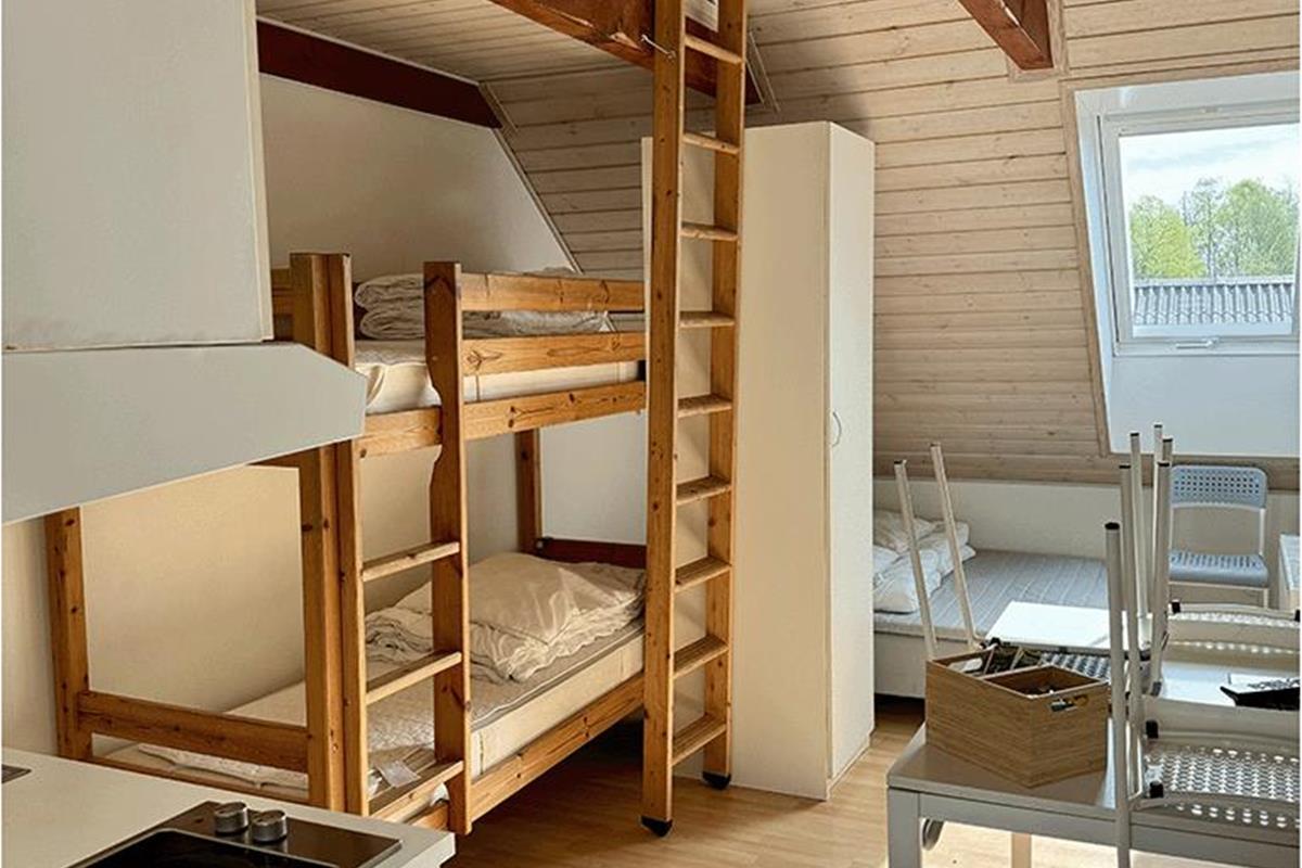 Lejlighed nr. 6 til 4 pers. Lejligheden er 15 kvm og har eget køkken og bad og indeholder derudover dobbeltseng 120 cm bred, køjeseng, lille hems, spisebord og tv med Cromecast.