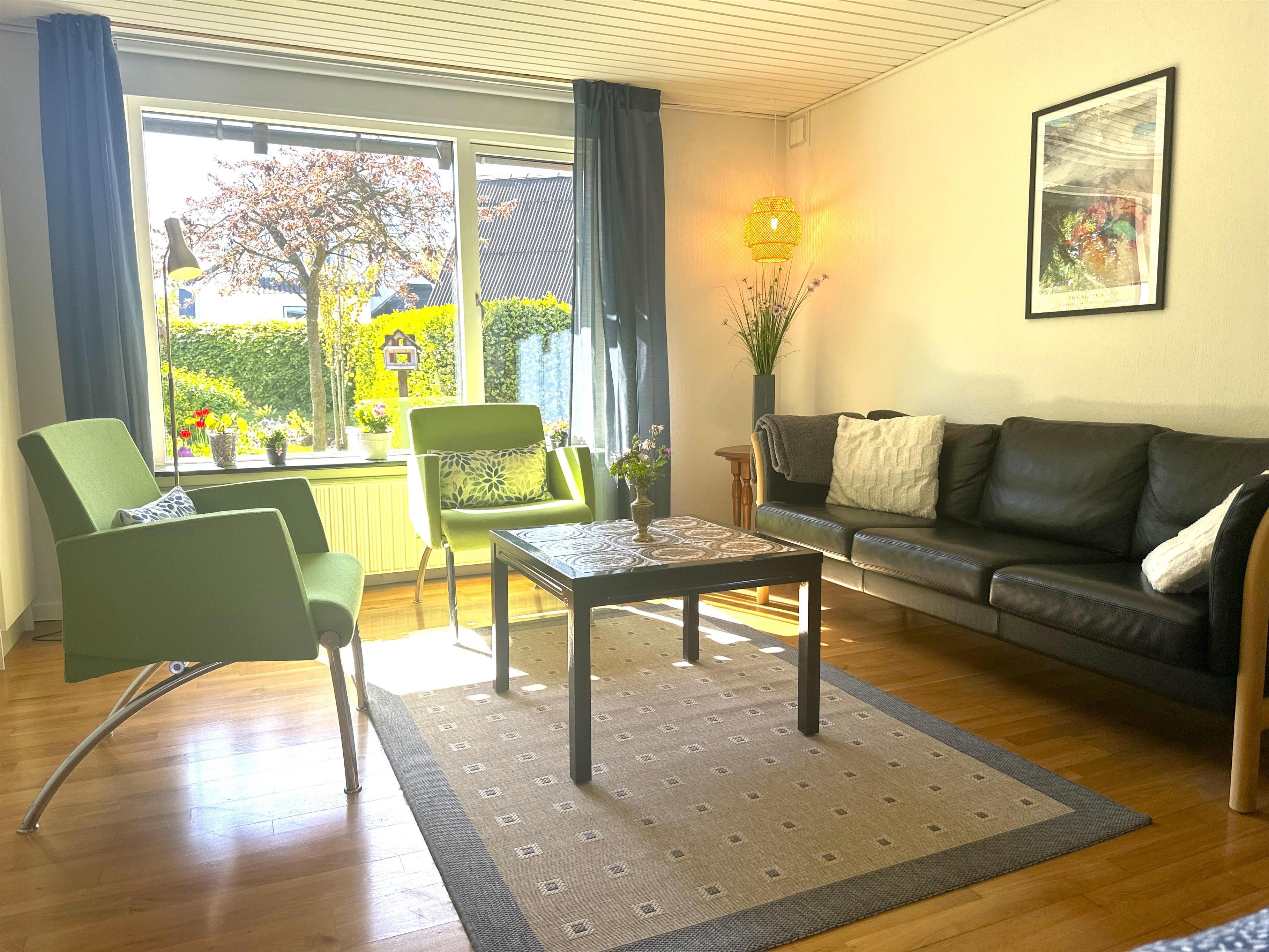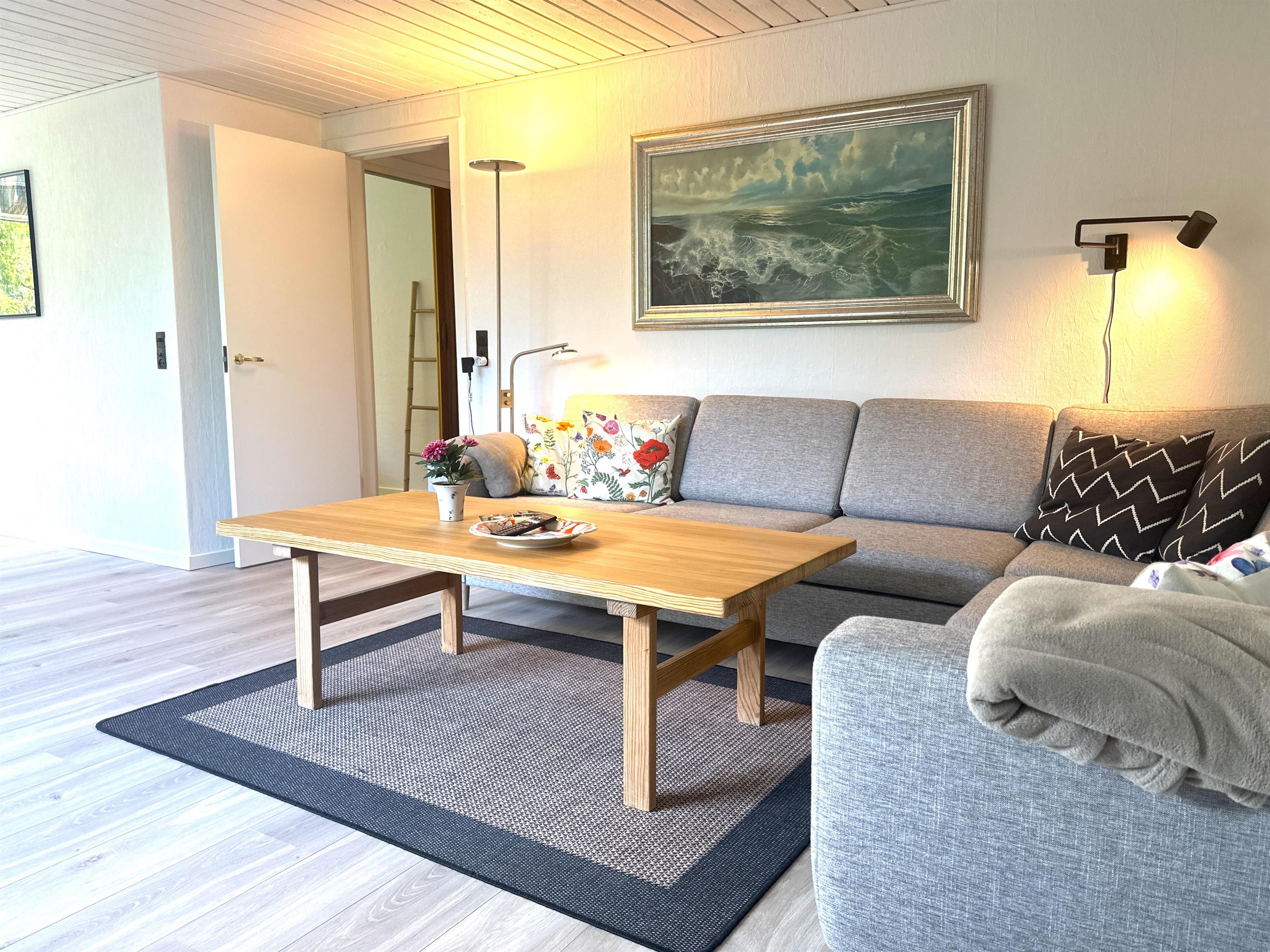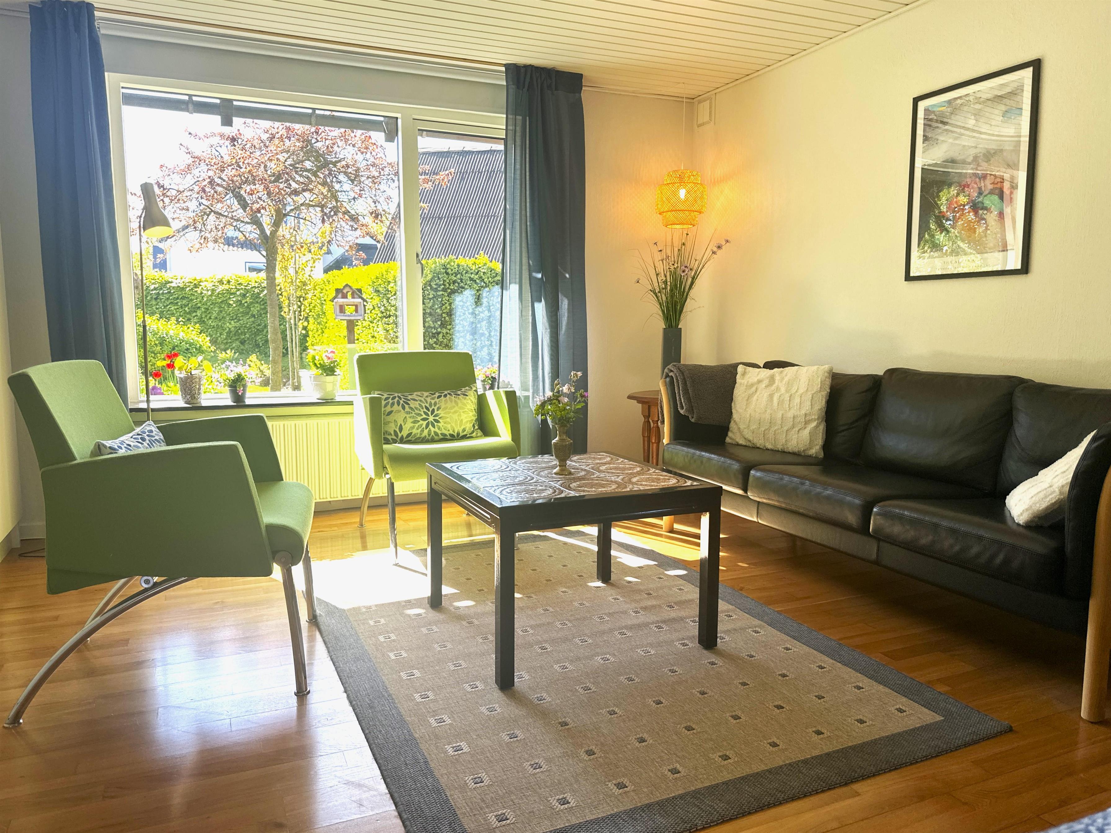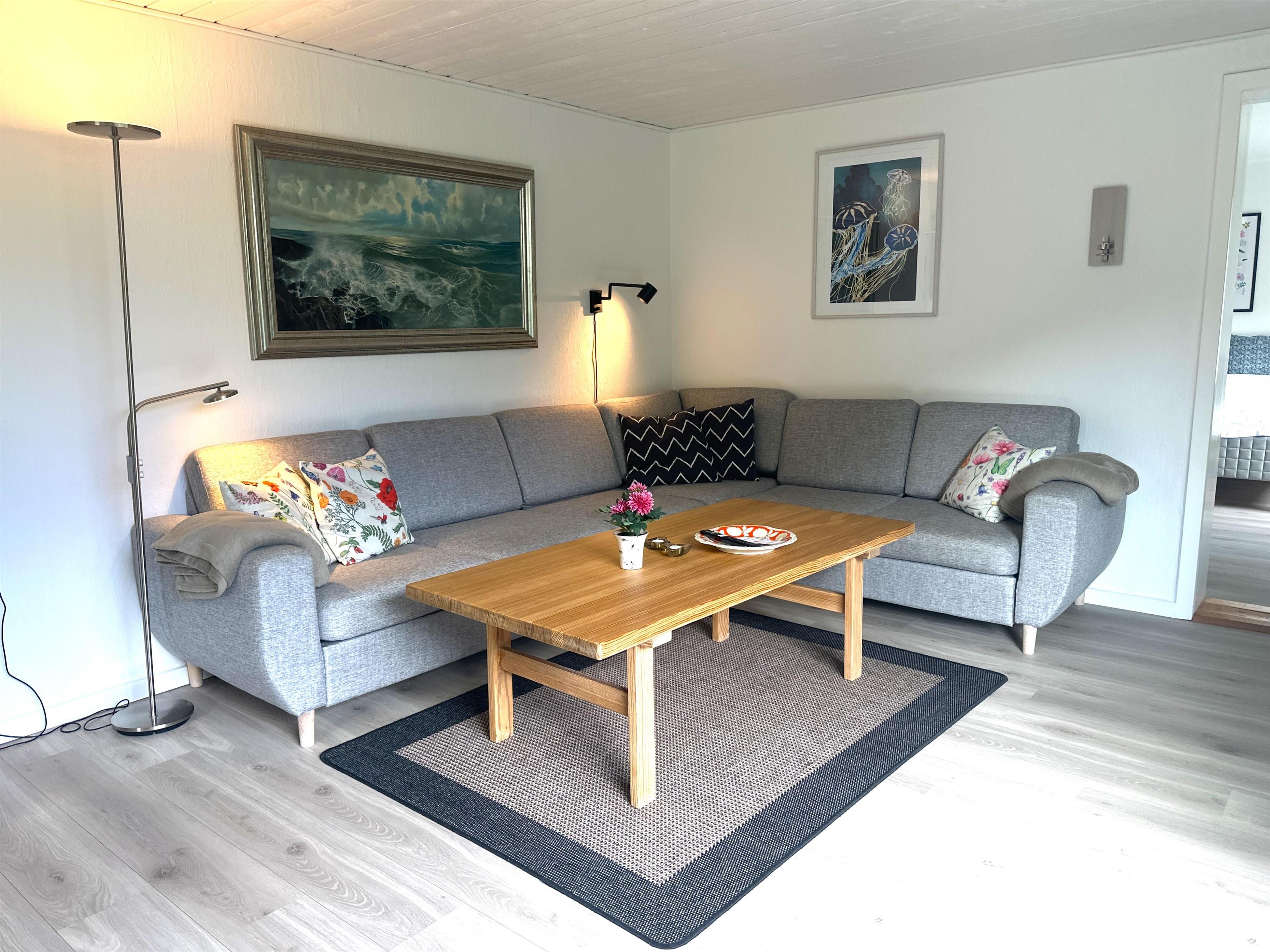 The home has been newly renovated and is bright, modern, and extremely inviting. Here you step into a beautiful living room with large windows that provide lovely natural light and create a friendly atmosphere. The living room is furnished with both a dining area and a comfortable sofa corner where you can sit back with a good book, plan your next excursion, or relax after a day on the go.