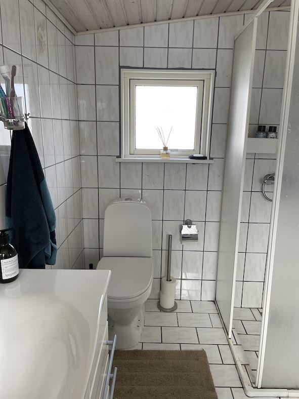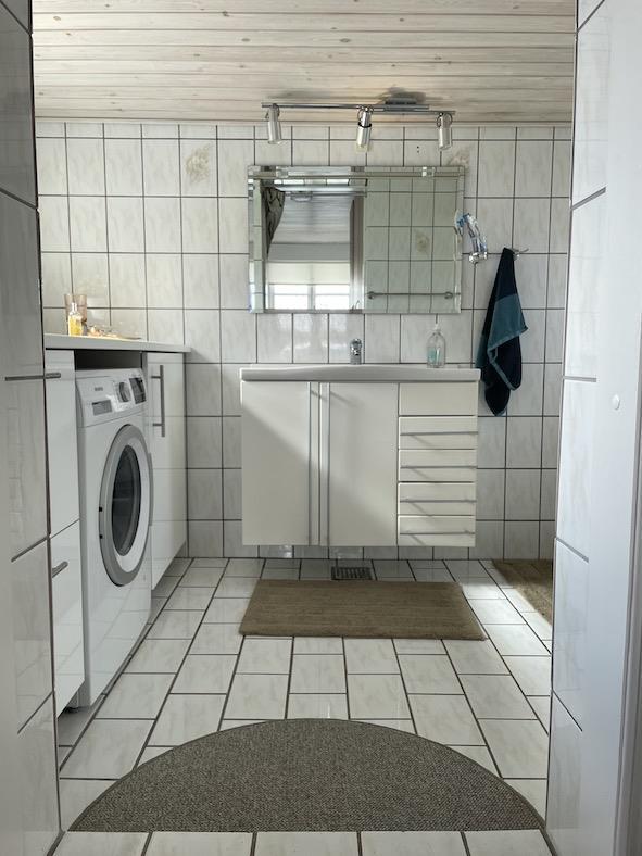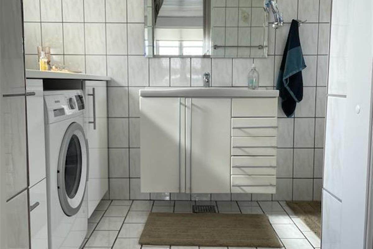Das Badezimmer ist hell und renoviert und verfügt über eine Dusche und ein WC. Es gibt eine Waschmaschine.