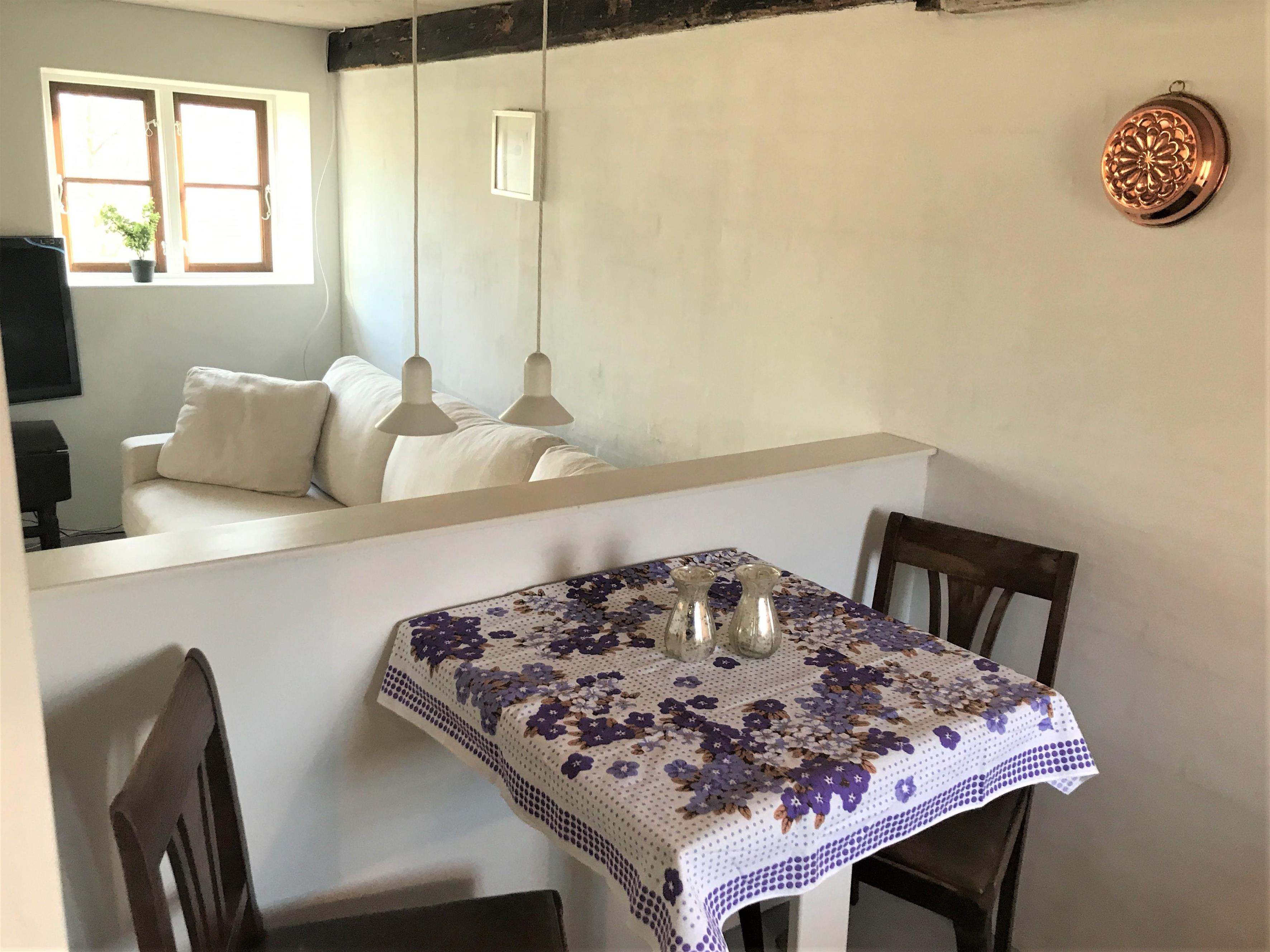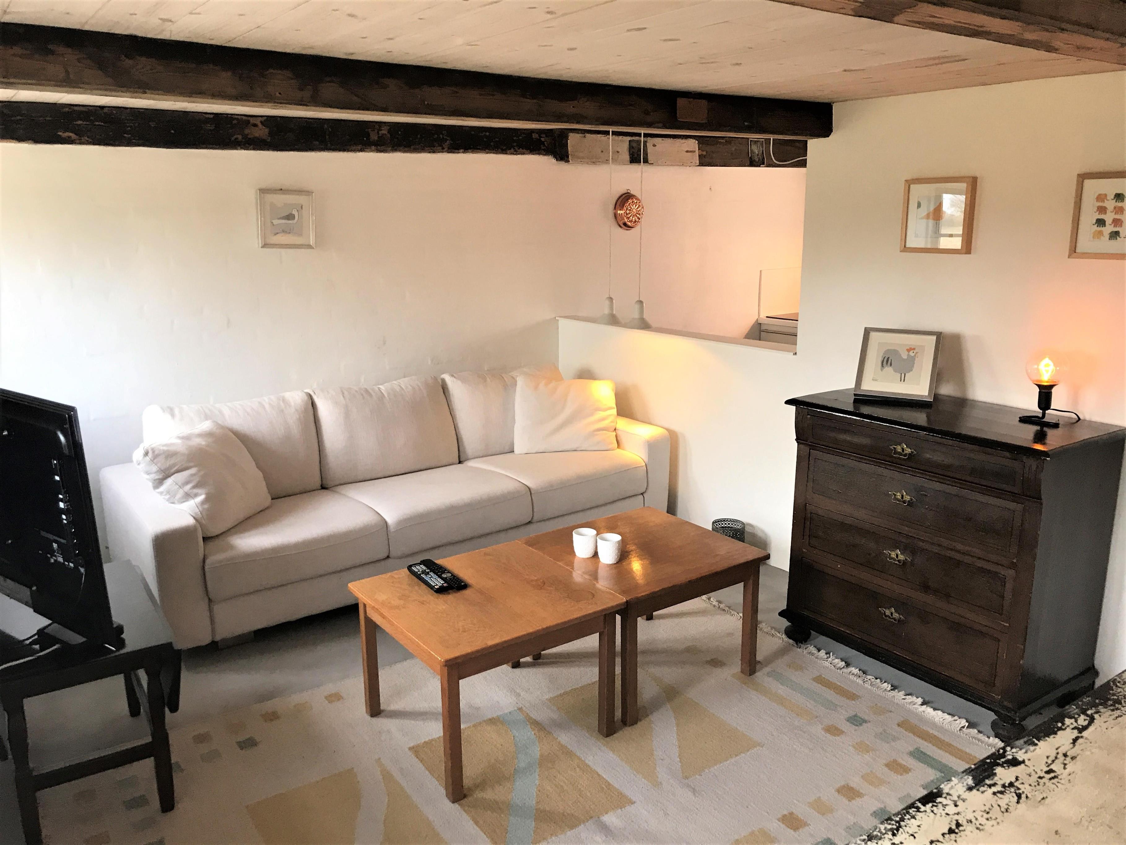 Die etwas kleinere Wohnung beinhaltet ein Aufenthaltsraum mit TV, schöne Küche mit offenem Essplatz und Wohnzimmer. Stilvolles Badezimmer mit Dusche.