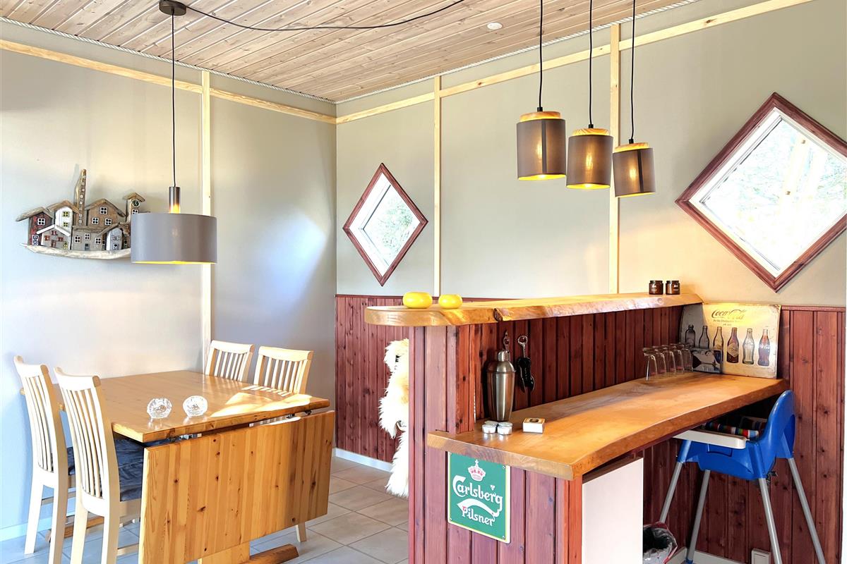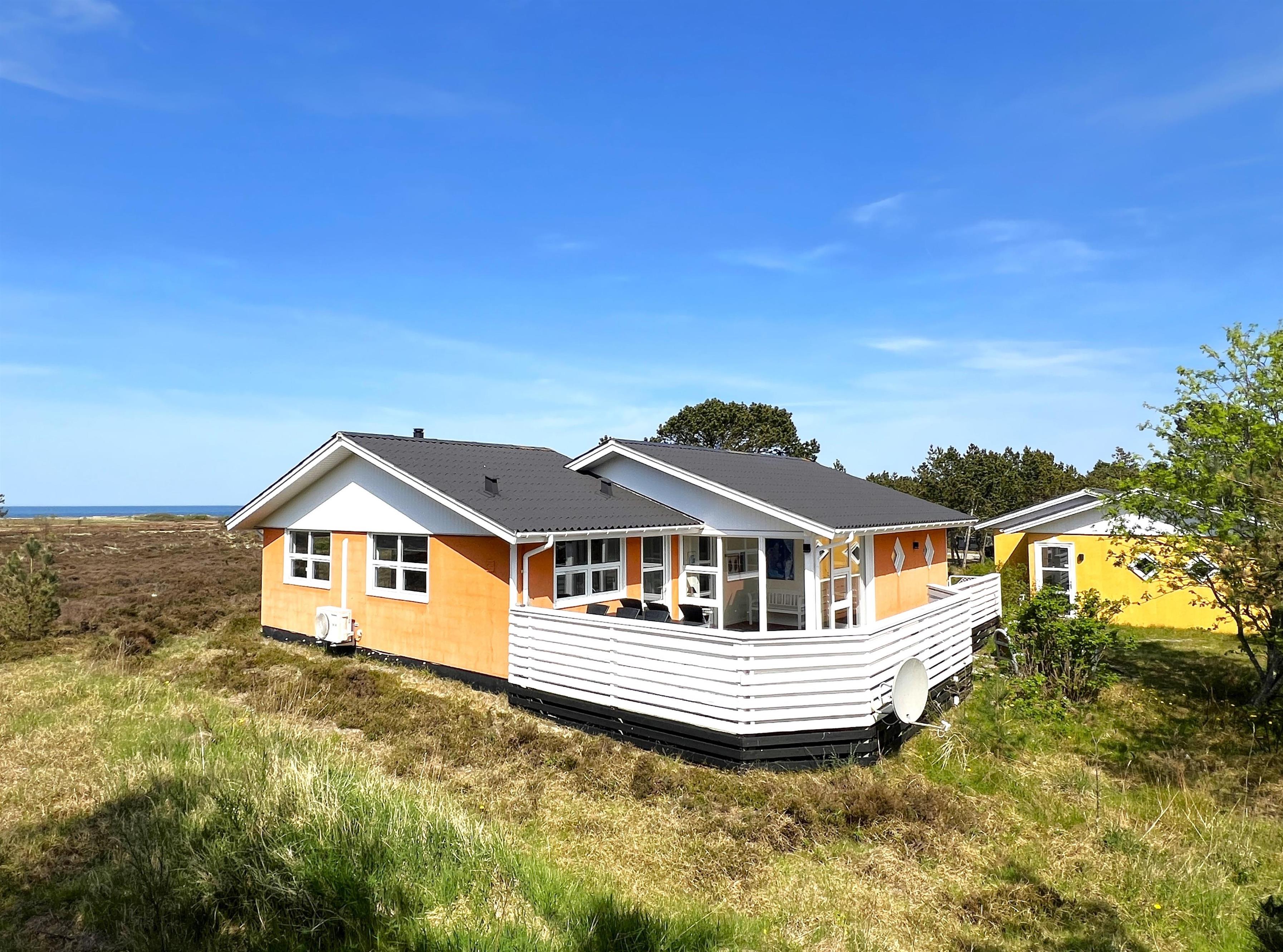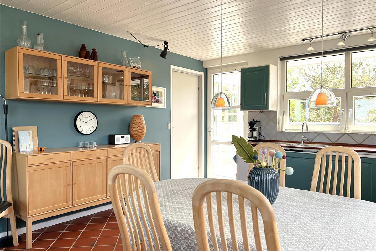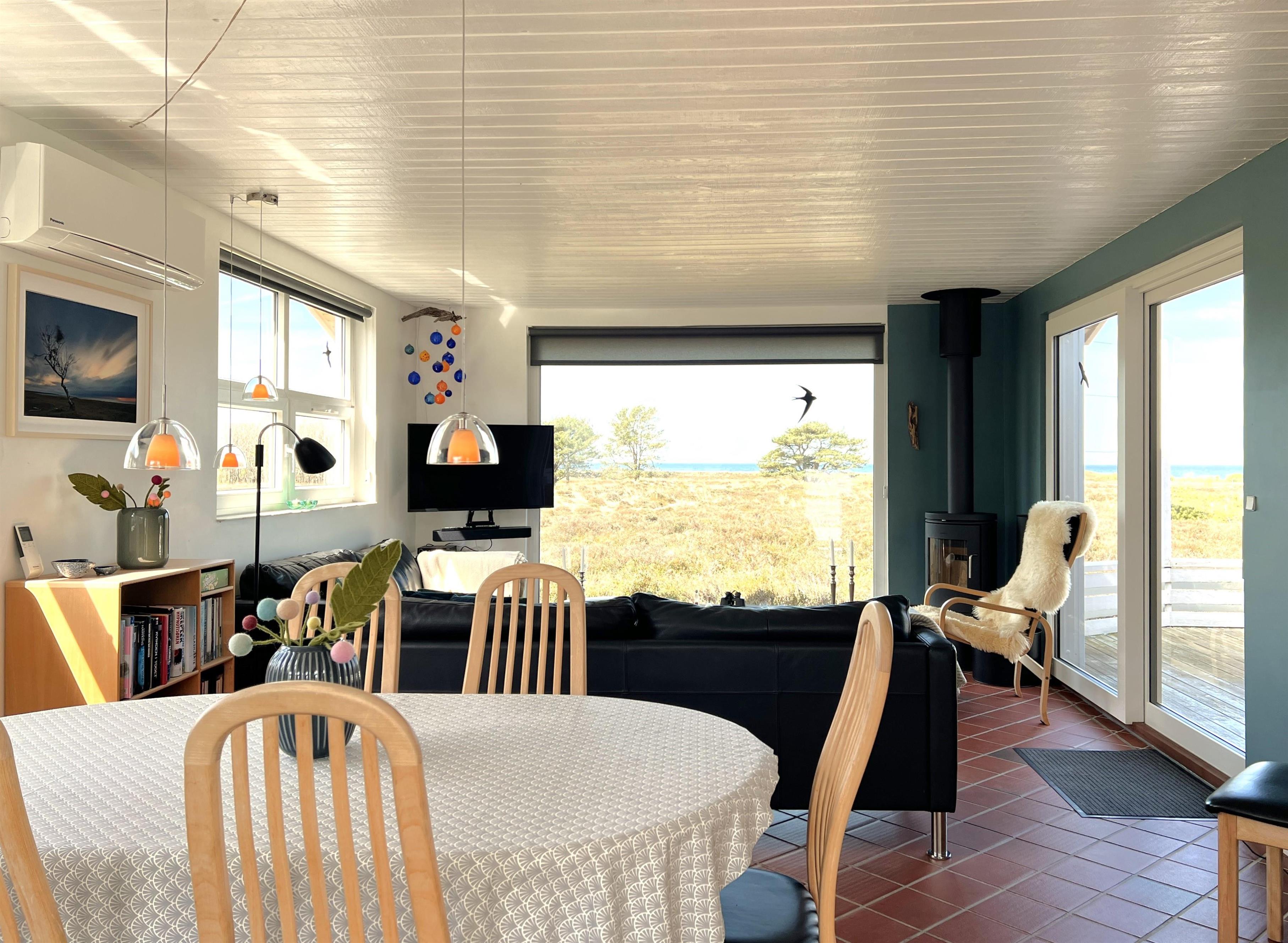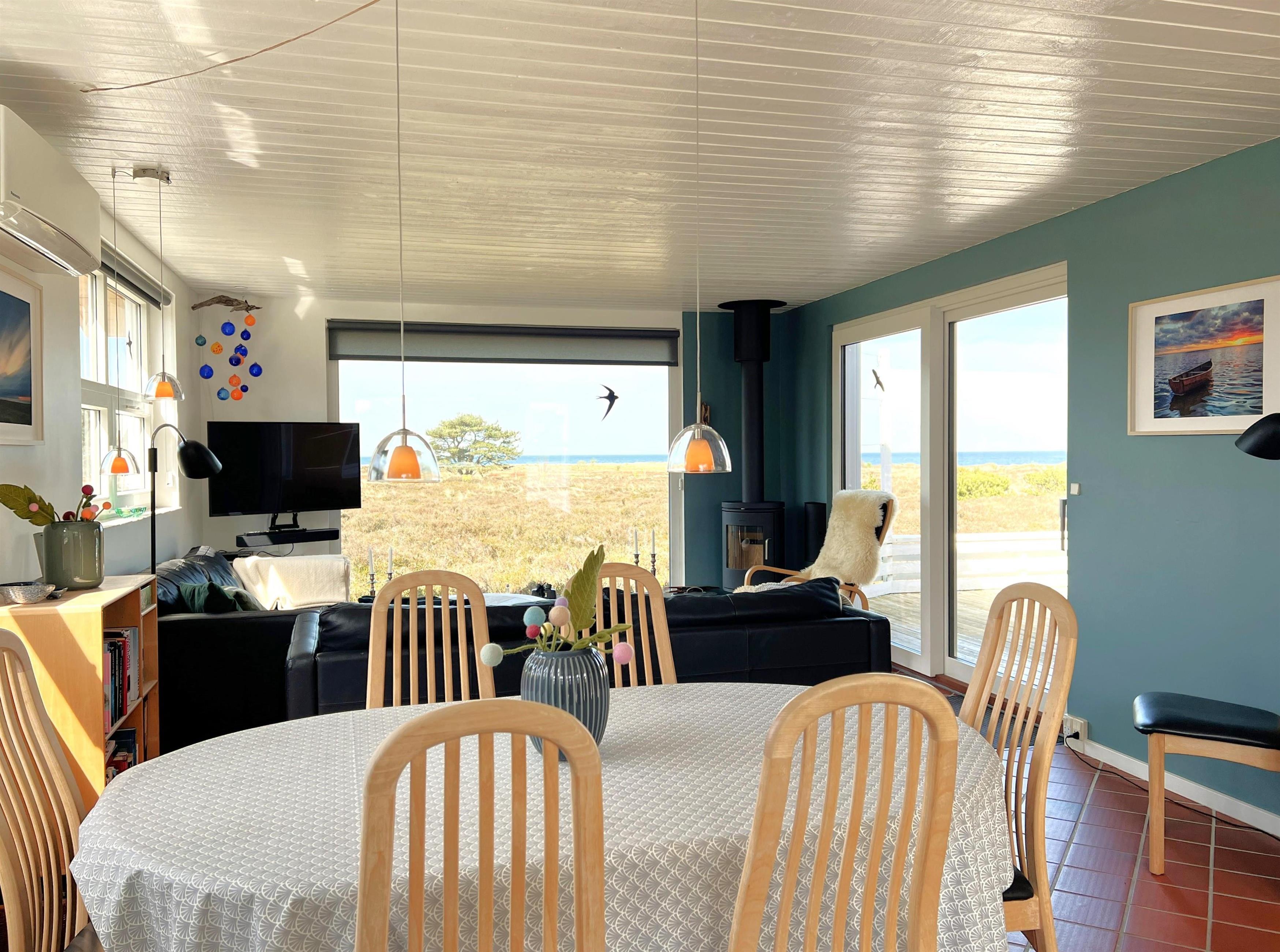 NEU beim Team Læsø. Ein traumhaft schönes, geräumiges Ferienhaus mit einer einzigartigen Lage, die man in Nordmarken kaum besser finden kann. Sowohl vom Haus als auch von den Terrassen und dem Nebengebäude aus hat man einen unglaublich schönen Panoramablick auf das Meer und die Gebäude liegen auf einem wunderschönen, unberührten Naturgrundstück, auf dem die Heide dominiert. Der Abstand zwischen dem Haupthaus und dem Nebengebäude ist relativ kurz und Sie können problemlos zwischen den beiden Wohnungen wechseln. Das Haupthaus wirkt hell und einladend und die großen Fenster sorgen für viel Licht. Schöne und gut ausgestattete Küche in offener Verbindung zum Esszimmer. Das Haus verfügt über ein schönes Wohnzimmer mit bequemen Möbeln, Holzofen und Fernseher sowie Zugang zu einer teilweise überdachten Holzterrasse. Es gibt zwei große Schlafzimmer mit Doppelbetten, eines davon mit Meerblick und Zugang zu einer Terrasse. Das Badezimmer mit Sauna und Dusche wirkt praktisch, schön und einladend. Der 50 m2 große Anbau bietet wie das Haupthaus viel Licht und Meerblick und verfügt über ein weiteres großes Schlafzimmer mit einem Doppelbett und einem Kinderbett. Darüber hinaus ein schöner Aktivitätsraum mit mehreren verschiedenen Spielen - Tischfußball, Darts, Bobfahren, Tischstockschießen usw. Karten-/Brettspiele und Bücher und eine wirklich gemütliche Bar, in der Jung und Alt ihren Durst stillen können. Das Haus verfügt über ein starkes Glasfasernetz und ist insgesamt sehr gut ausgestattet. Rund um das Haus stehen Ihnen mehrere schöne Liegeflächen und Terrassen mit Gartenmöbeln und Sonnenliegen zur Verfügung. Hier kann auch der Grill des Hauses genutzt werden, während man den wunderschönen Sonnenuntergang über dem Meer genießt. Zusammen mit der Aussicht, dem wunderschönen Naturgrundstück und der ruhigen Lage spüren Sie das besondere Læsøro.