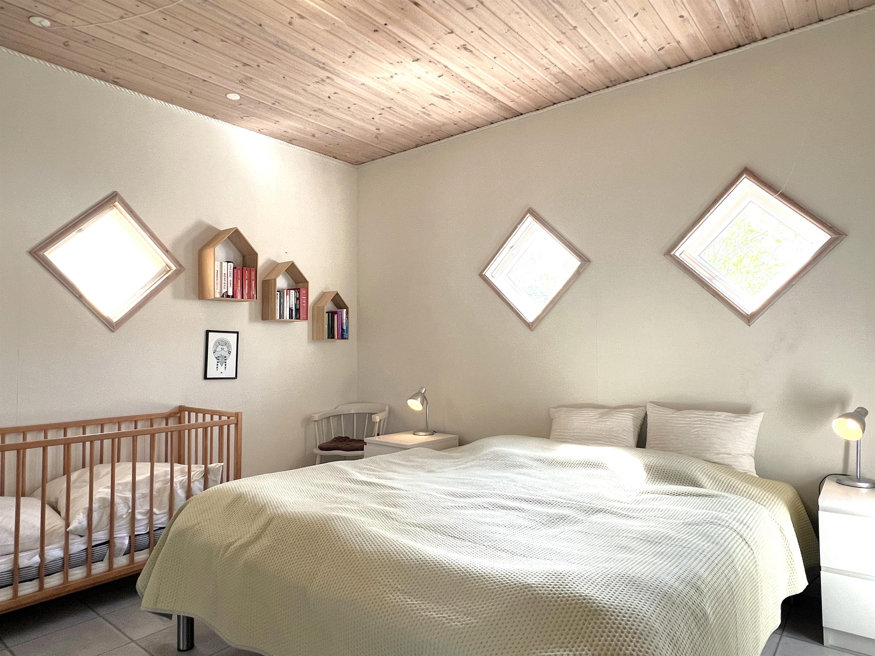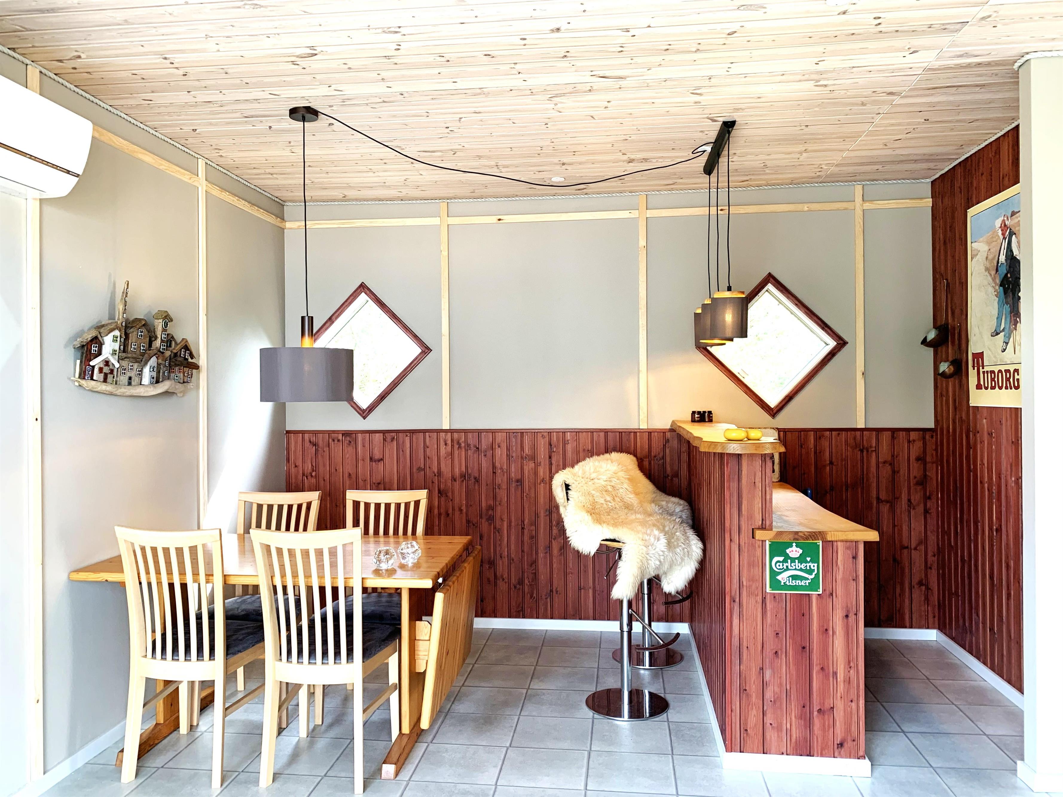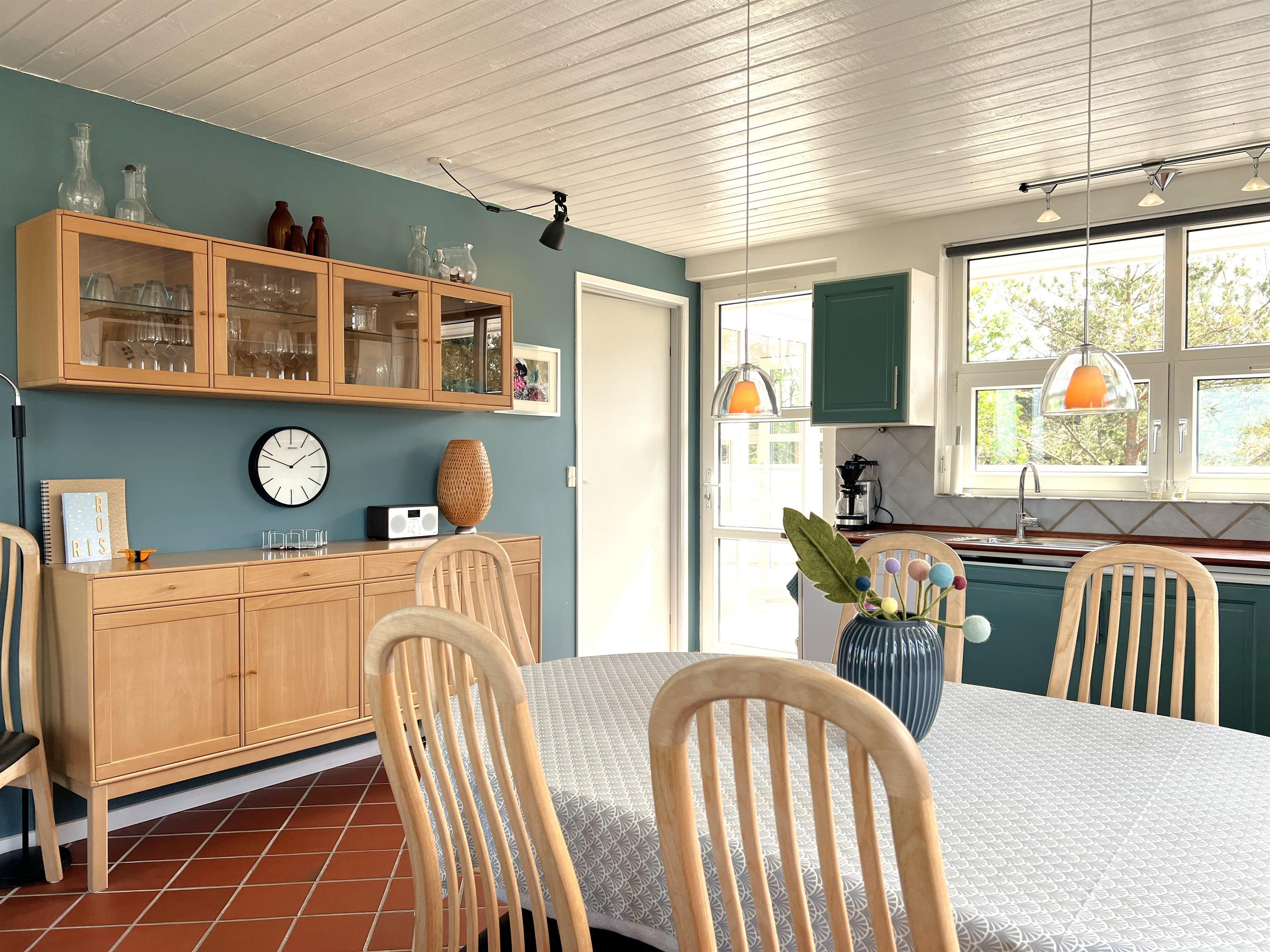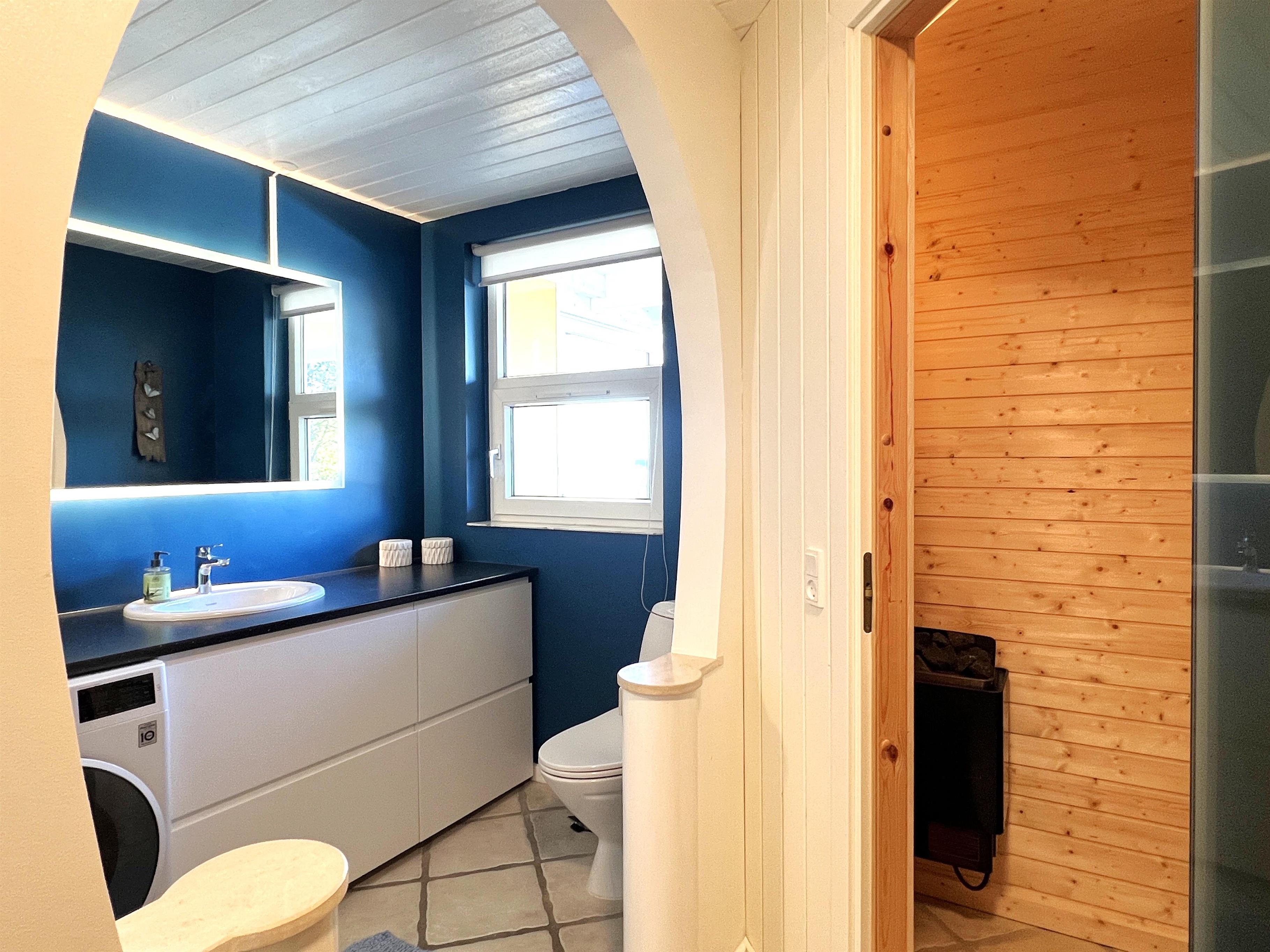 NEU beim Team Læsø. Ein traumhaft schönes, geräumiges Ferienhaus mit einer einzigartigen Lage, die man in Nordmarken kaum besser finden kann. Sowohl vom Haus als auch von den Terrassen und dem Nebengebäude aus hat man einen unglaublich schönen Panoramablick auf das Meer und die Gebäude liegen auf einem wunderschönen, unberührten Naturgrundstück, auf dem die Heide dominiert. Der Abstand zwischen dem Haupthaus und dem Nebengebäude ist relativ kurz und Sie können problemlos zwischen den beiden Wohnungen wechseln. Das Haupthaus wirkt hell und einladend und die großen Fenster sorgen für viel Licht. Schöne und gut ausgestattete Küche in offener Verbindung zum Esszimmer. Das Haus verfügt über ein schönes Wohnzimmer mit bequemen Möbeln, Holzofen und Fernseher sowie Zugang zu einer teilweise überdachten Holzterrasse. Es gibt zwei große Schlafzimmer mit Doppelbetten, eines davon mit Meerblick und Zugang zu einer Terrasse. Das Badezimmer mit Sauna und Dusche wirkt praktisch, schön und einladend. Der 50 m2 große Anbau bietet wie das Haupthaus viel Licht und Meerblick und verfügt über ein weiteres großes Schlafzimmer mit einem Doppelbett und einem Kinderbett. Darüber hinaus ein schöner Aktivitätsraum mit mehreren verschiedenen Spielen - Tischfußball, Darts, Bobfahren, Tischstockschießen usw. Karten-/Brettspiele und Bücher und eine wirklich gemütliche Bar, in der Jung und Alt ihren Durst stillen können. Das Haus verfügt über ein starkes Glasfasernetz und ist insgesamt sehr gut ausgestattet. Rund um das Haus stehen Ihnen mehrere schöne Liegeflächen und Terrassen mit Gartenmöbeln und Sonnenliegen zur Verfügung. Hier kann auch der Grill des Hauses genutzt werden, während man den wunderschönen Sonnenuntergang über dem Meer genießt. Zusammen mit der Aussicht, dem wunderschönen Naturgrundstück und der ruhigen Lage spüren Sie das besondere Læsøro.