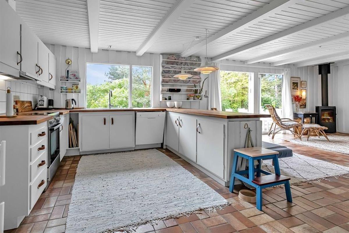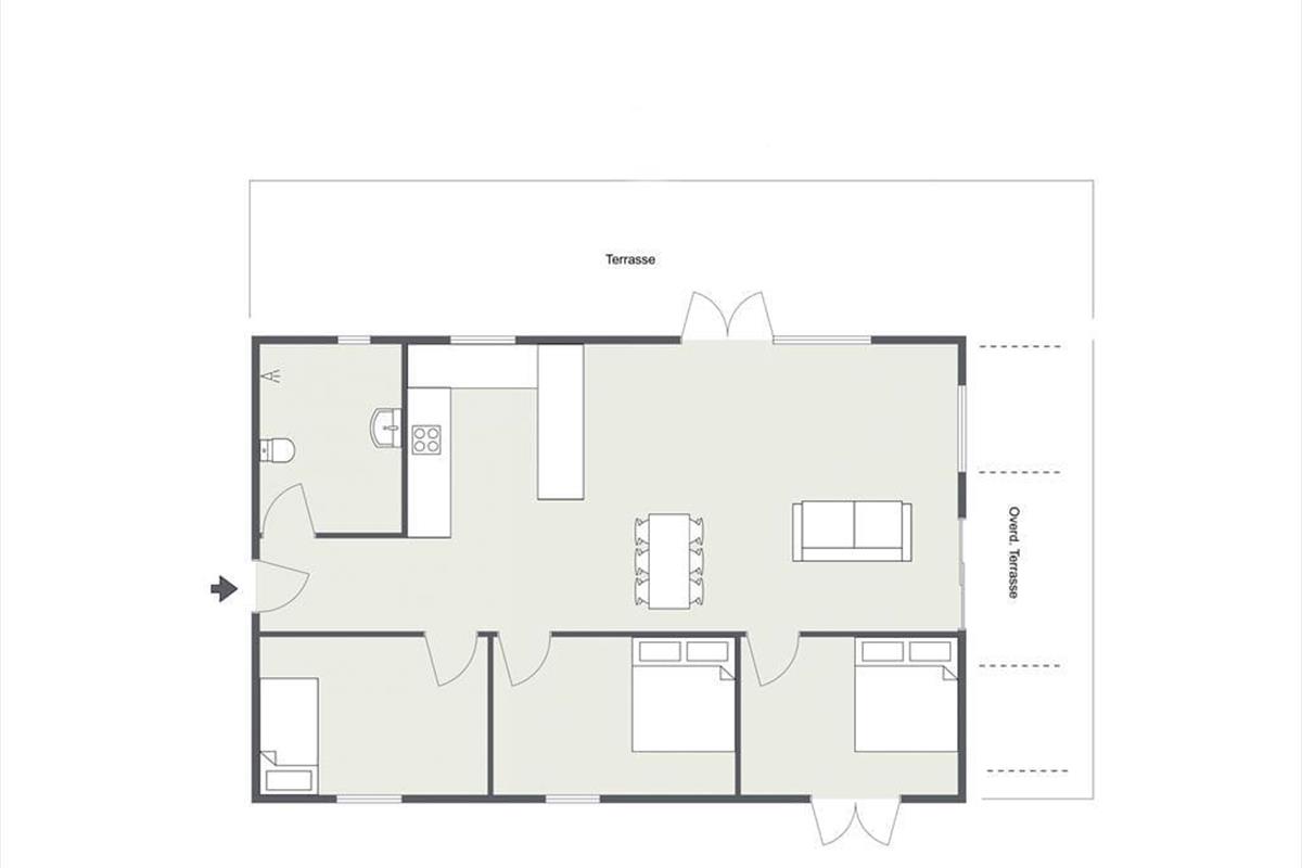 Dein Ferienhaus präsentiert sich hell und einladend. Herzstück deines Urlaubsdomizils ist die offene Kombination aus Wohnraum und Essbereich. In diesem Teil des Hauses wirst du mit deinen Lieben viele gemütliche Stunden mit guten Essen am Esstisch und traumhaft entspannte Abende mit dem ein oder anderen Buch auf dem Sofa genießen. Für maximale Gemütlichkeit und beste Ferienhausatmosphäre sorgt derweil das knisternde Feuer im Kaminofen. In der großen offenen Küche wird die Zubereitung der Mahlzeiten tagtäglich zum vergnügten Familienprojekt. Wie wäre es nachmittags beispielsweise mit selbstgebackenen Muffins, die ihr alle zusammen unter der Terrassenüberdachung genießt? Der Rest der Wohnfläche ist den drei ansprechenden Schlafräumen und dem schönen Duschbadezimmer überlassen.
