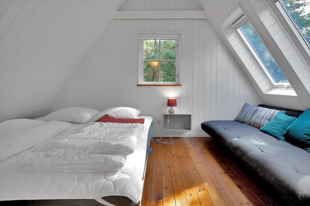 Rehe häufig durchlaufen. Im Erdgeschoss finden Sie auch das Badezimmer mit Dusche. Am ersten Stock gibt es 3 Schlafzimmer, mit Doppelbetten, und im einem auch einer Bettcouch für 2 Personen. Die Treppich ist ein bischen steil. Von der Terrasse aus haben Sie direkte Zugang zu einem tollen Nebengebäude mit einem Doppelbett und eigenes Toilette und Badezimmer mit Dusche. In dem netten Nebengebäude weitest vom Haus entfernt gibt es ebenso ein Doppelbett. Via die Terrasse erreicht man die Sauna.