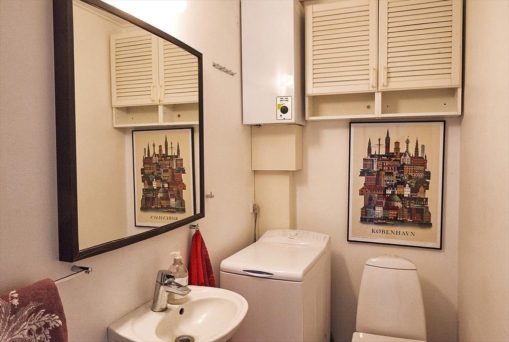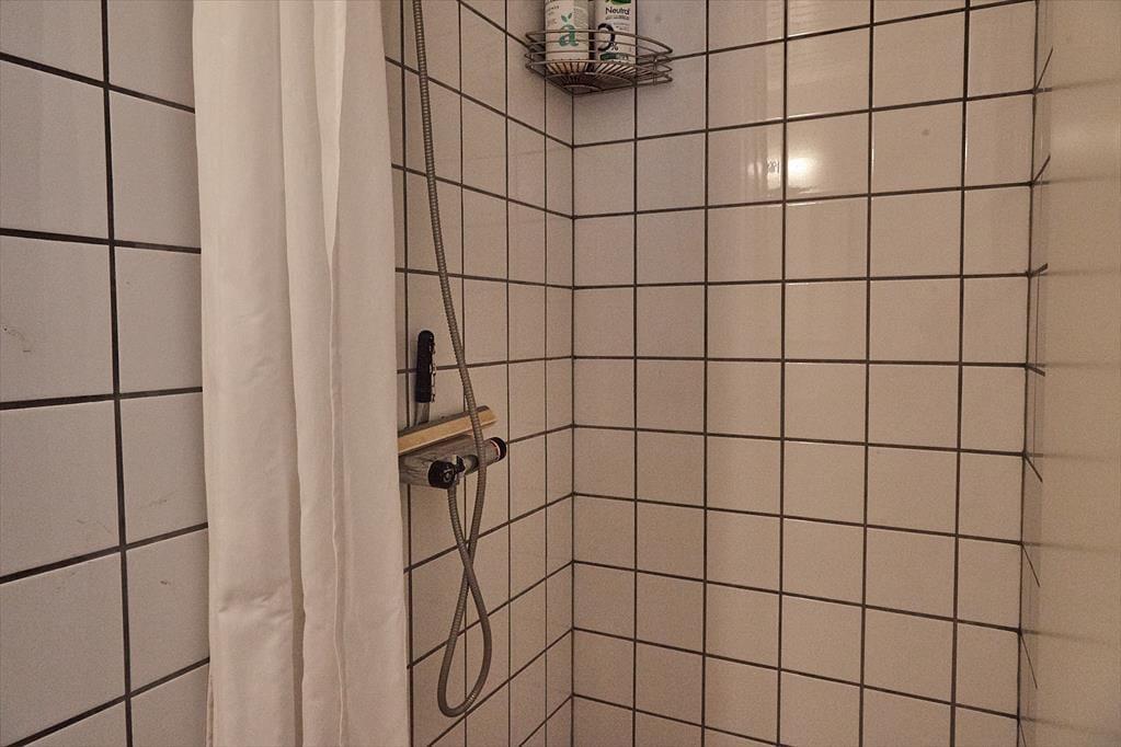 Eingangshalle. Badezimmer mit Dusche und Waschmaschine. Schlafzimmer mit Einzelbett. Küche/Wohnzimmer mit Essecke. Großes, helles Wohnzimmer mit Holzofen, Wärmepumpe und Zugang zur überdachten Terrasse. Es gibt eine schöne Außendusche mit kaltem und warmem Wasser, wo Sie spät in der Nacht unter freiem Himmel duschen können, während Sie den Sternenhimmel beobachten. Es gibt auch Zugang zu einem abschließbaren Schuppen für Fahrräder.