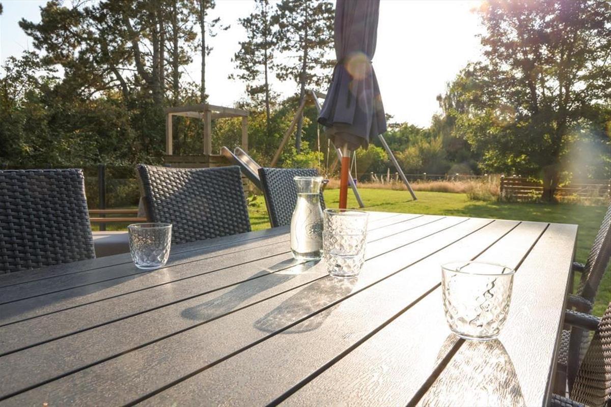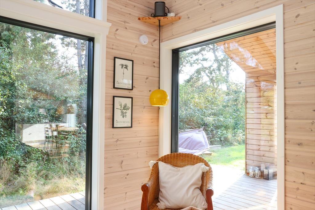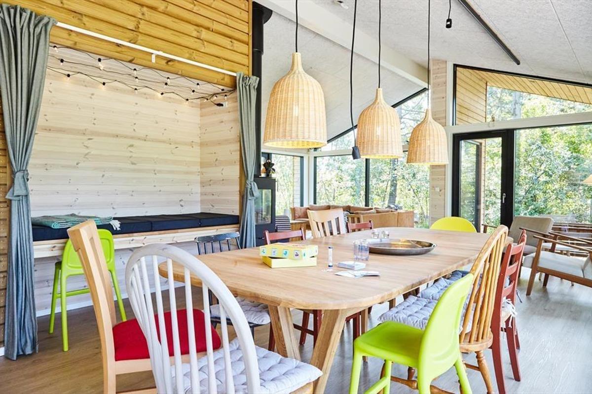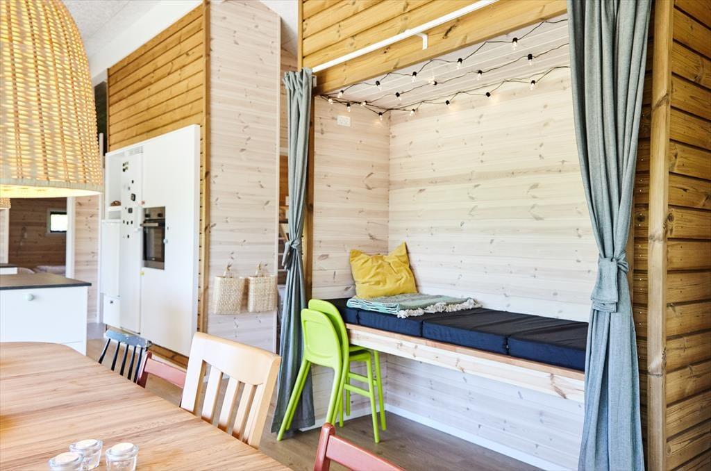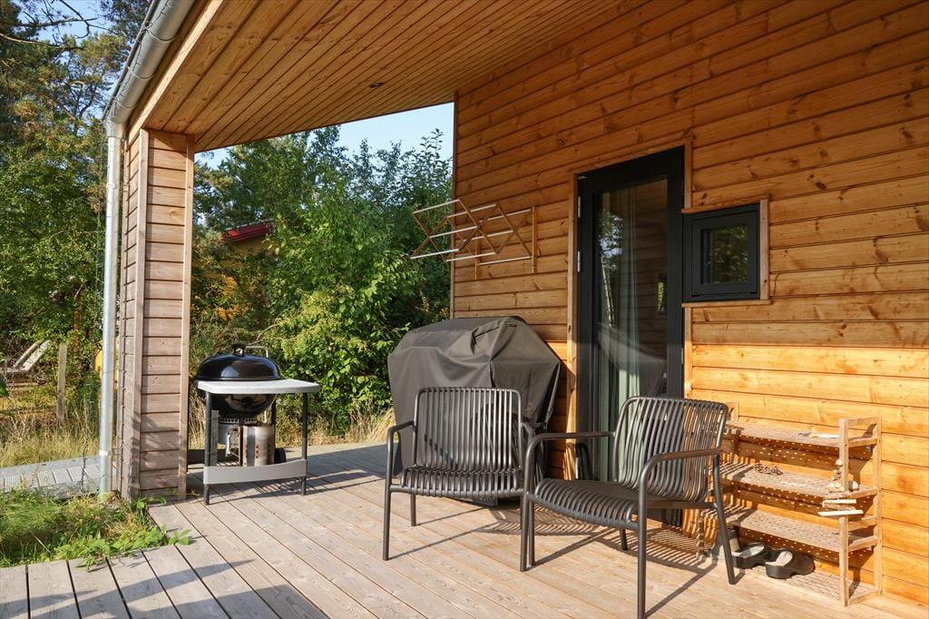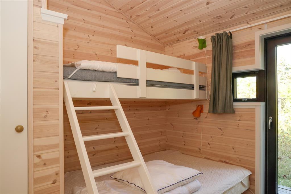 Sie betreten das Haus durch den Eingangsbereich, in dem sich auch eine Waschmaschine und Wäschetrockner befindet. Von dort aus haben Sie Zugang zu einem Hängeboden mit zwei Schlafplätzen. Ein großes Schlafzimmer mit Doppelbett verfügt über direkten Zugang zum Badezimmer. Zudem sind ein weiterer Schlafraum mit Doppelbett sowie ein Schlafzimmer mit Etagenbett vorhanden. Das Badezimmer ist mit einer Dusche ausgestattet. In der großen, hellen Wohnküche mit Essecke und gemütlicher Sitzecke mit Kaminofen, befindet sich auch der Fernseher, über den allerdings nur Streaming-Angebote abgerufen werden können. Vom Wohnzimmer aus haben Sie Zugang zum großen, teilweise überdachten Terrassenareal. Darüber hinaus wurde der Rest des Gartens mit Rasen und natürlichen Böden angelegt, um die Artenvielfalt zu fördern.