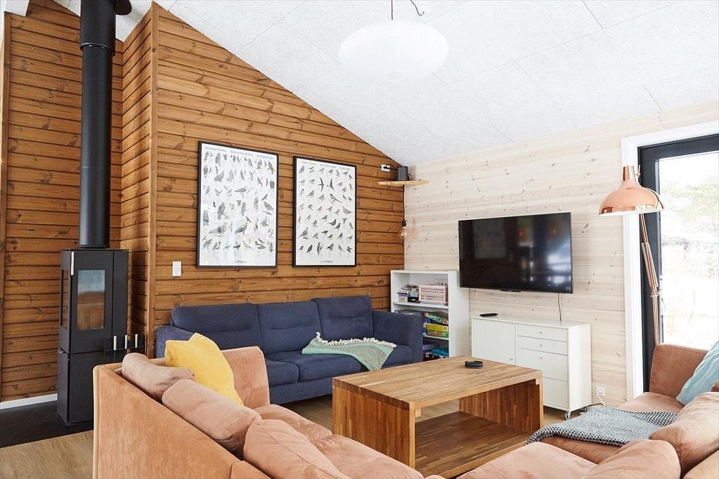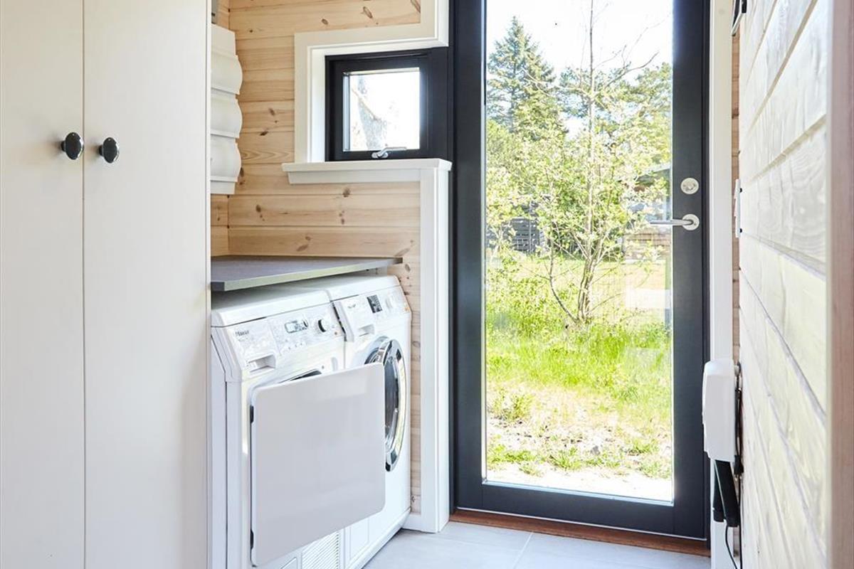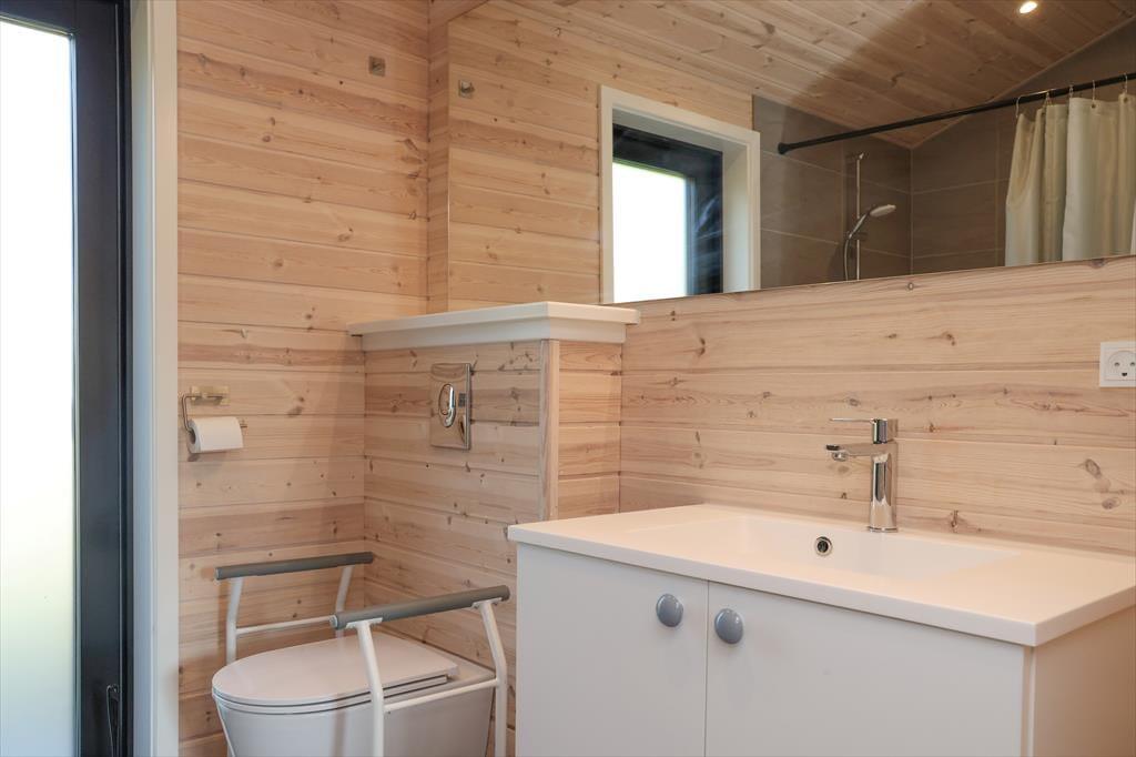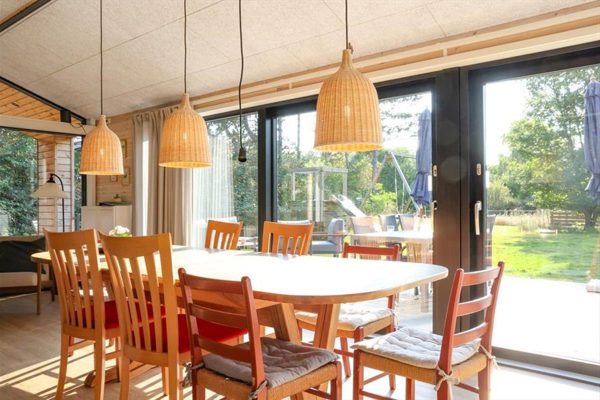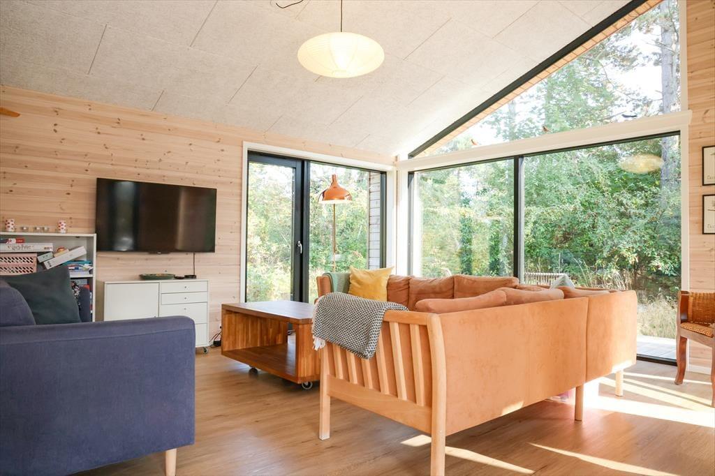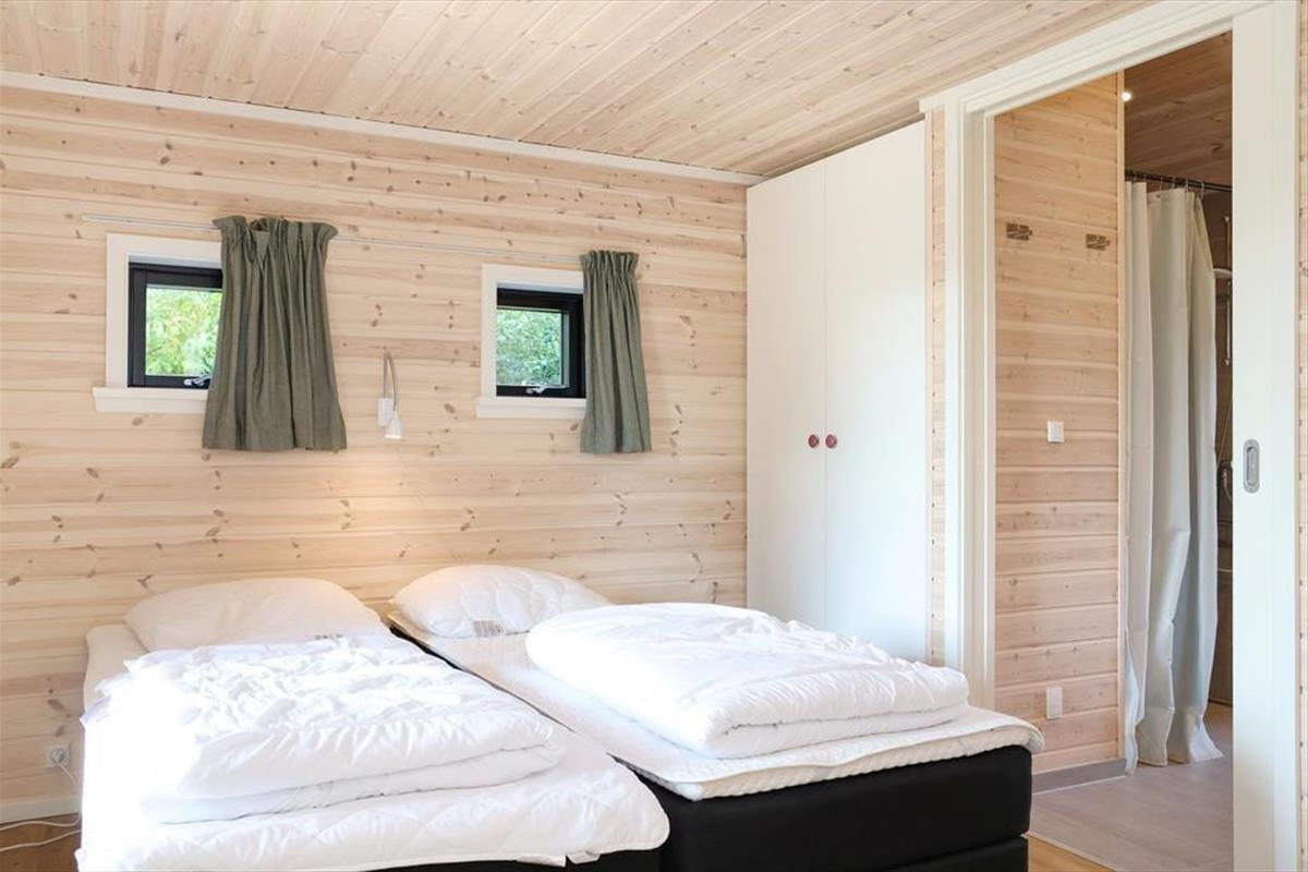 Sie betreten das Haus durch den Eingangsbereich, in dem sich auch eine Waschmaschine und Wäschetrockner befindet. Von dort aus haben Sie Zugang zu einem Hängeboden mit zwei Schlafplätzen. Ein großes Schlafzimmer mit Doppelbett verfügt über direkten Zugang zum Badezimmer. Zudem sind ein weiterer Schlafraum mit Doppelbett sowie ein Schlafzimmer mit Etagenbett vorhanden. Das Badezimmer ist mit einer Dusche ausgestattet. In der großen, hellen Wohnküche mit Essecke und gemütlicher Sitzecke mit Kaminofen, befindet sich auch der Fernseher, über den allerdings nur Streaming-Angebote abgerufen werden können. Vom Wohnzimmer aus haben Sie Zugang zum großen, teilweise überdachten Terrassenareal. Darüber hinaus wurde der Rest des Gartens mit Rasen und natürlichen Böden angelegt, um die Artenvielfalt zu fördern.