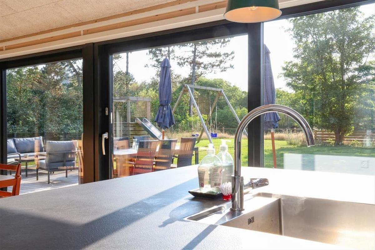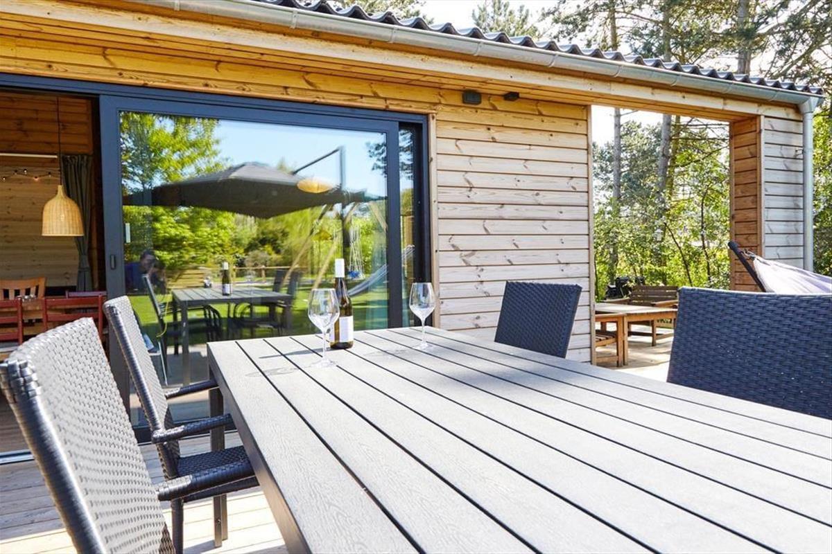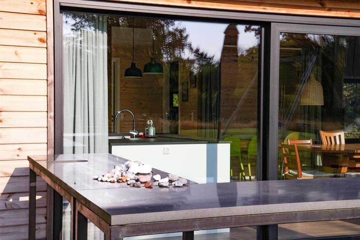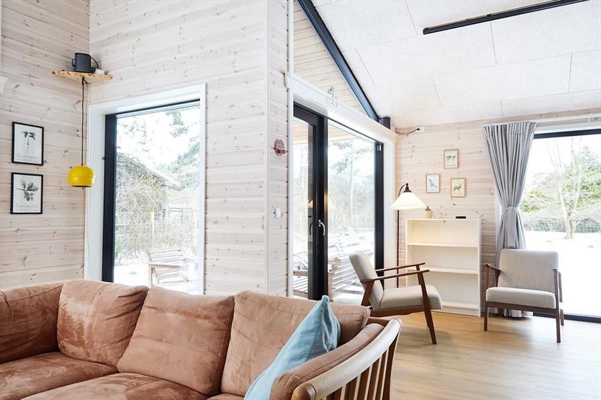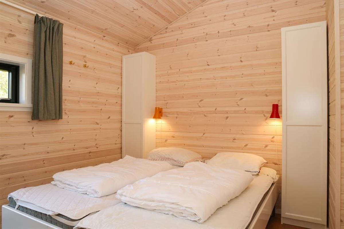Sie betreten das Haus durch den Eingangsbereich, in dem sich auch eine Waschmaschine und Wäschetrockner befindet. Von dort aus haben Sie Zugang zu einem Hängeboden mit zwei Schlafplätzen. Ein großes Schlafzimmer mit Doppelbett verfügt über direkten Zugang zum Badezimmer. Zudem sind ein weiterer Schlafraum mit Doppelbett sowie ein Schlafzimmer mit Etagenbett vorhanden. Das Badezimmer ist mit einer Dusche ausgestattet. In der großen, hellen Wohnküche mit Essecke und gemütlicher Sitzecke mit Kaminofen, befindet sich auch der Fernseher, über den allerdings nur Streaming-Angebote abgerufen werden können. Vom Wohnzimmer aus haben Sie Zugang zum großen, teilweise überdachten Terrassenareal. Darüber hinaus wurde der Rest des Gartens mit Rasen und natürlichen Böden angelegt, um die Artenvielfalt zu fördern.