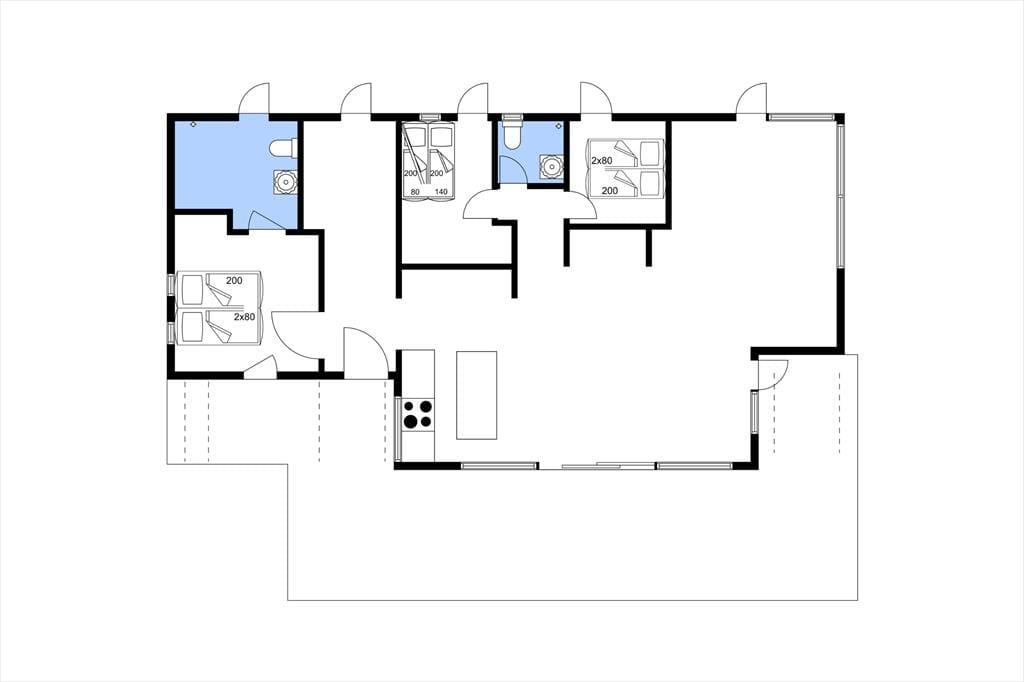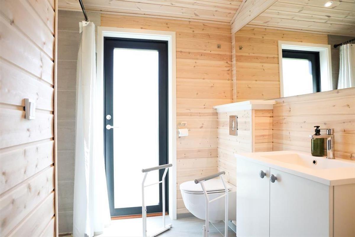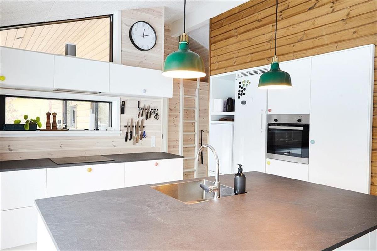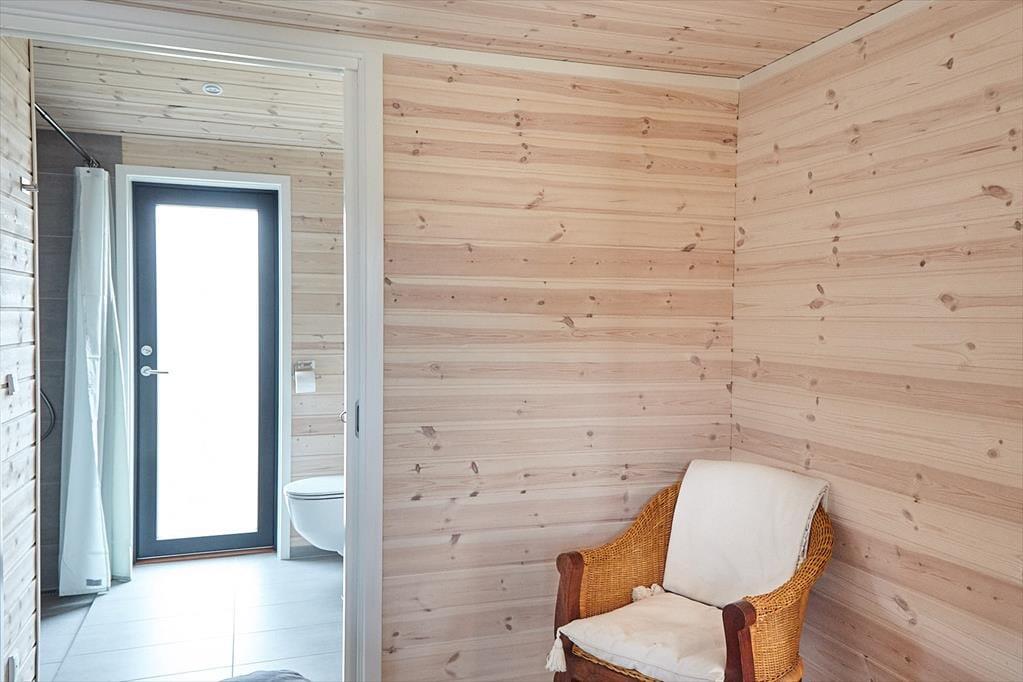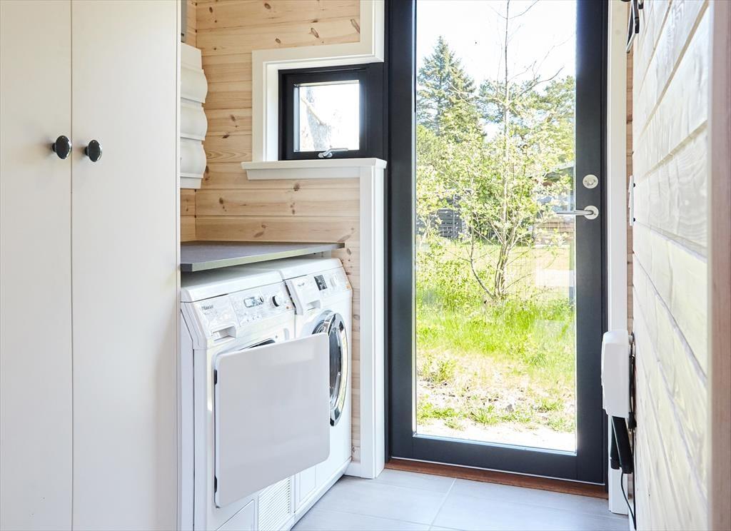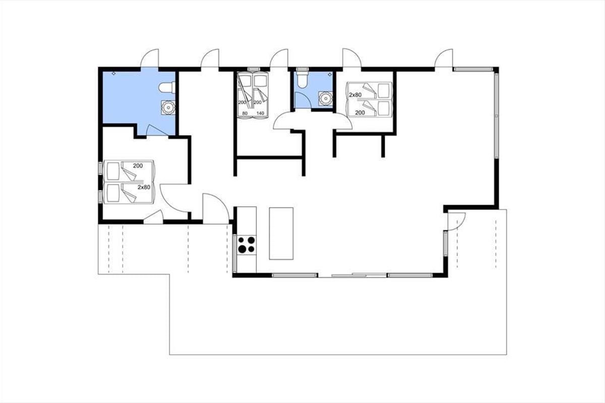 Sie betreten das Haus durch den Eingangsbereich, in dem sich auch eine Waschmaschine und Wäschetrockner befindet. Von dort aus haben Sie Zugang zu einem Hängeboden mit zwei Schlafplätzen. Ein großes Schlafzimmer mit Doppelbett verfügt über direkten Zugang zum Badezimmer. Zudem sind ein weiterer Schlafraum mit Doppelbett sowie ein Schlafzimmer mit Etagenbett vorhanden. Das Badezimmer ist mit einer Dusche ausgestattet. In der großen, hellen Wohnküche mit Essecke und gemütlicher Sitzecke mit Kaminofen, befindet sich auch der Fernseher, über den allerdings nur Streaming-Angebote abgerufen werden können. Vom Wohnzimmer aus haben Sie Zugang zum großen, teilweise überdachten Terrassenareal. Darüber hinaus wurde der Rest des Gartens mit Rasen und natürlichen Böden angelegt, um die Artenvielfalt zu fördern.