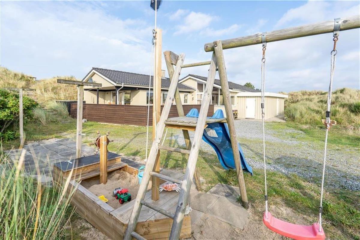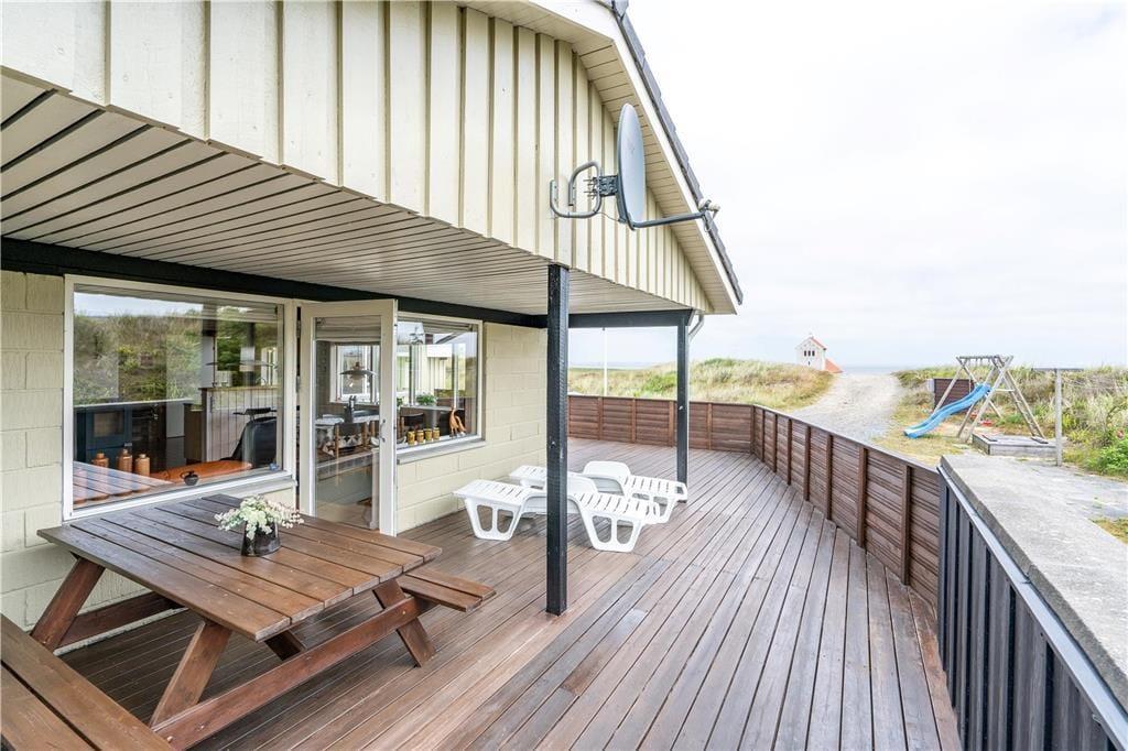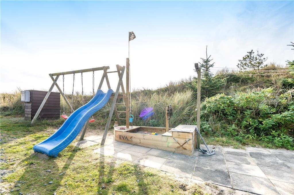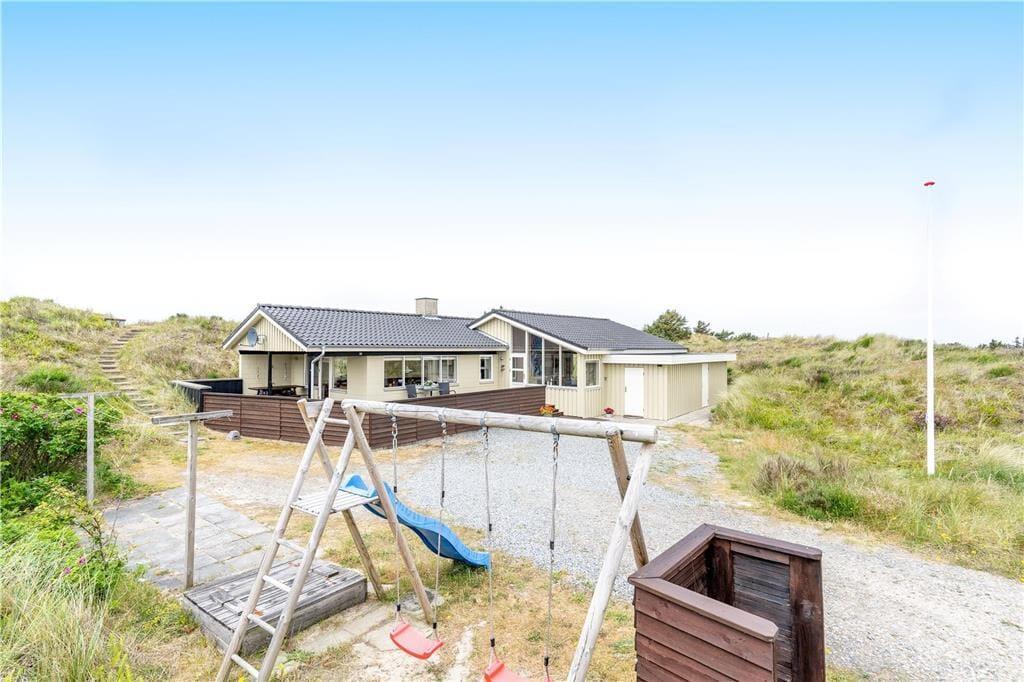 Rund um das Haus verteilen sich schöne Terrassen. Gen Osten und Süden erwartet Sie eine große, teilweise überdachte Terrasse, auf der Sie in der Sommersonne frühstücken und zu Mittag essen können. Von hier aus blicken Sie zum Fjord. Besonders während des Sonnenaufgangs, der den Himmel und das Wasser in goldene Farbtöne taucht, ist dieser Ausblick mehr als beeindruckend. An die Nordwestseite des Mietobjektes schließt eine weitere, teilweise überdachte Terrasse, auf der Sie die letzten Sonnenstrahlen des Tages und schöne Sonnenuntergänge hinter den Dünen genießen. Ihre Kinder dürfen sich auf ein Spielareal mit einer Schaukel, einer Rutsche und einer Sandkiste freuen. Die Außendusche spült Ihnen nach einem Tag am Meer den Sand und das Salz von der Haut.