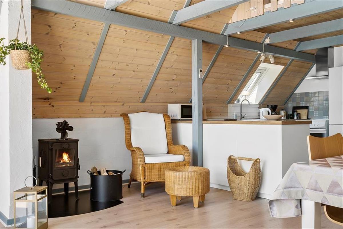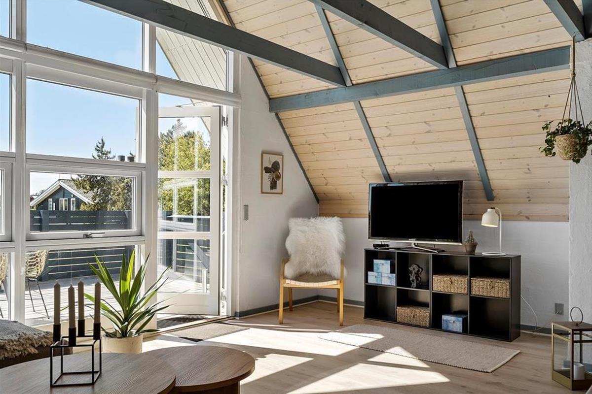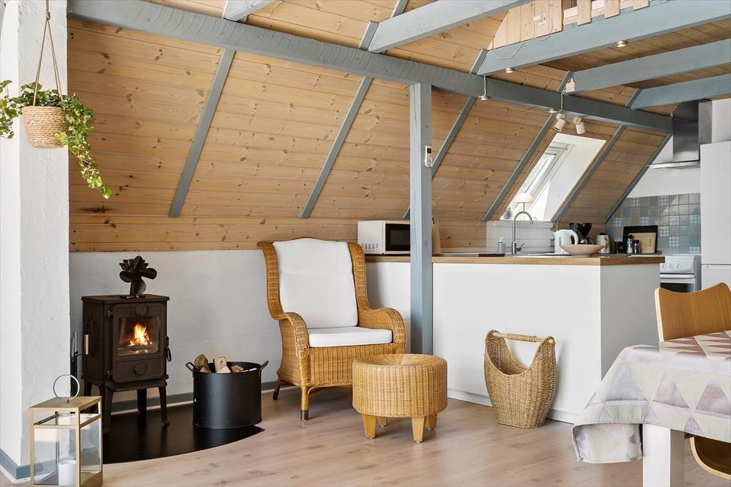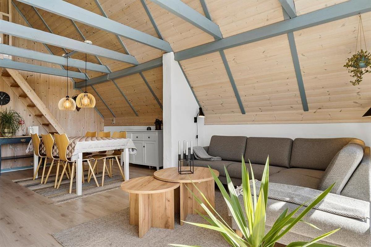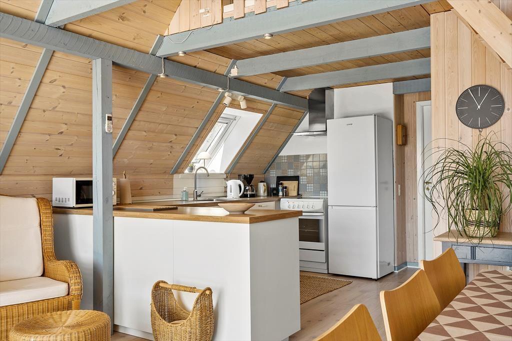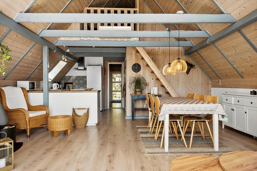 Das Ferienhaus ist ein sog. A-Haus, da das Dach durch seine Konstruktion weit nach unten reicht. Deshalb hat das Erdgeschoss schräge Wände, die zusammen mit den sichtbaren Balken eine ganz besondere Atmosphäre und ein besonderes Ambiente schaffen. Dies lässt sich am ehesten im großen Aufenthaltsraum feststellen, der durch die südlichen, bodentiefen Fensterpartien im natürlichen Licht gebadet wird. Die Küche und das Wohnzimmer gehen ineinander über und es bietet sich der gemütliche Rahmen im Urlaub. Sie können in der gut ausgestatteten Küche gemeinsam das Essen zubereiten und es bequem am Esstisch im Wohnbereich servieren. Sie können ebenfalls auf den Sofas entspannen und einen guten Film auf dem Fernseher schauen, während das Feuer im Ofen knistert. Das moderne Badezimmer ist mit einer Duschnische ausgestattet, und der anschließende "Depotraum" bietet eine Waschmaschine. Das Objekt ist darüber hinaus mit zwei Schlafzimmern ausgestattet und bietet Platz für vier Personen. Eine Treppe führt zu einem großen, offenen Loft mit zusätzlichen Schlafplätzen und einem Schreibtisch.