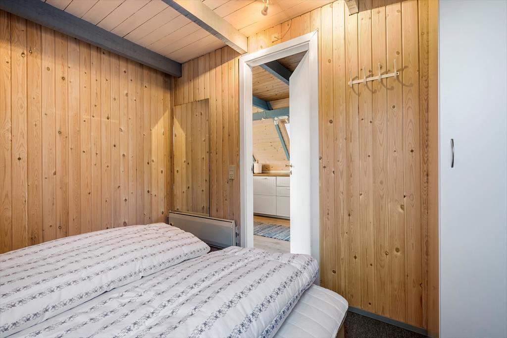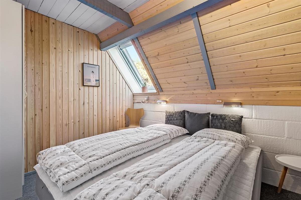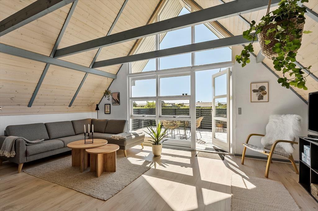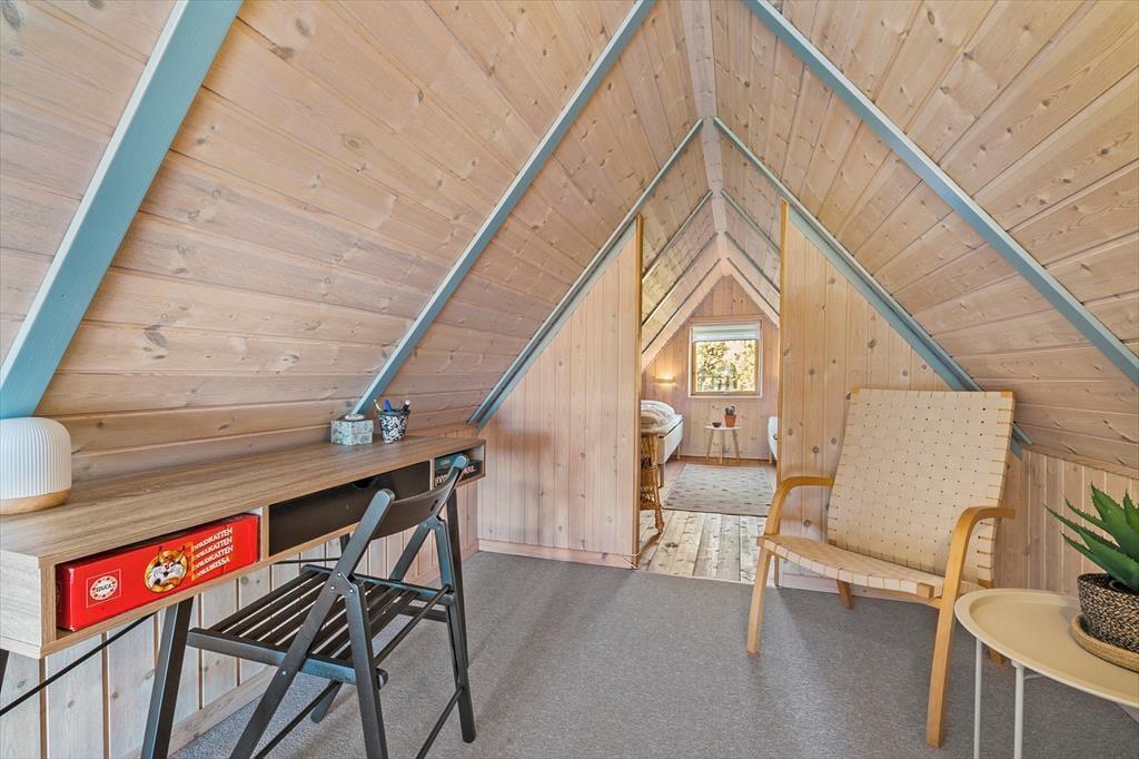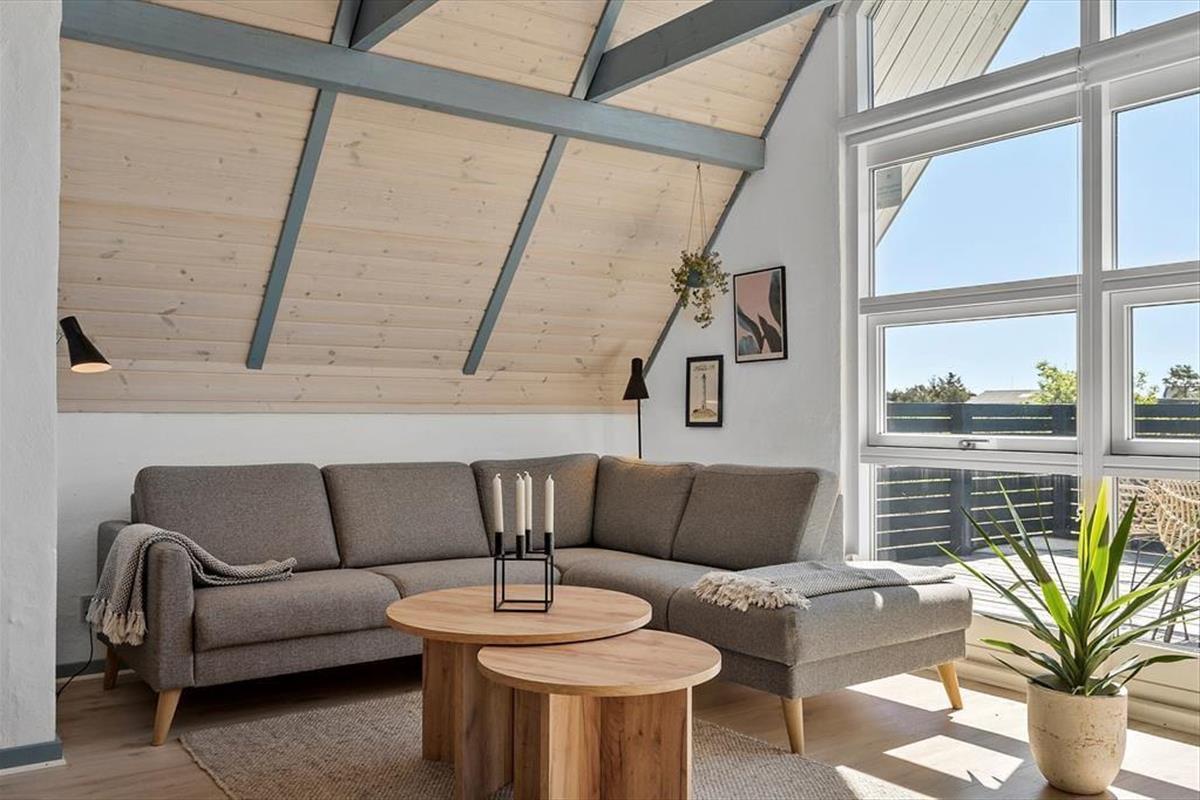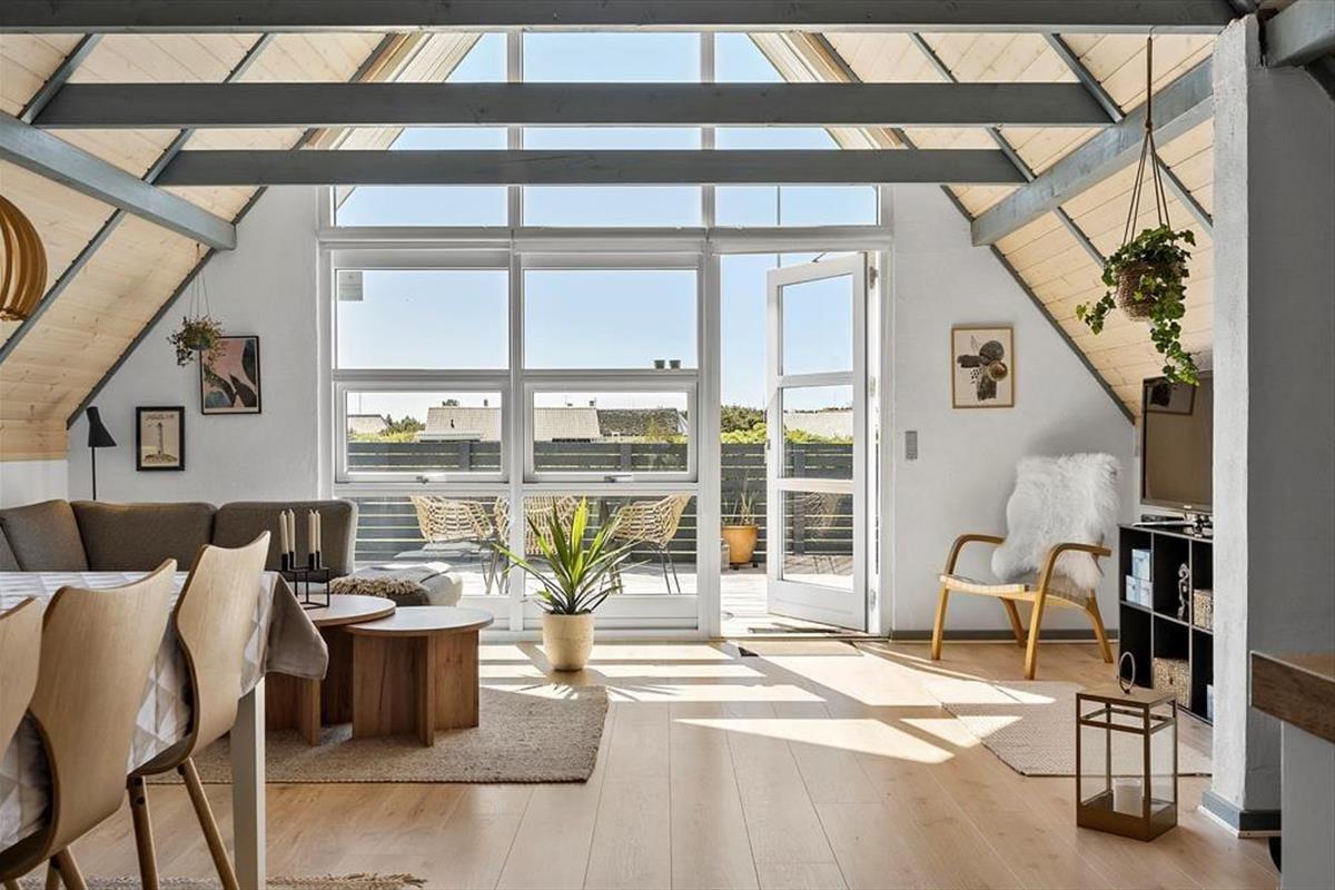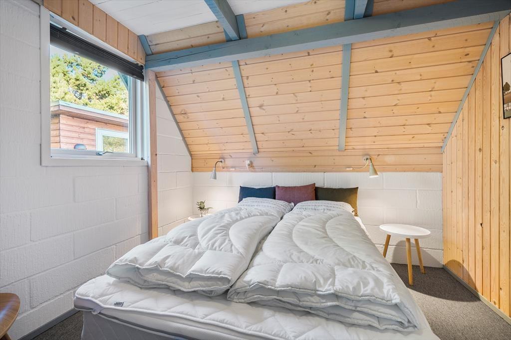 Das Ferienhaus ist ein sog. A-Haus, da das Dach durch seine Konstruktion weit nach unten reicht. Deshalb hat das Erdgeschoss schräge Wände, die zusammen mit den sichtbaren Balken eine ganz besondere Atmosphäre und ein besonderes Ambiente schaffen. Dies lässt sich am ehesten im großen Aufenthaltsraum feststellen, der durch die südlichen, bodentiefen Fensterpartien im natürlichen Licht gebadet wird. Die Küche und das Wohnzimmer gehen ineinander über und es bietet sich der gemütliche Rahmen im Urlaub. Sie können in der gut ausgestatteten Küche gemeinsam das Essen zubereiten und es bequem am Esstisch im Wohnbereich servieren. Sie können ebenfalls auf den Sofas entspannen und einen guten Film auf dem Fernseher schauen, während das Feuer im Ofen knistert. Das moderne Badezimmer ist mit einer Duschnische ausgestattet, und der anschließende "Depotraum" bietet eine Waschmaschine. Das Objekt ist darüber hinaus mit zwei Schlafzimmern ausgestattet und bietet Platz für vier Personen. Eine Treppe führt zu einem großen, offenen Loft mit zusätzlichen Schlafplätzen und einem Schreibtisch.
