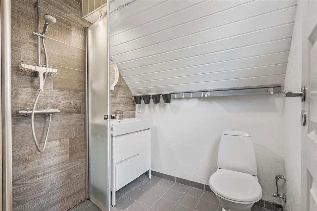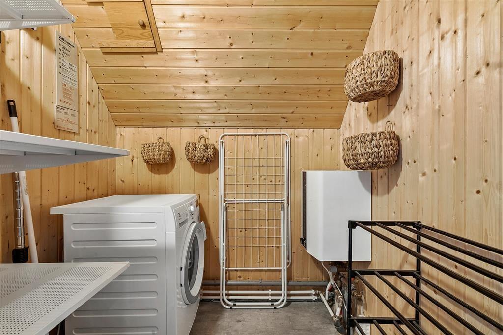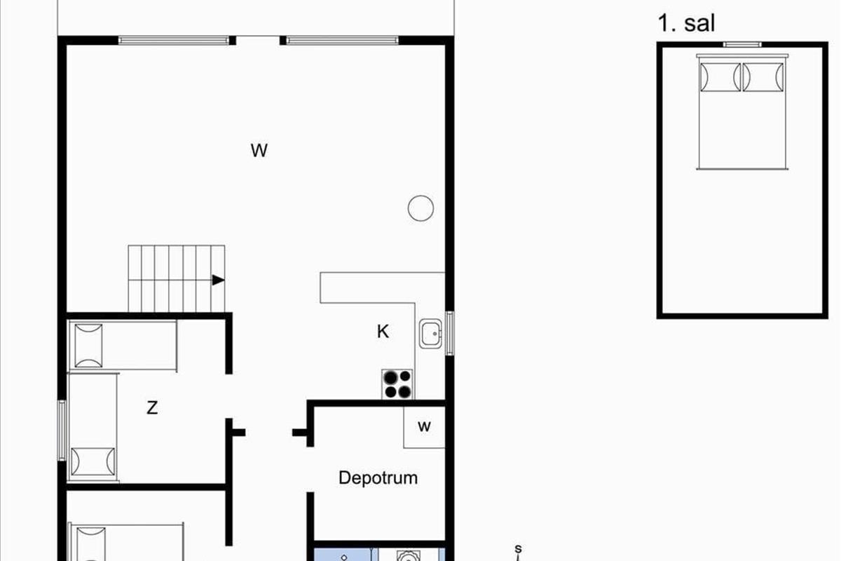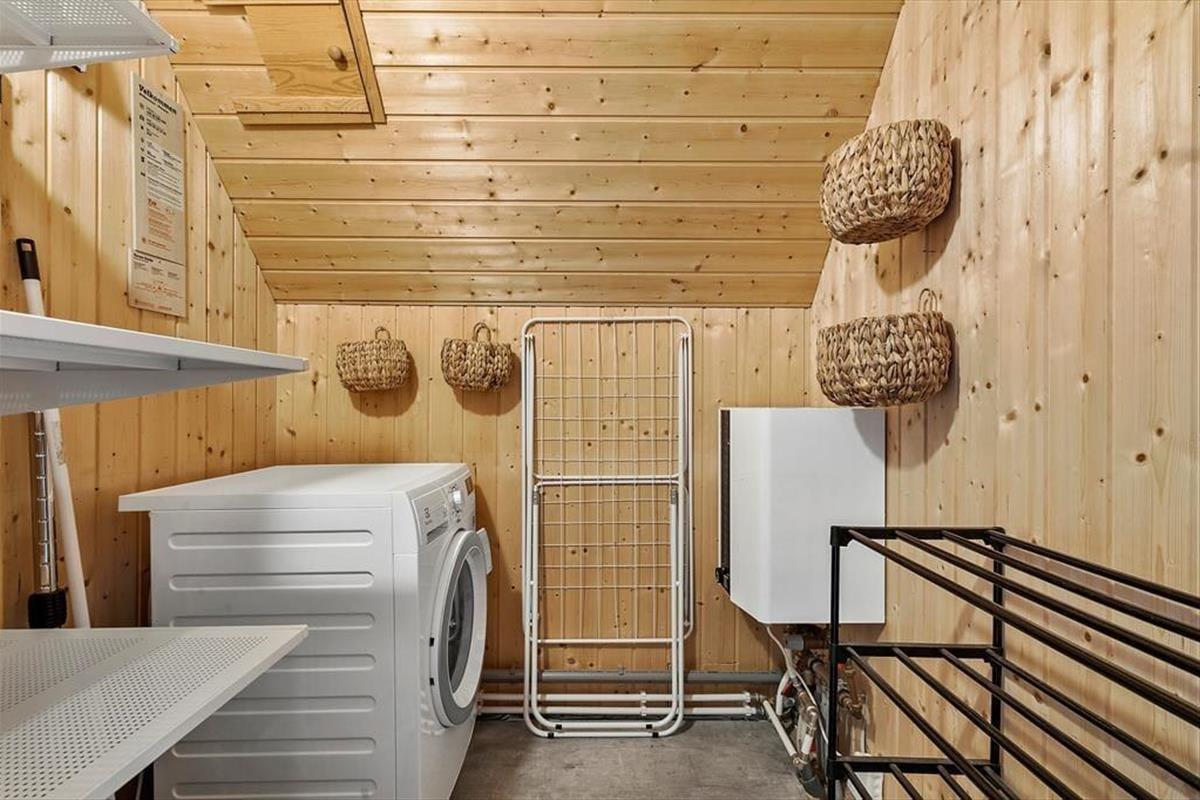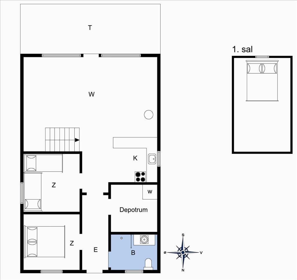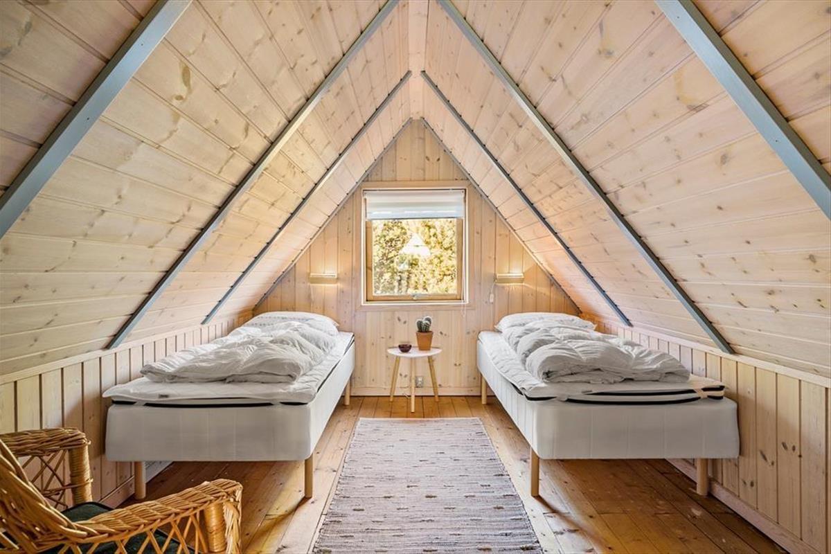 Das Ferienhaus ist ein sog. A-Haus, da das Dach durch seine Konstruktion weit nach unten reicht. Deshalb hat das Erdgeschoss schräge Wände, die zusammen mit den sichtbaren Balken eine ganz besondere Atmosphäre und ein besonderes Ambiente schaffen. Dies lässt sich am ehesten im großen Aufenthaltsraum feststellen, der durch die südlichen, bodentiefen Fensterpartien im natürlichen Licht gebadet wird. Die Küche und das Wohnzimmer gehen ineinander über und es bietet sich der gemütliche Rahmen im Urlaub. Sie können in der gut ausgestatteten Küche gemeinsam das Essen zubereiten und es bequem am Esstisch im Wohnbereich servieren. Sie können ebenfalls auf den Sofas entspannen und einen guten Film auf dem Fernseher schauen, während das Feuer im Ofen knistert. Das moderne Badezimmer ist mit einer Duschnische ausgestattet, und der anschließende "Depotraum" bietet eine Waschmaschine. Das Objekt ist darüber hinaus mit zwei Schlafzimmern ausgestattet und bietet Platz für vier Personen. Eine Treppe führt zu einem großen, offenen Loft mit zusätzlichen Schlafplätzen und einem Schreibtisch.