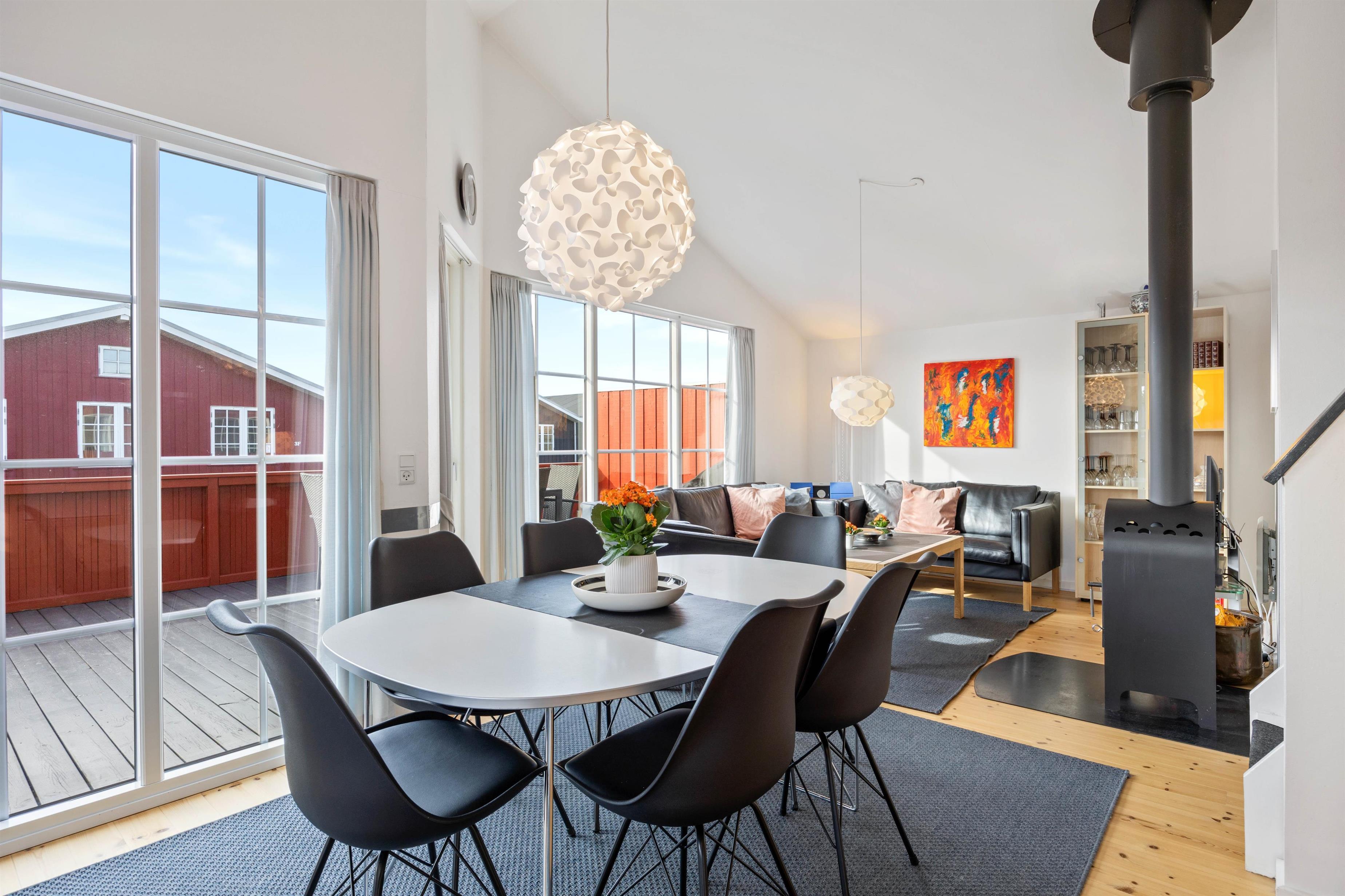 The living area is furnished with modern, comfortable furniture and includes a wood-burning stove, Smart TV, and energy-efficient heat pump. From the living room, you have direct access to the beautiful south-facing terrace.