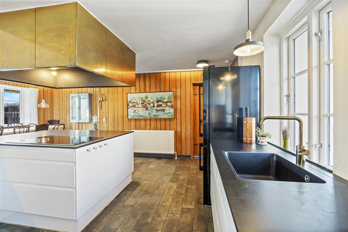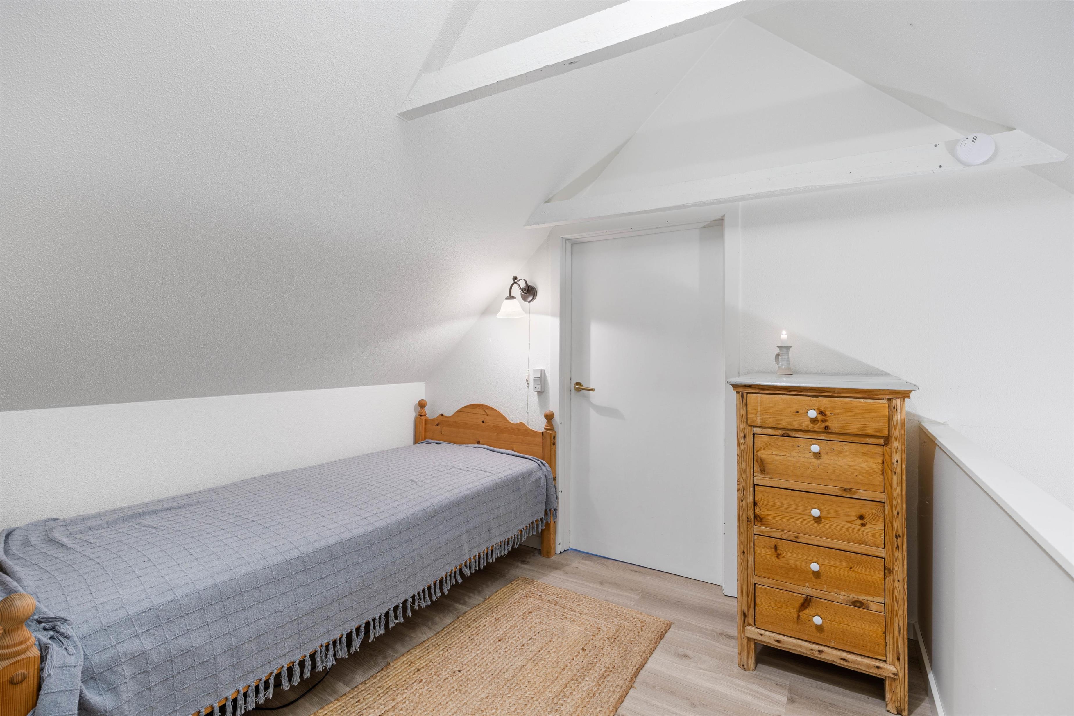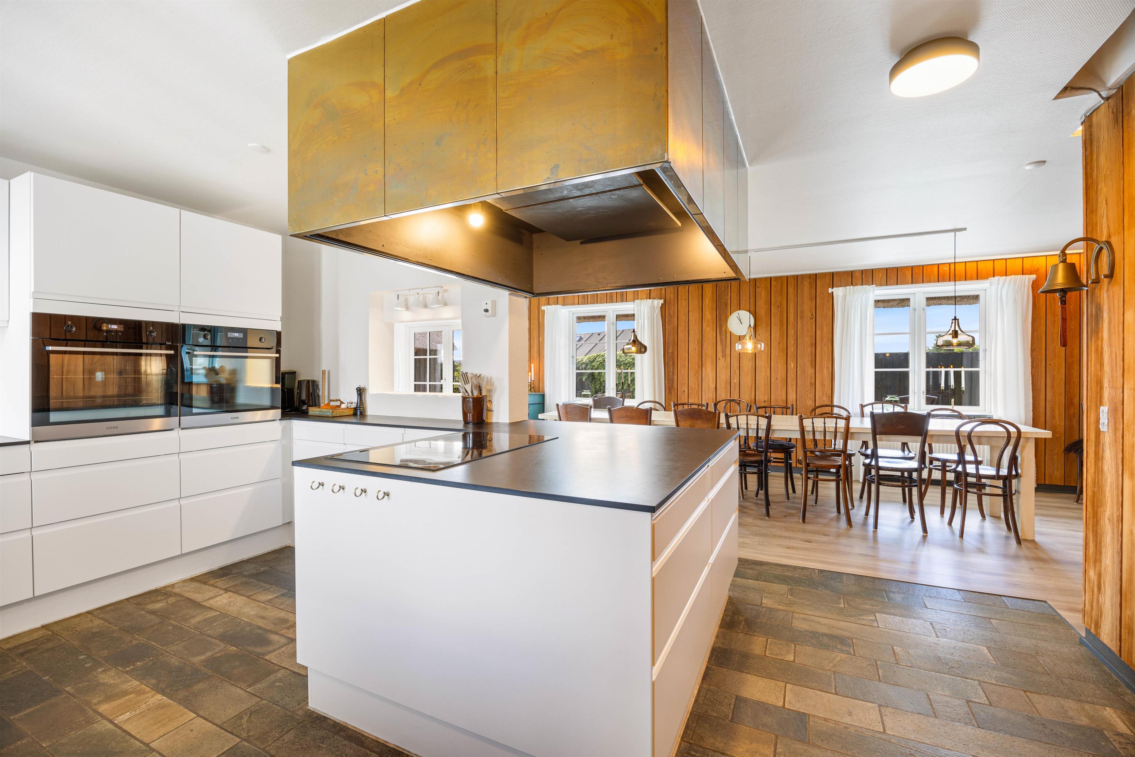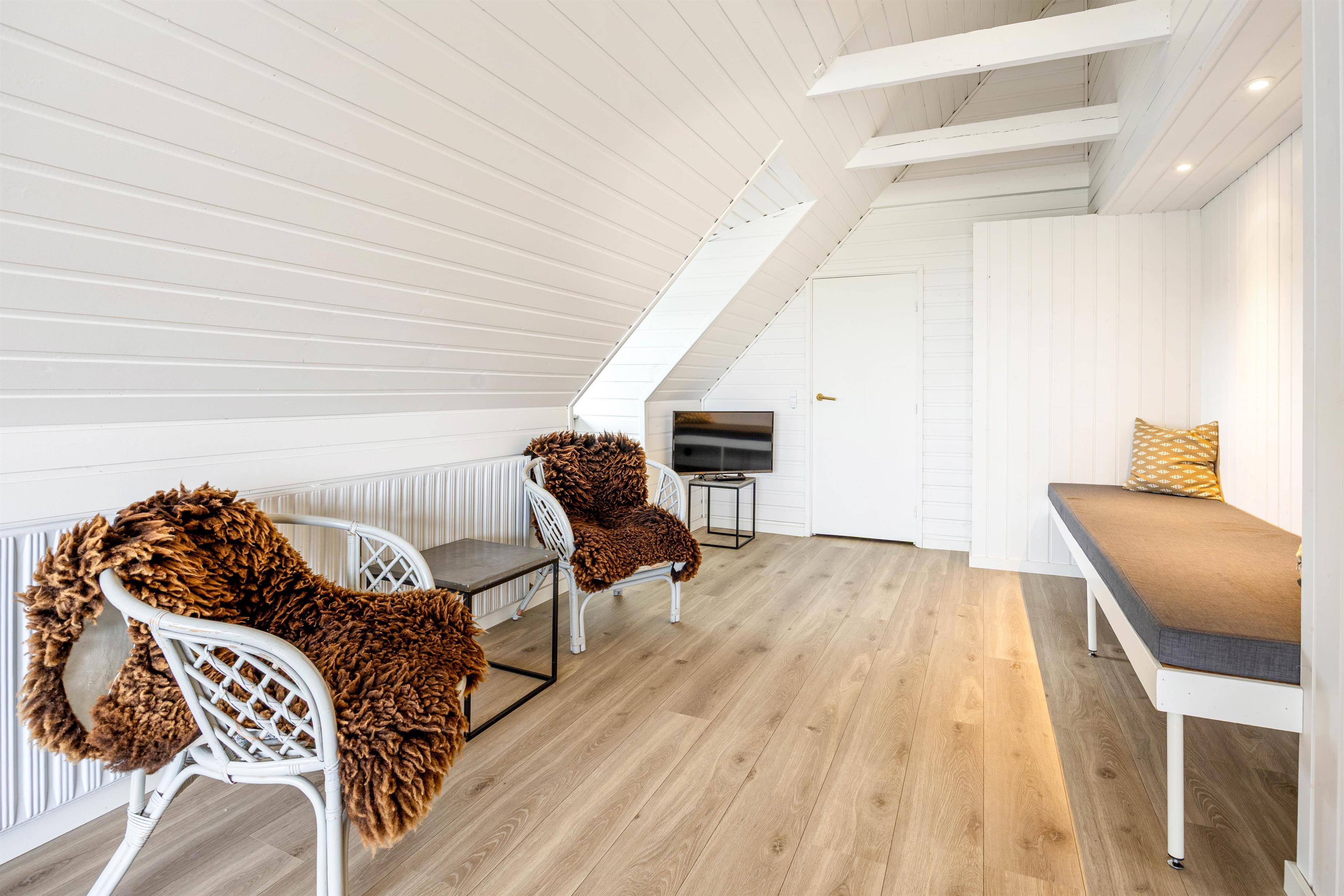 In the living rooms on the ground and first floors, large windows frame the unique fjord views, and you can gather around the wood-burning stove. The holiday home's original character has been preserved throughout: the combination of white walls, original wood panelling, and various wooden and stone floors creates a modern yet cosy atmosphere.
