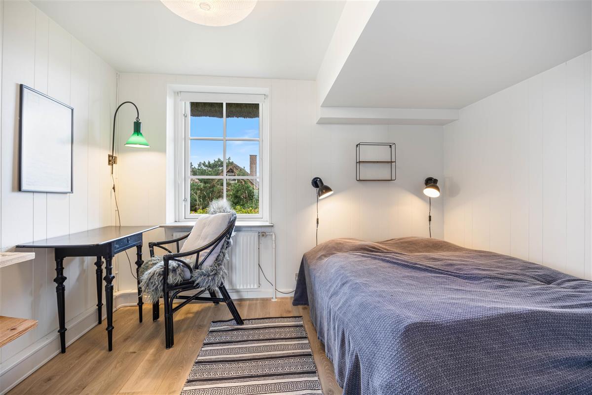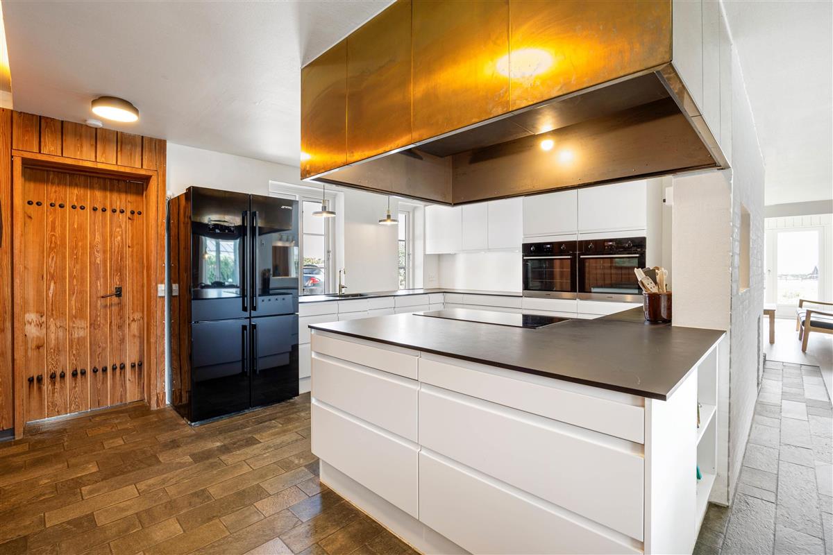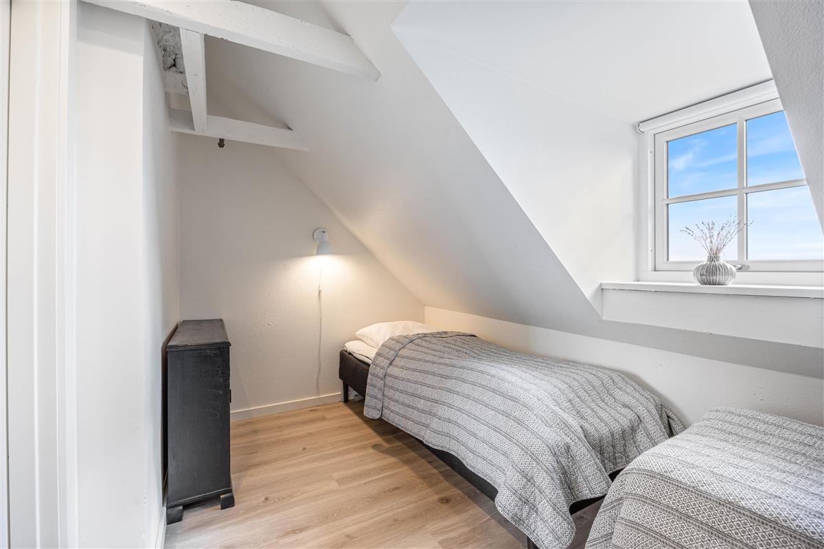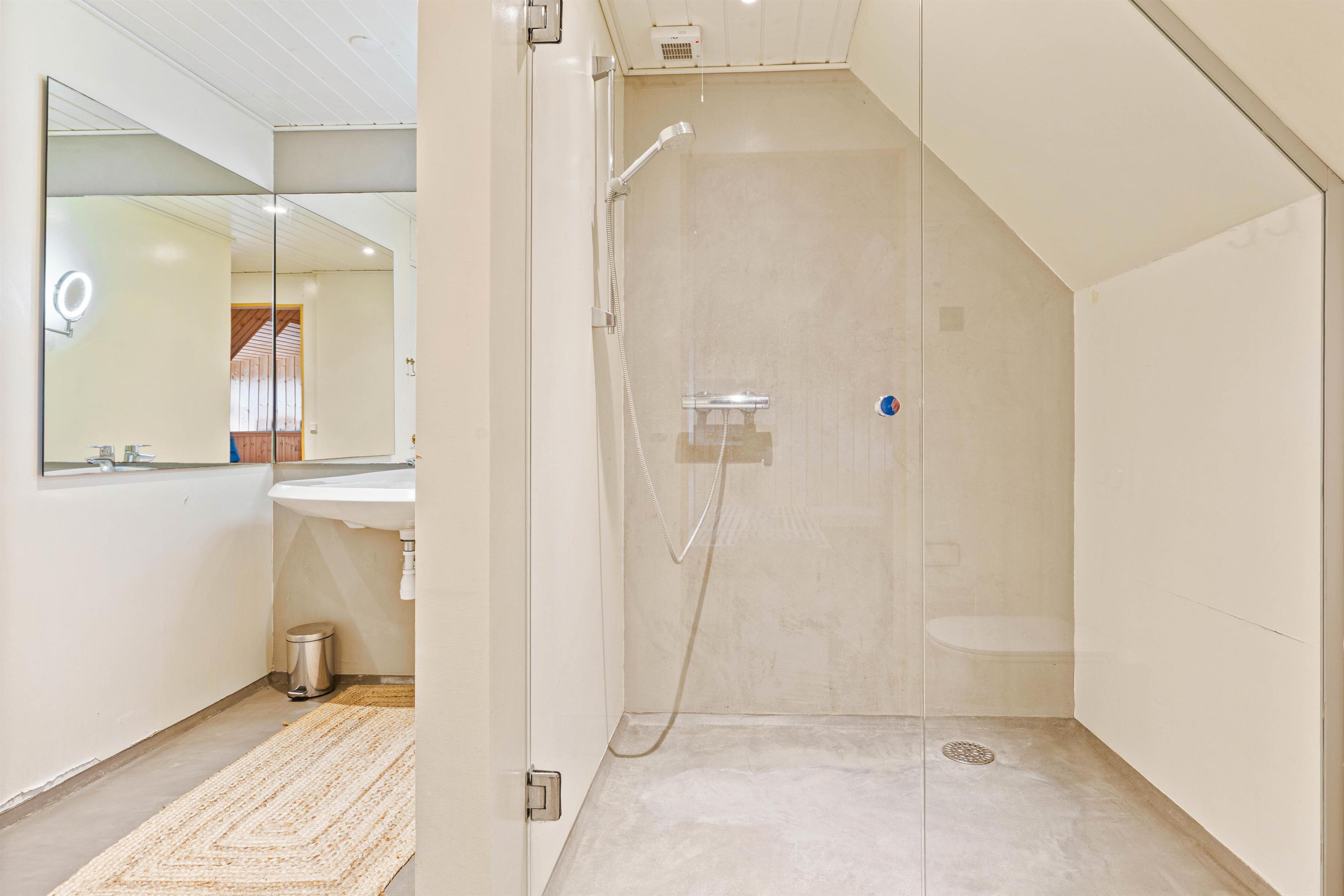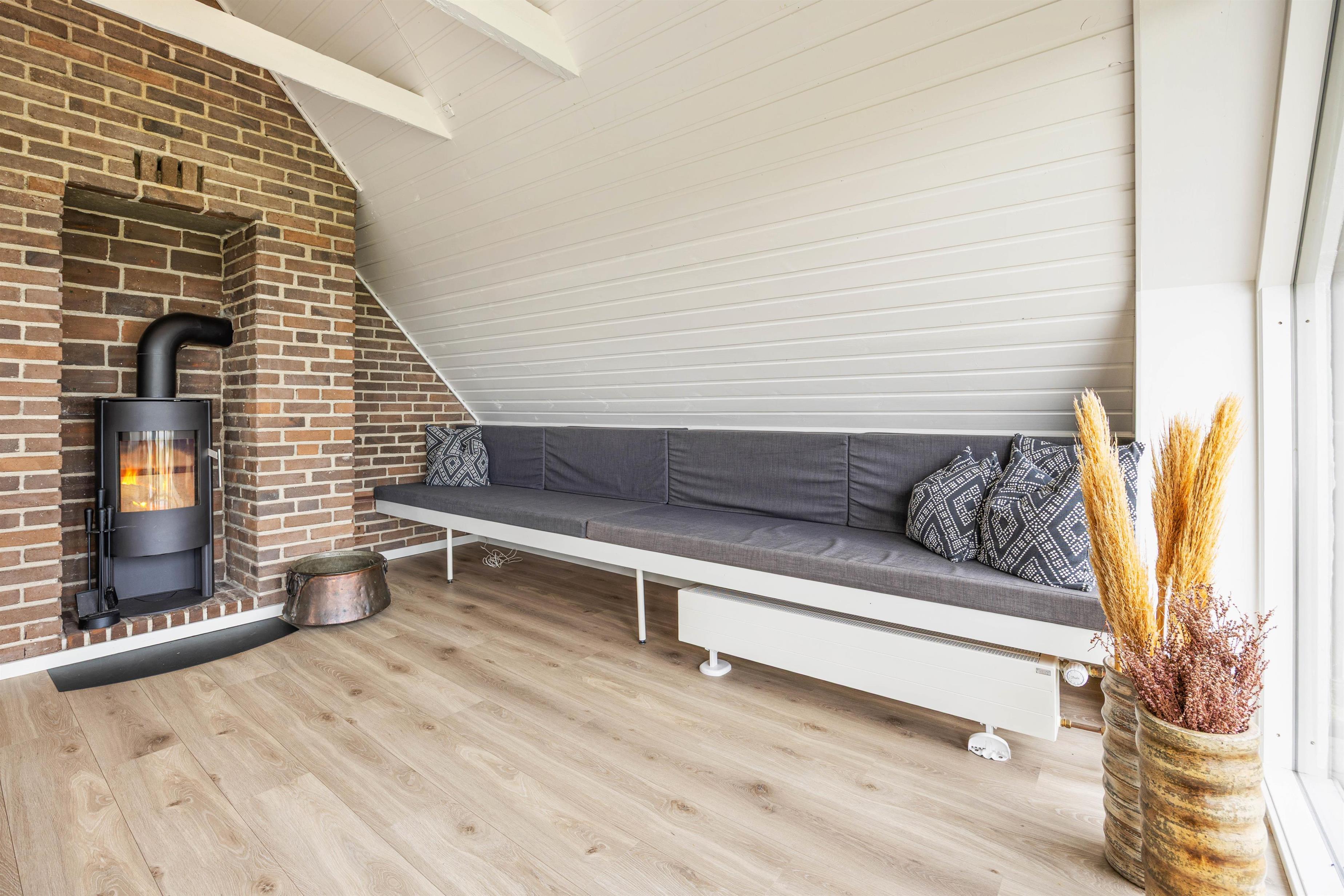 In the living rooms on the ground and first floors, large windows frame the unique fjord views, and you can gather around the wood-burning stove. The holiday home's original character has been preserved throughout: the combination of white walls, original wood panelling, and various wooden and stone floors creates a modern yet cosy atmosphere.