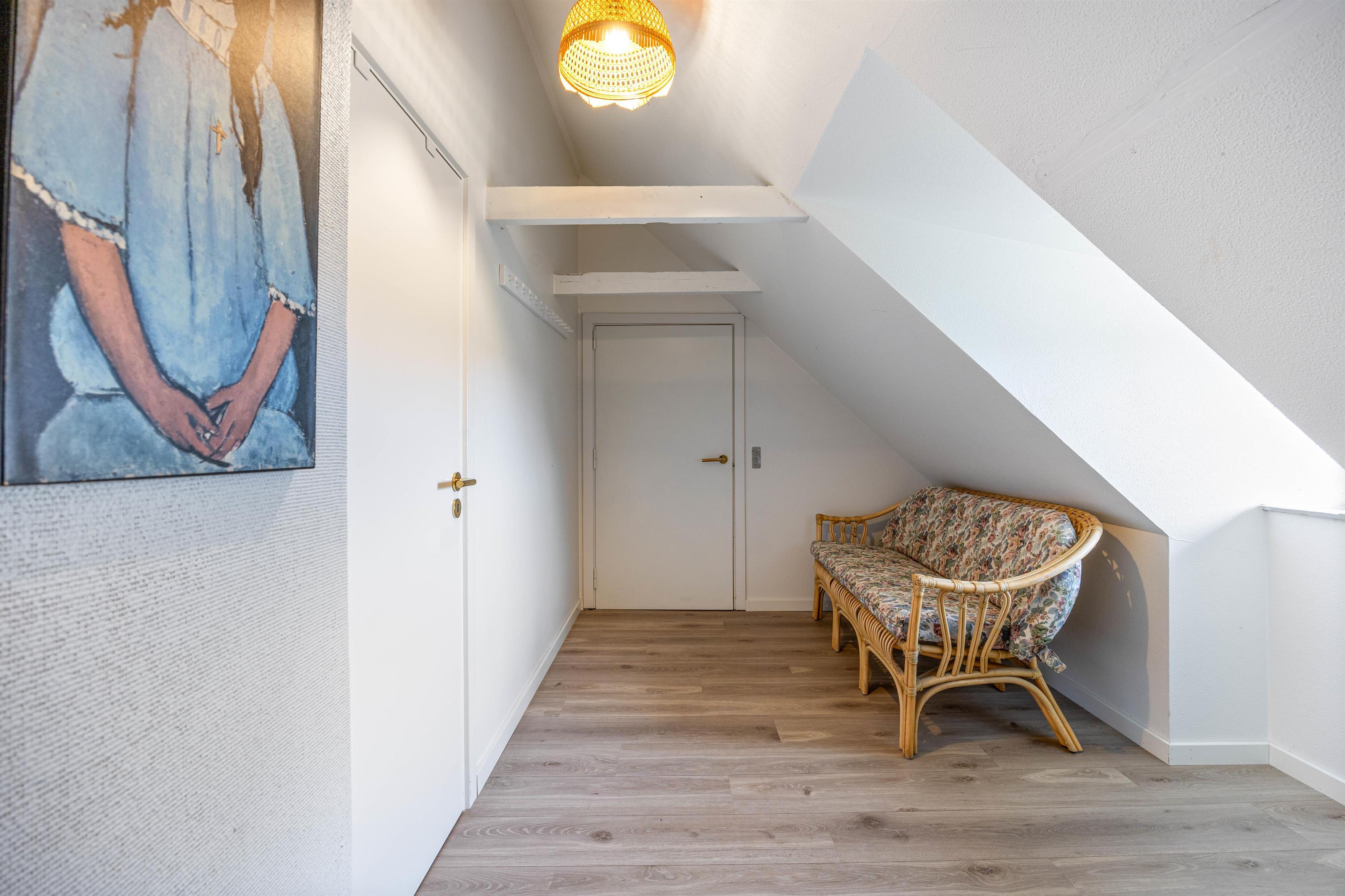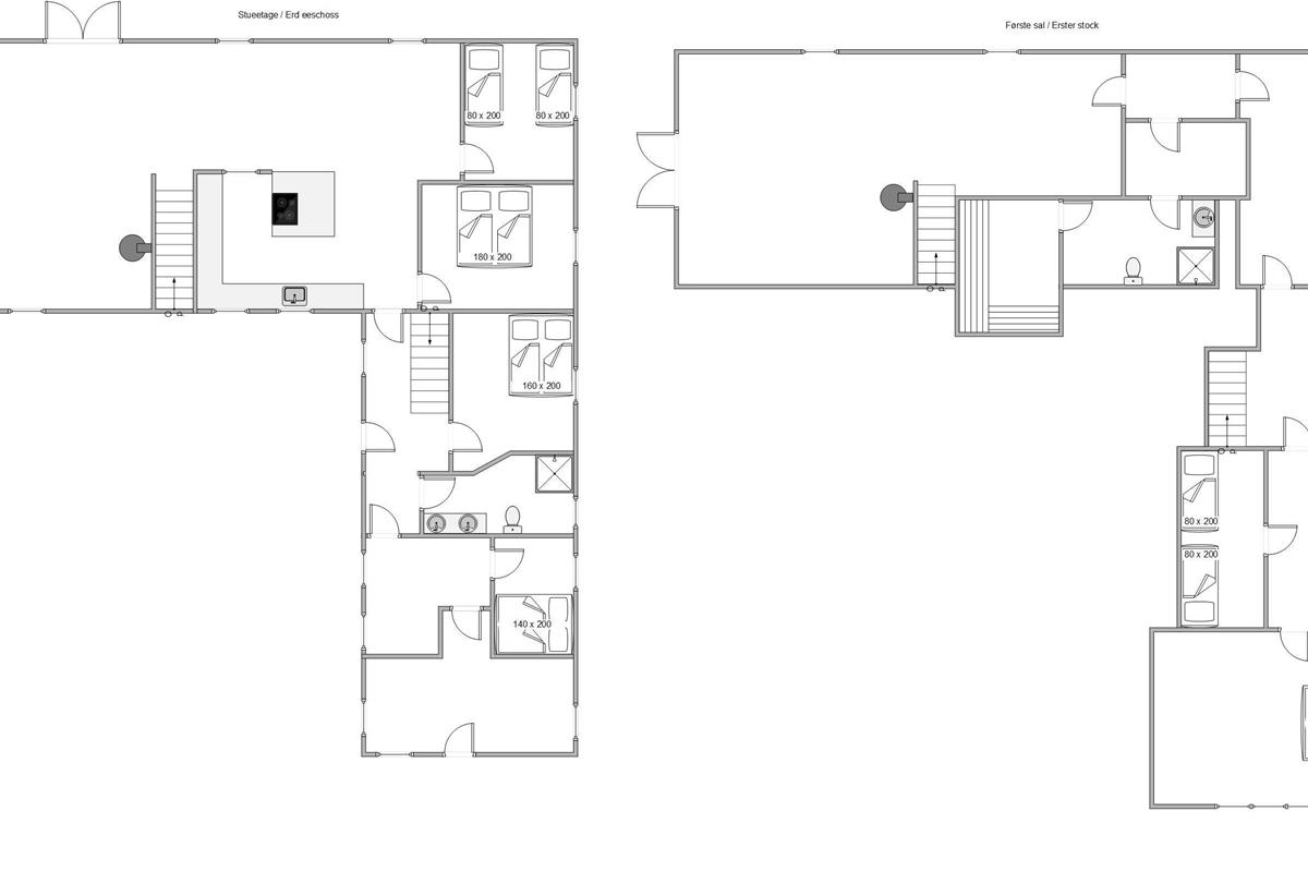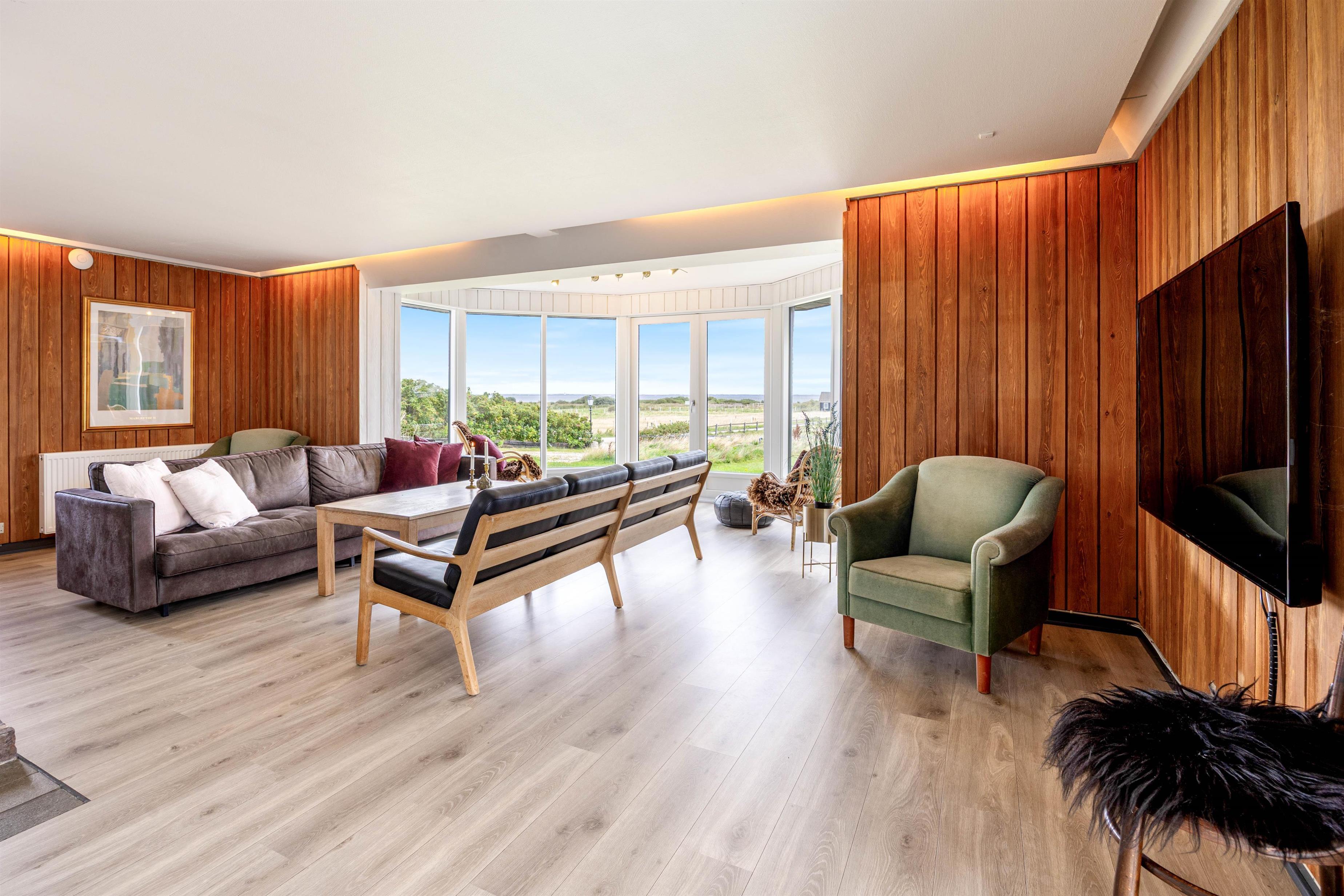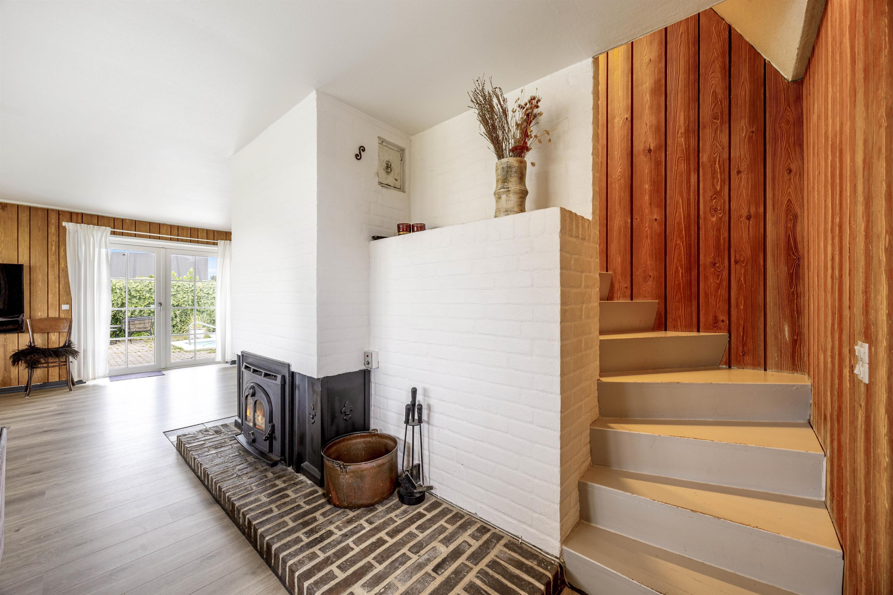 In the living rooms on the ground and first floors, large windows frame the unique fjord views, and you can gather around the wood-burning stove. The holiday home's original character has been preserved throughout: the combination of white walls, original wood panelling, and various wooden and stone floors creates a modern yet cosy atmosphere.