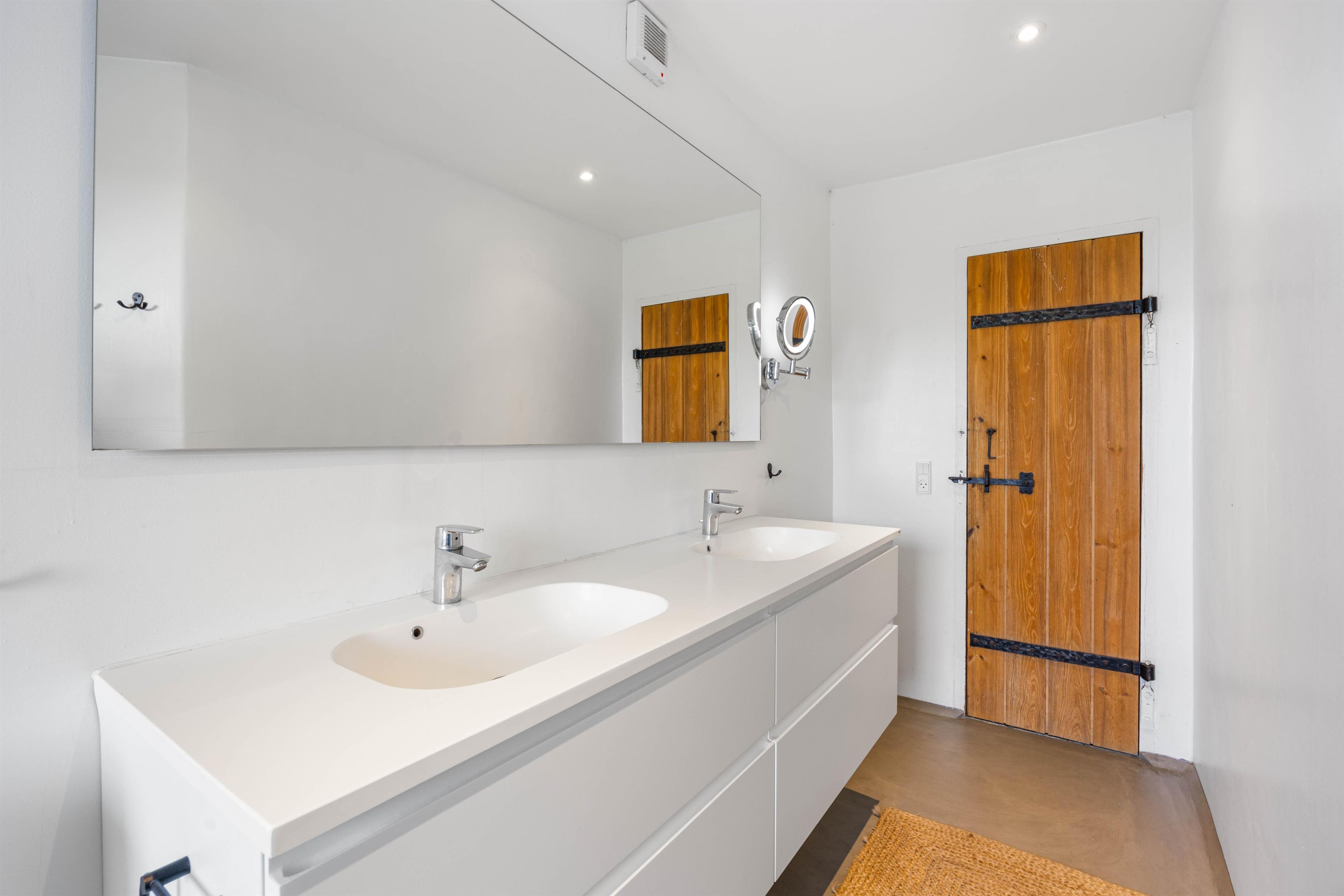 The modern fitted kitchen is generously equipped with two ovens, two fridges with freezer compartments, and a dishwasher. The kitchen opens directly onto the dining area, where all guests can gather around the long dining table for meals. From here, you have direct access to the large terrace with the outdoor pool.