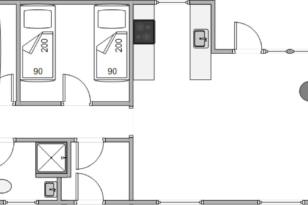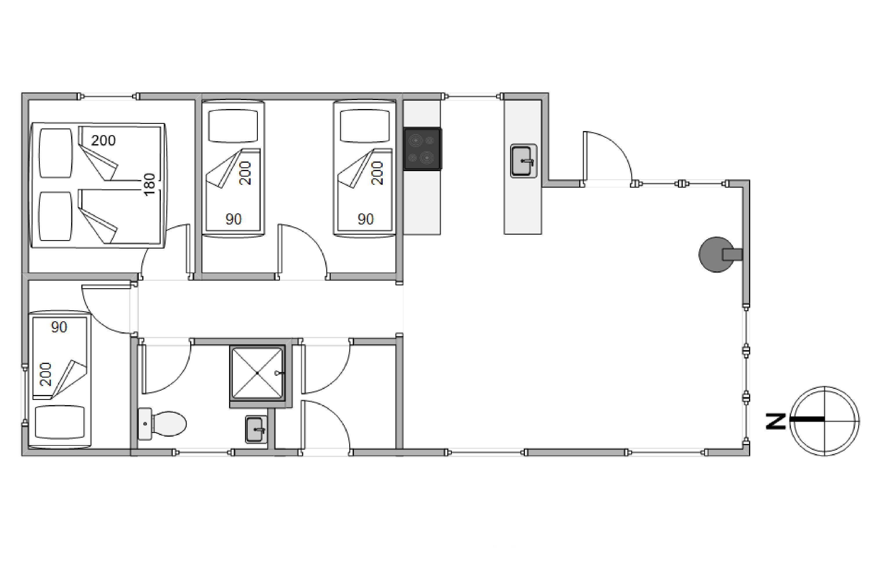The 60-square-metre holiday home comprises a living room with integrated kitchen, one bathroom with underfloor heating, and three bedrooms.