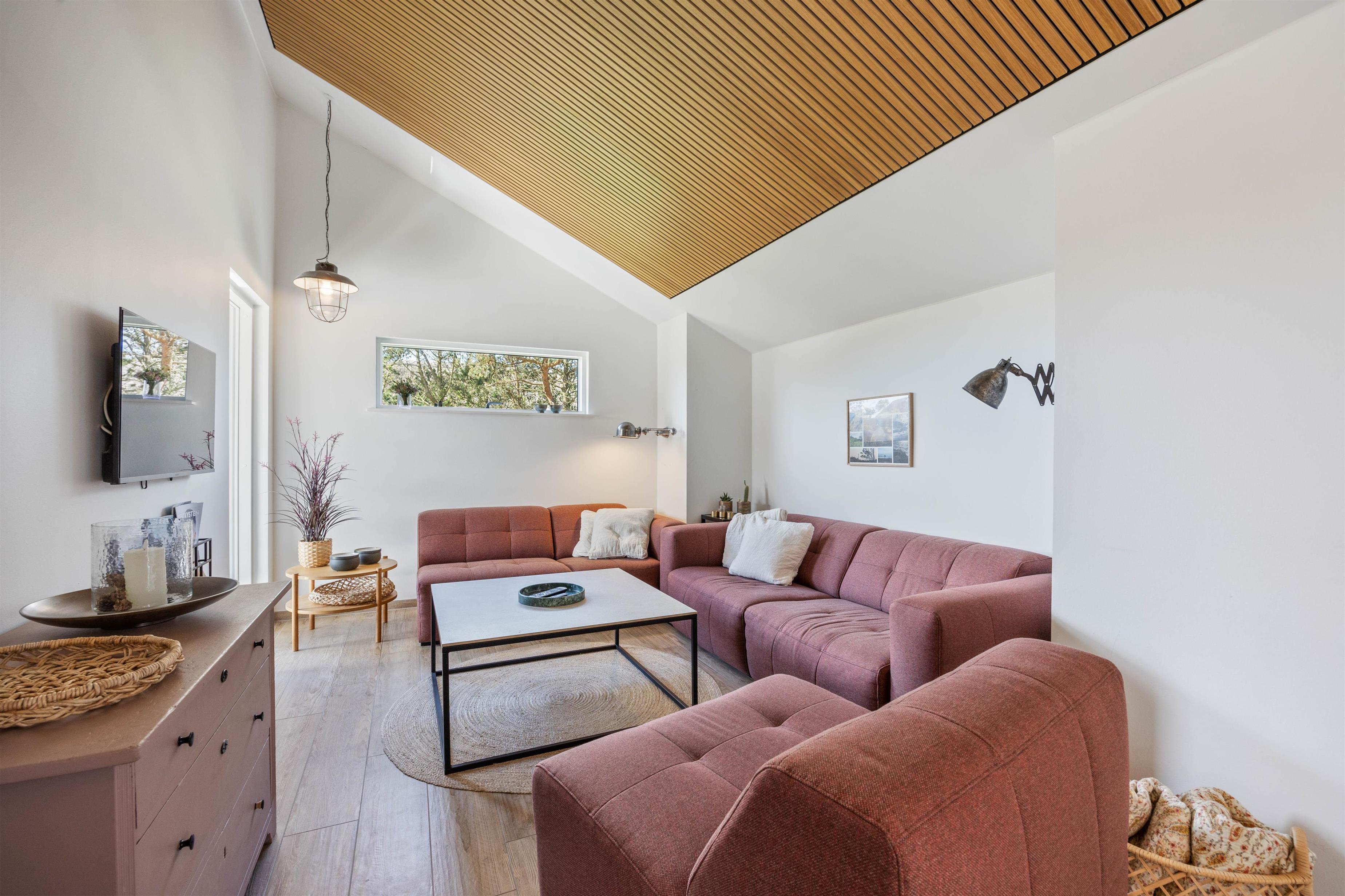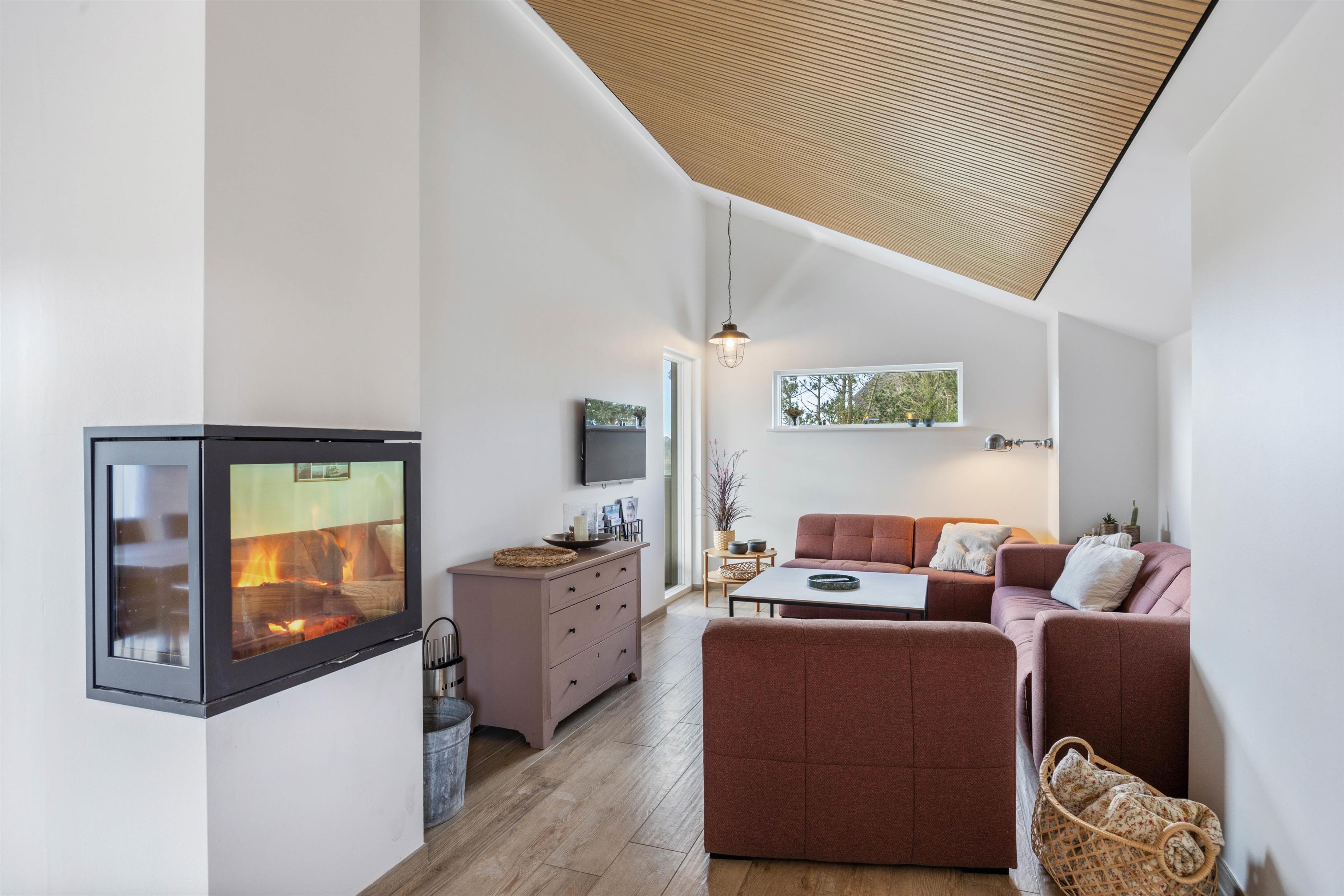 The house is bright throughout, featuring easy-care tiled floors with underfloor heating, large windows and comfortable furniture in earth tones. The family gathering point is the open-plan living area, where the living room, dining area and kitchen share one space. Both the dining table and corner sofa offer views of the crackling wood-burning stove in the centre of the room.