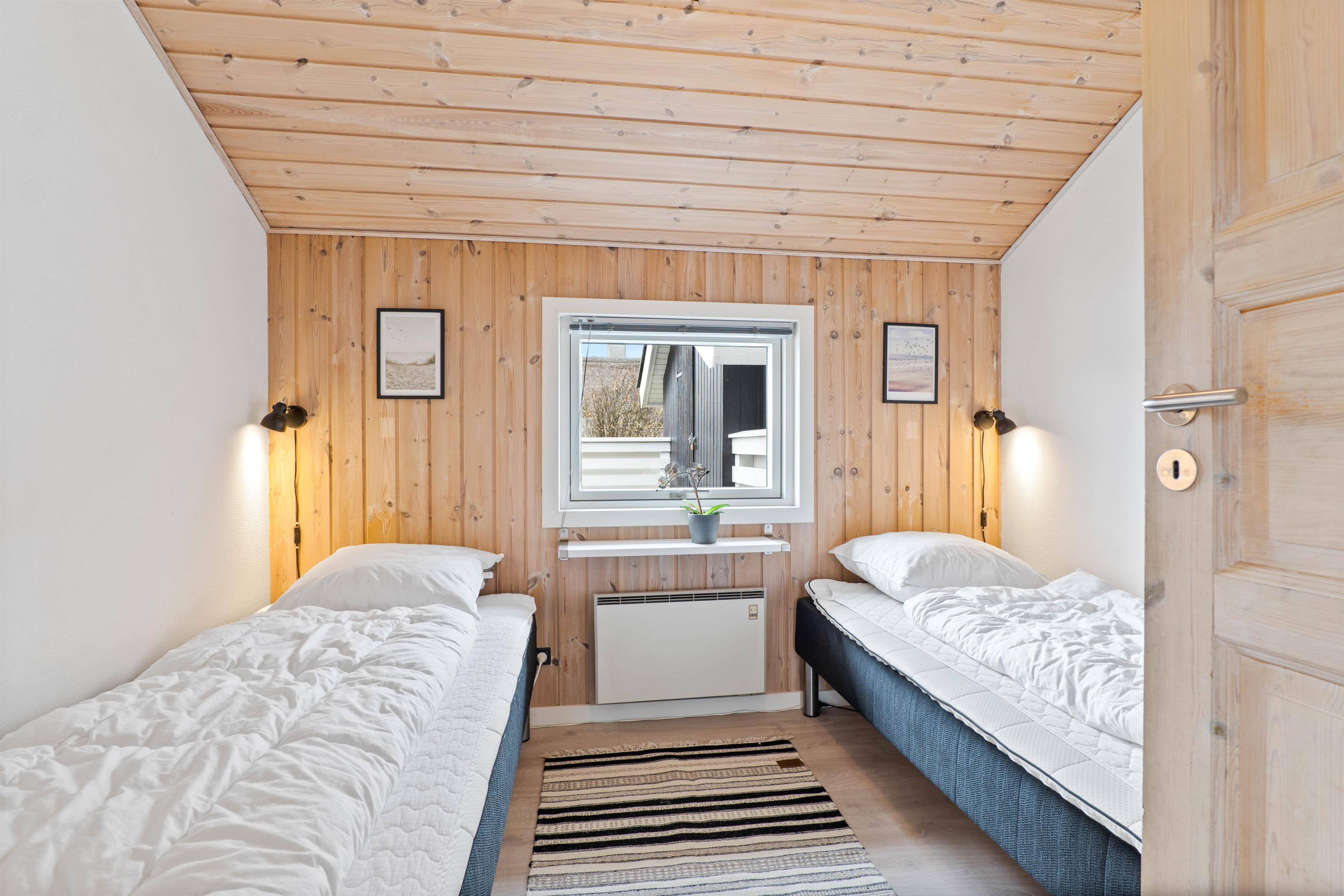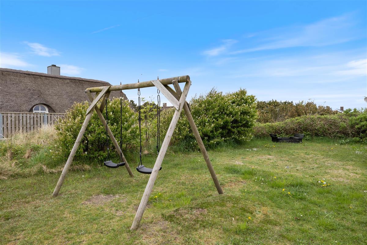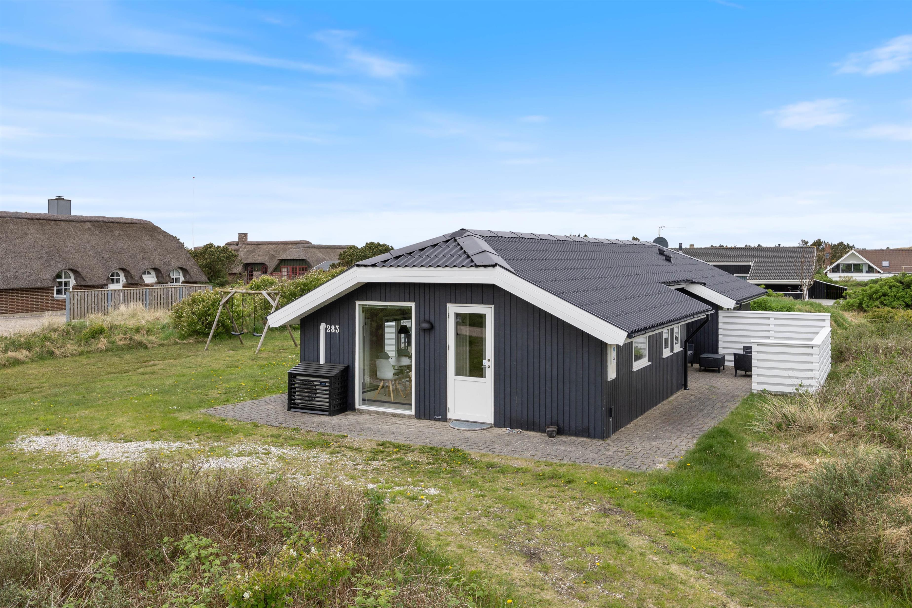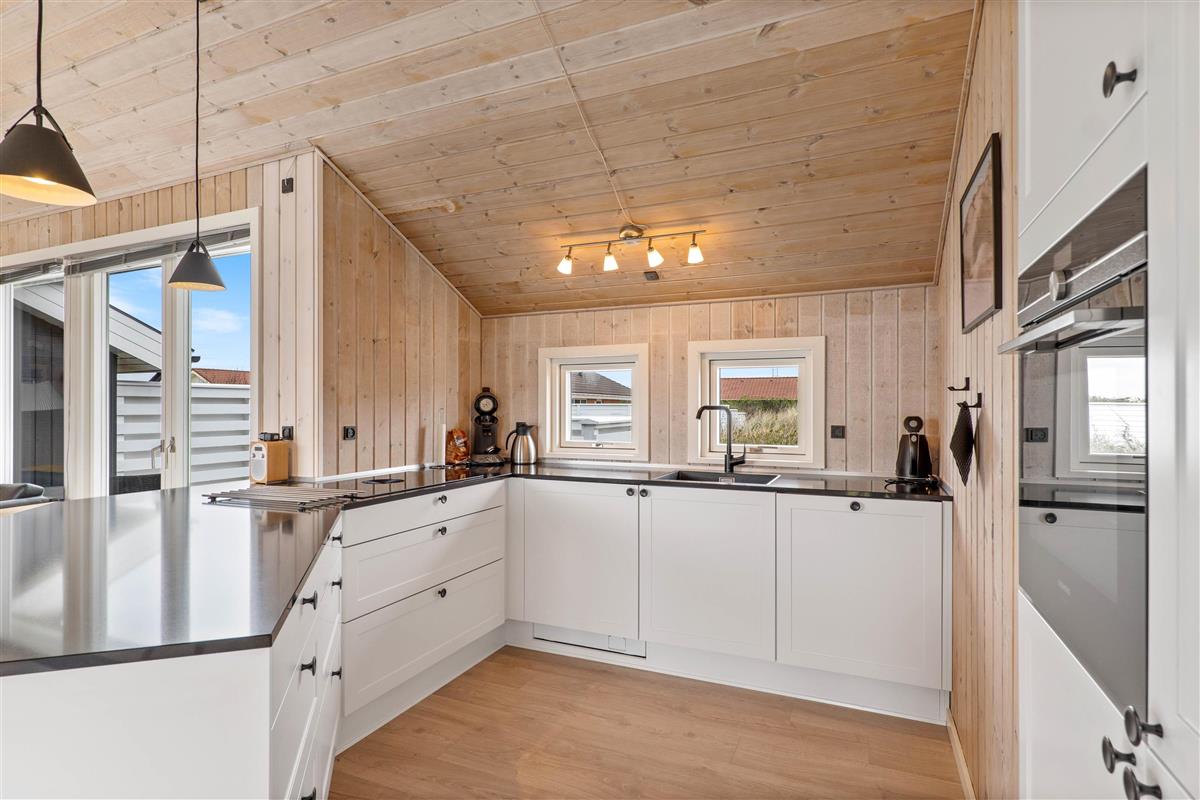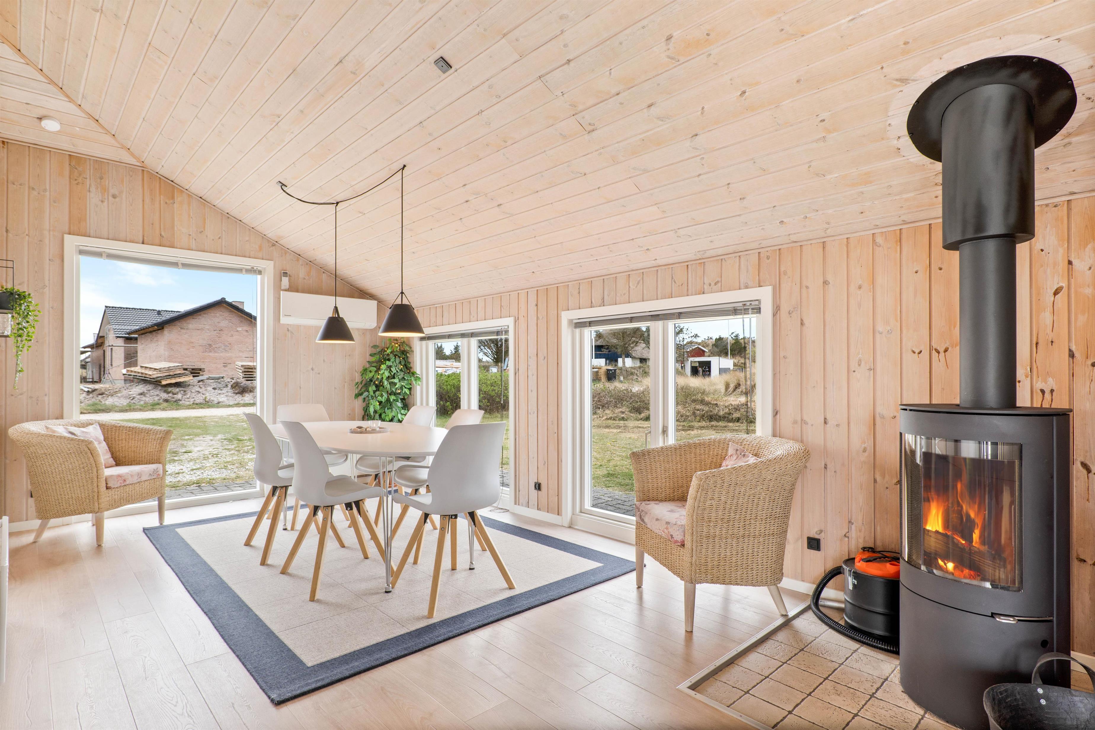 Renovated in 2021, this holiday home at Fyrmarken 283 features classic interior styling with wooden ceilings and walls, which, together with the wood-burning stove, create an authentic holiday atmosphere. Large windows throughout the house flood the rooms with natural light and sunshine whilst offering views of the beautiful dune landscape. Complimentary fibre optic broadband ensures fast internet connection during your stay. The holiday home is equipped with all practical necessities, including a dishwasher and washing machine, making your holiday chores easier.