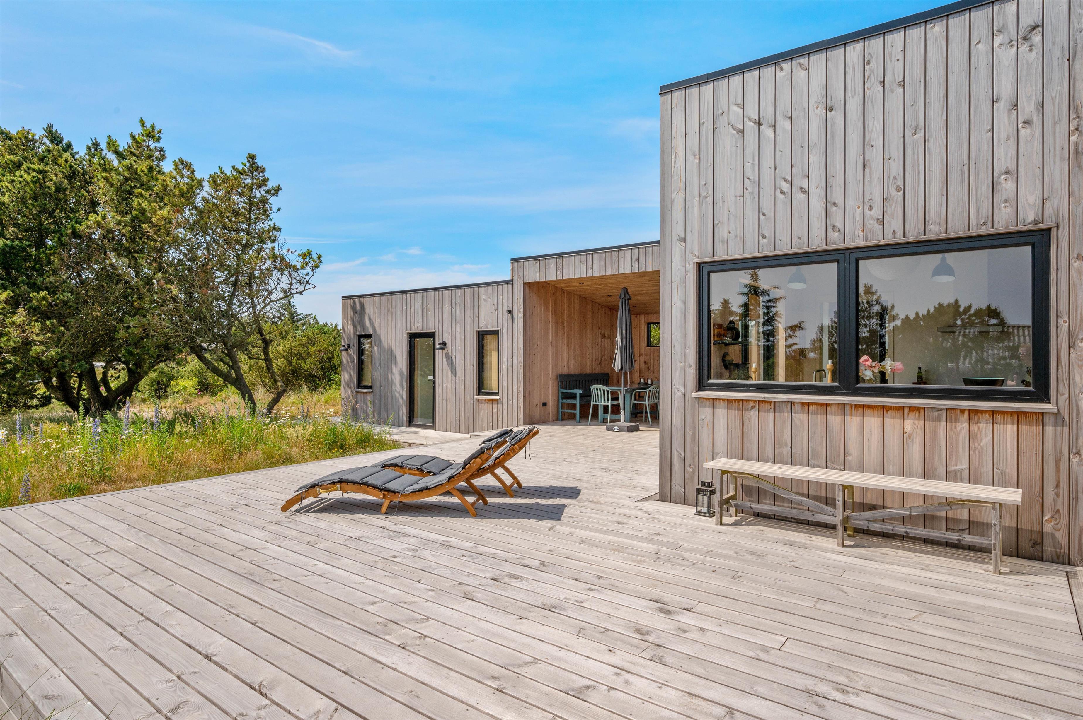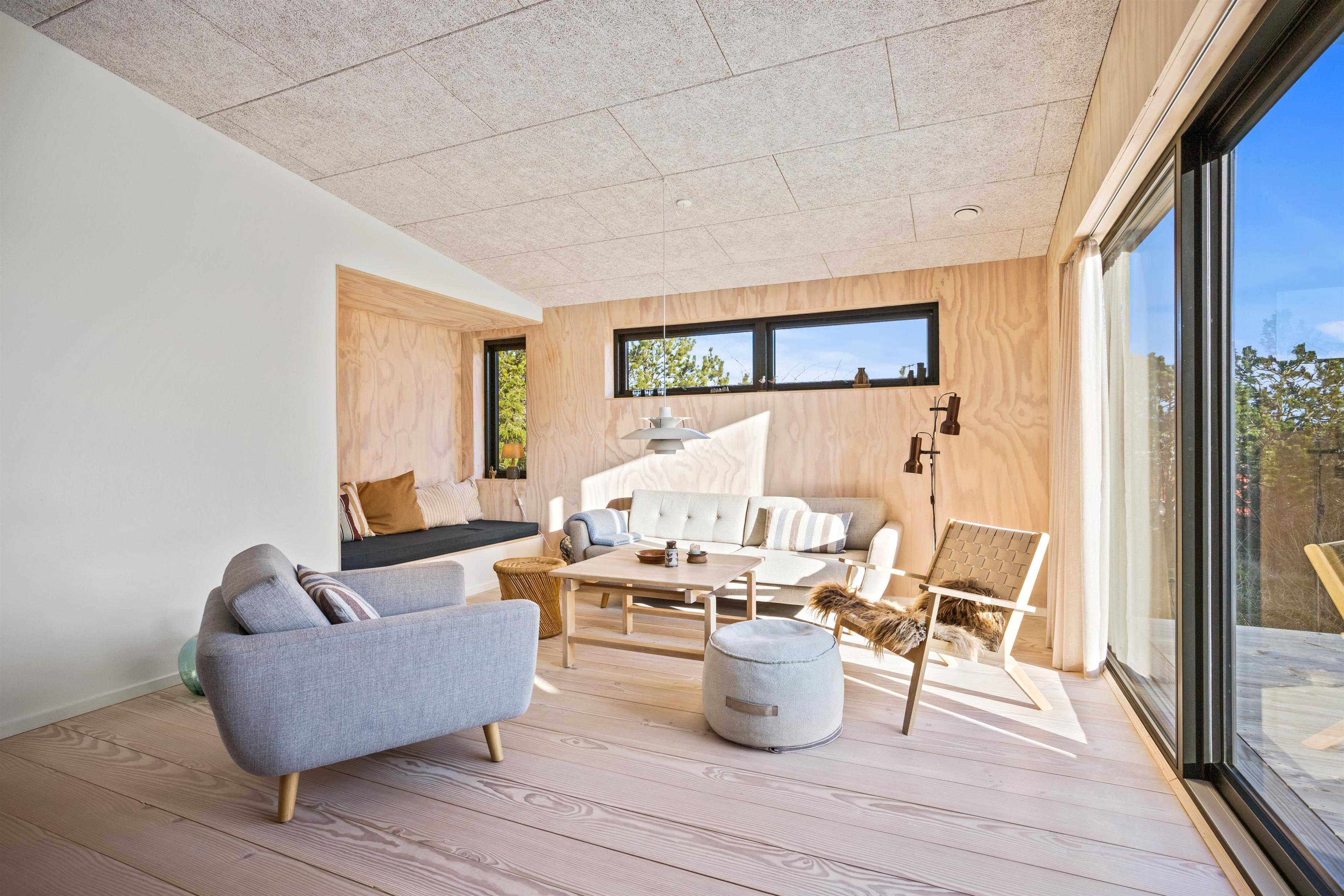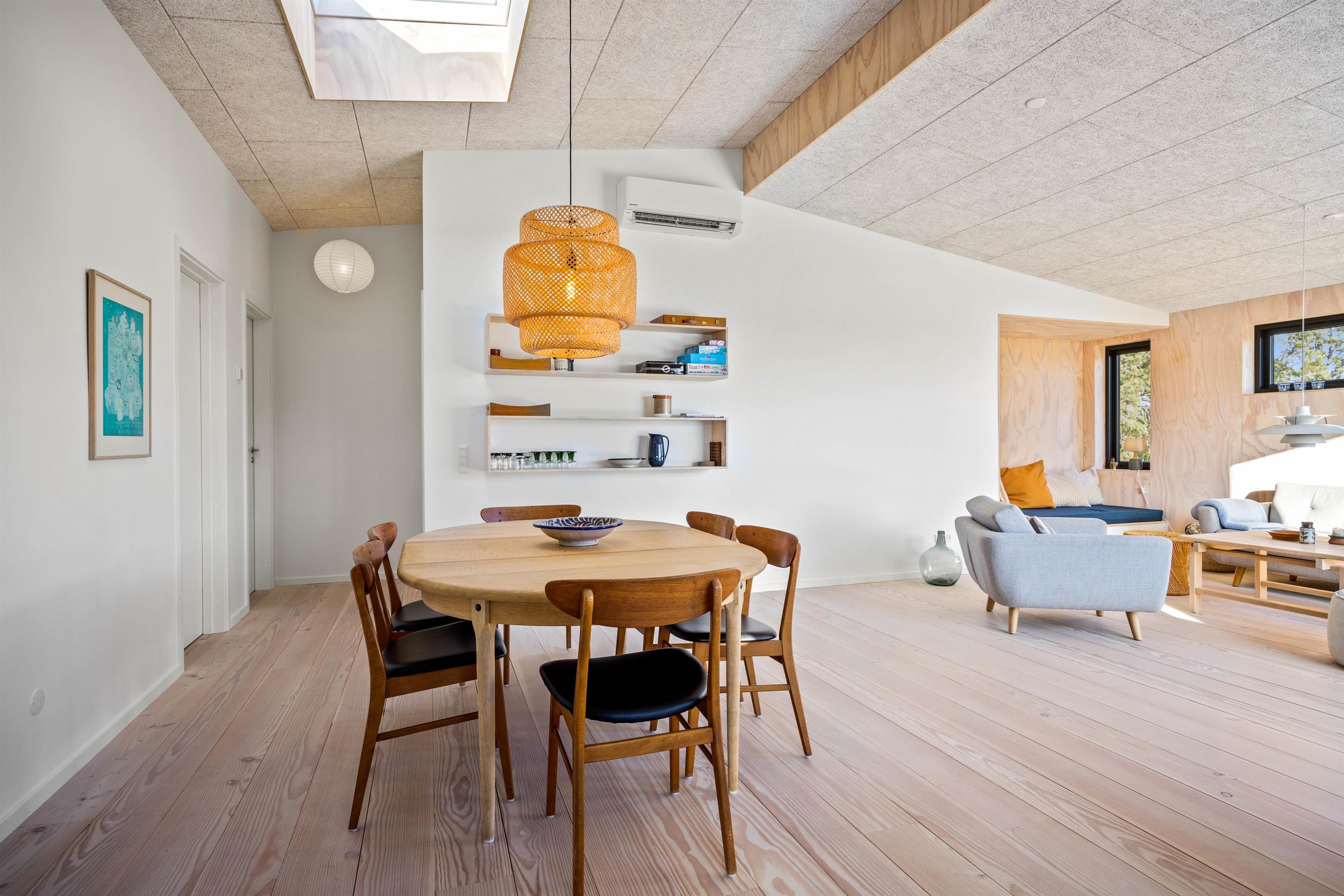 Built in 2021, this holiday home is situated in the beautiful West Jutland heath landscape, which is reflected in its interior design. Natural materials and calm colours create a peaceful and cosy atmosphere throughout. The heart of the holiday home is the spacious open-plan living area with kitchen and lounge, offering plenty of space for the whole family. An energy-efficient air-to-air heat pump provides comfortable heating. While some family members prepare delicious meals in the kitchen, others can enjoy reading in the cosy sleeping nook, and after dinner, everyone can gather in the sofa corner for games night or stream favourite films via Chromecast. In addition to the generous living room, the holiday home features two bathrooms, three bedrooms and a utility room with washing machine. The bathrooms benefit from underfloor heating for year-round comfort. Two bedrooms feature double beds, while the third has a 140 cm x 200 cm bed. Two bedrooms include fitted wardrobes for storage.