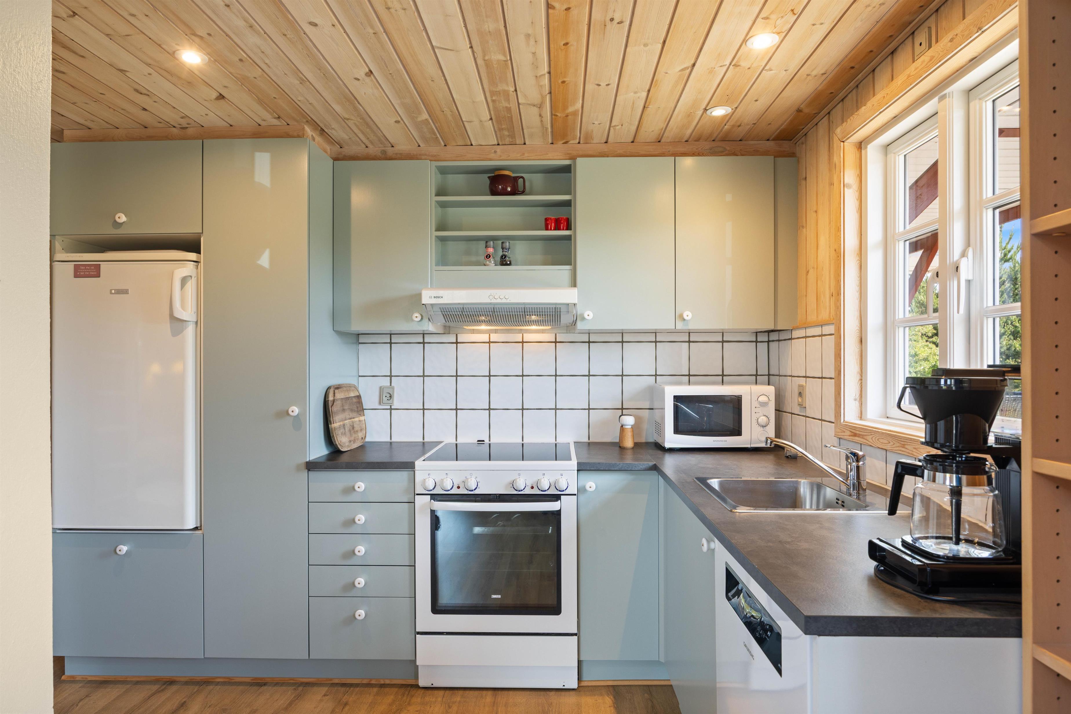 The kitchen is well-equipped with a dishwasher, microwave and an additional 90-litre freezer. You'll find everything you need to prepare delicious meals. The adjoining dining and living room offers plenty of space to gather together, watch television and relax by the wood-burning stove.