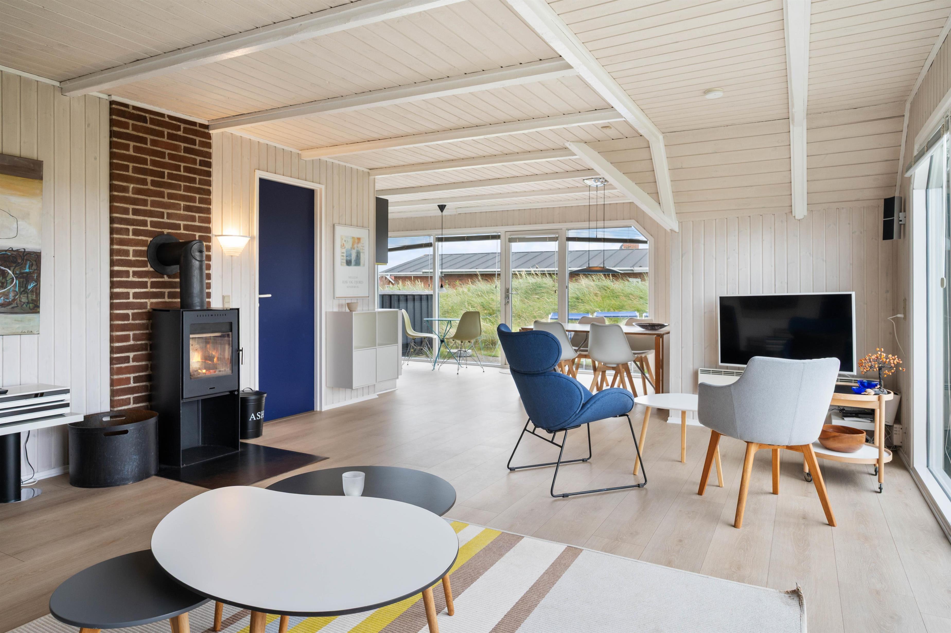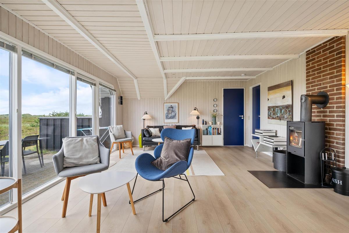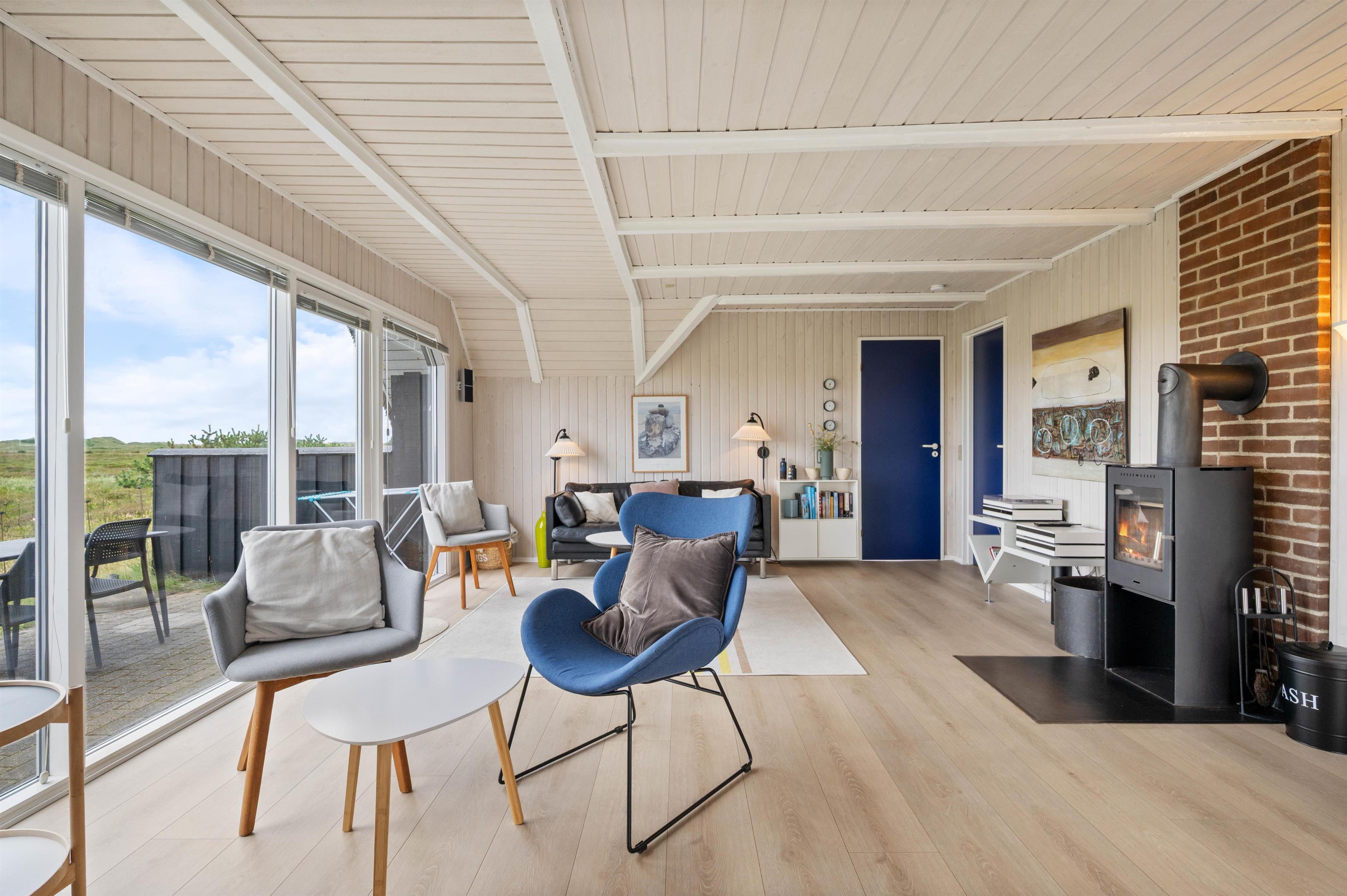 The numerous large windows let in every ray of sunshine and offer beautiful views regardless of the weather. From the house, you have a fantastic view of the dune landscape, and you can even see the lighthouse from the sofa. During the cooler months, you can light the wood-burning stove, listen to its crackling, and enjoy the view.