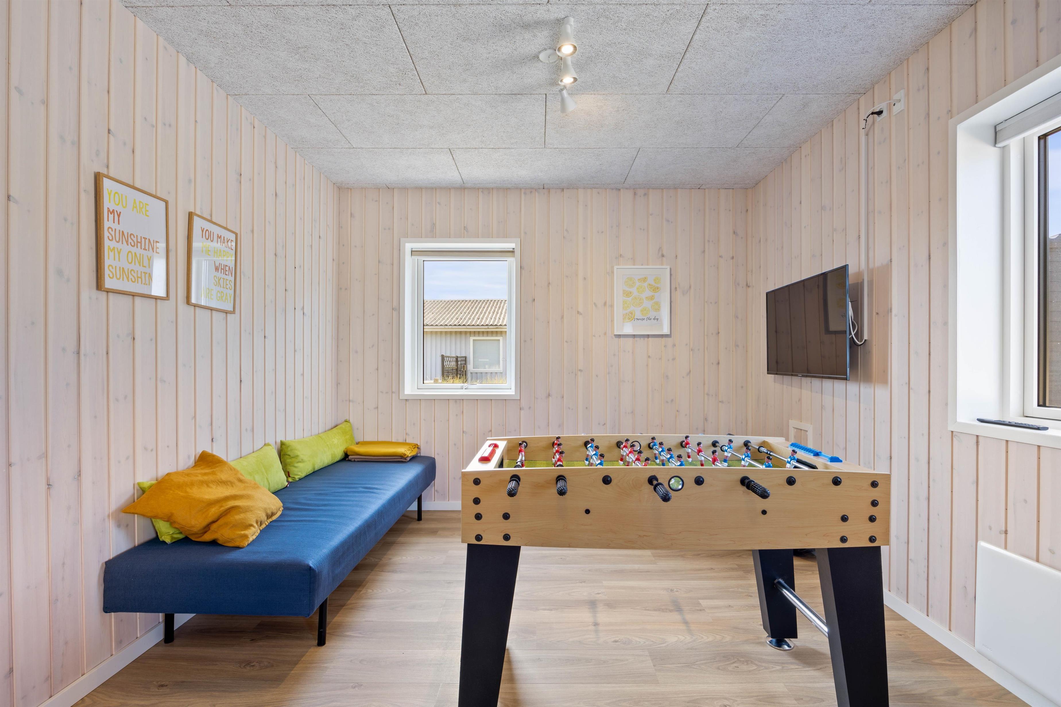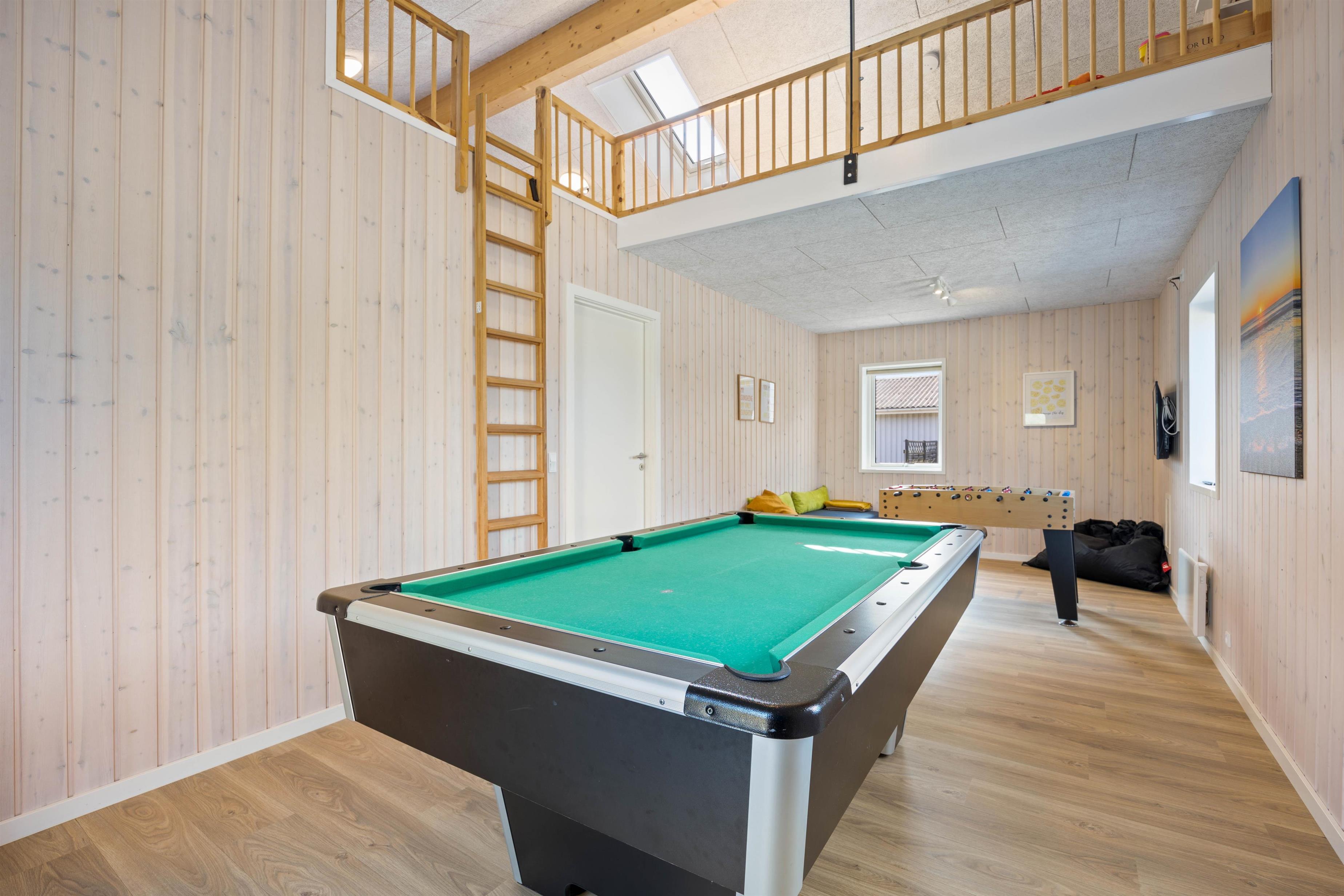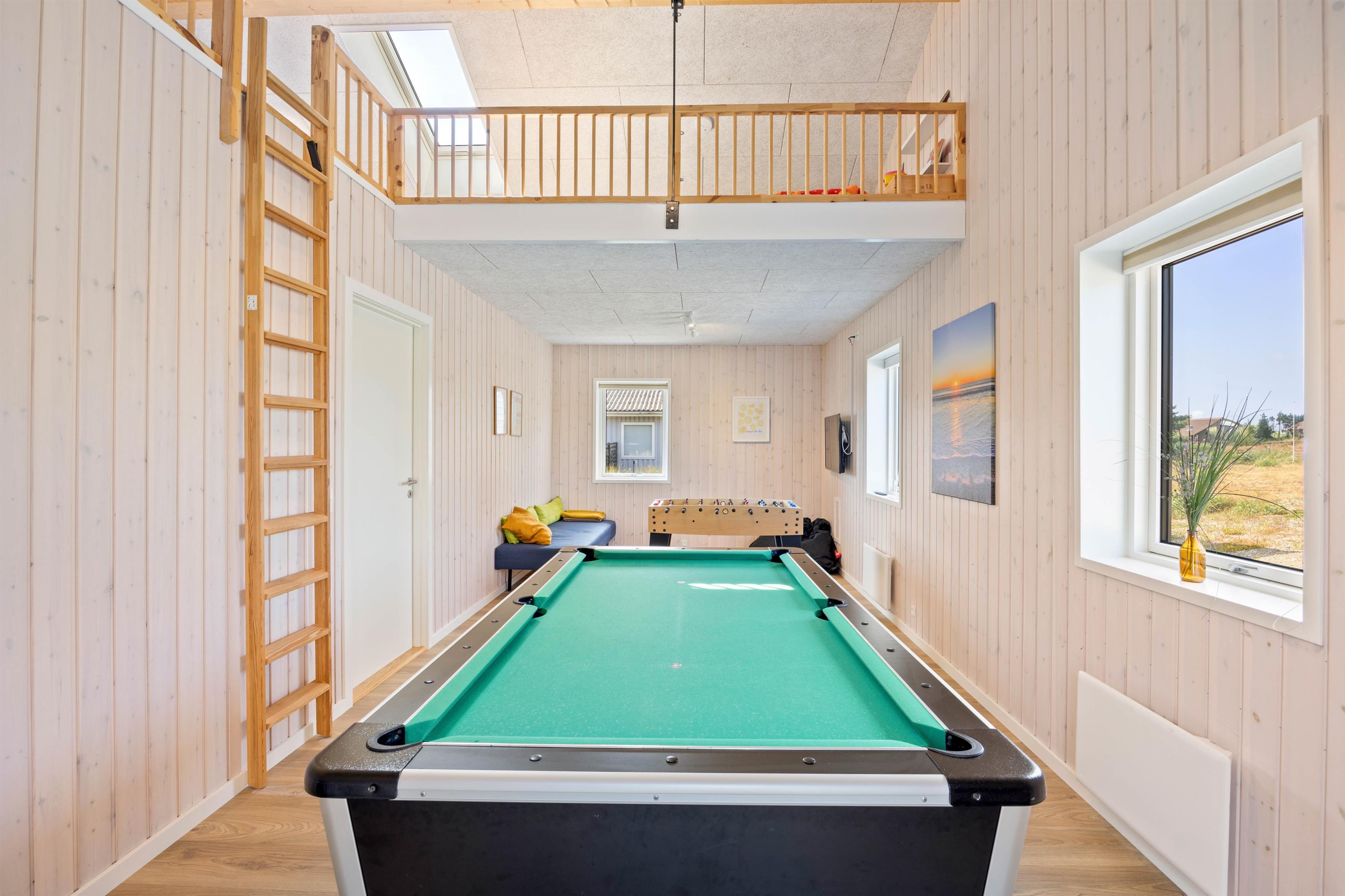 The holiday home features five bedrooms, a mezzanine sleeping area particularly suitable for children, two bathrooms, and a spacious living area with an open-plan kitchen at the heart of the house. There's also a games room equipped with table football and pool table where children can relax and have their own space. The games room includes an additional television.
