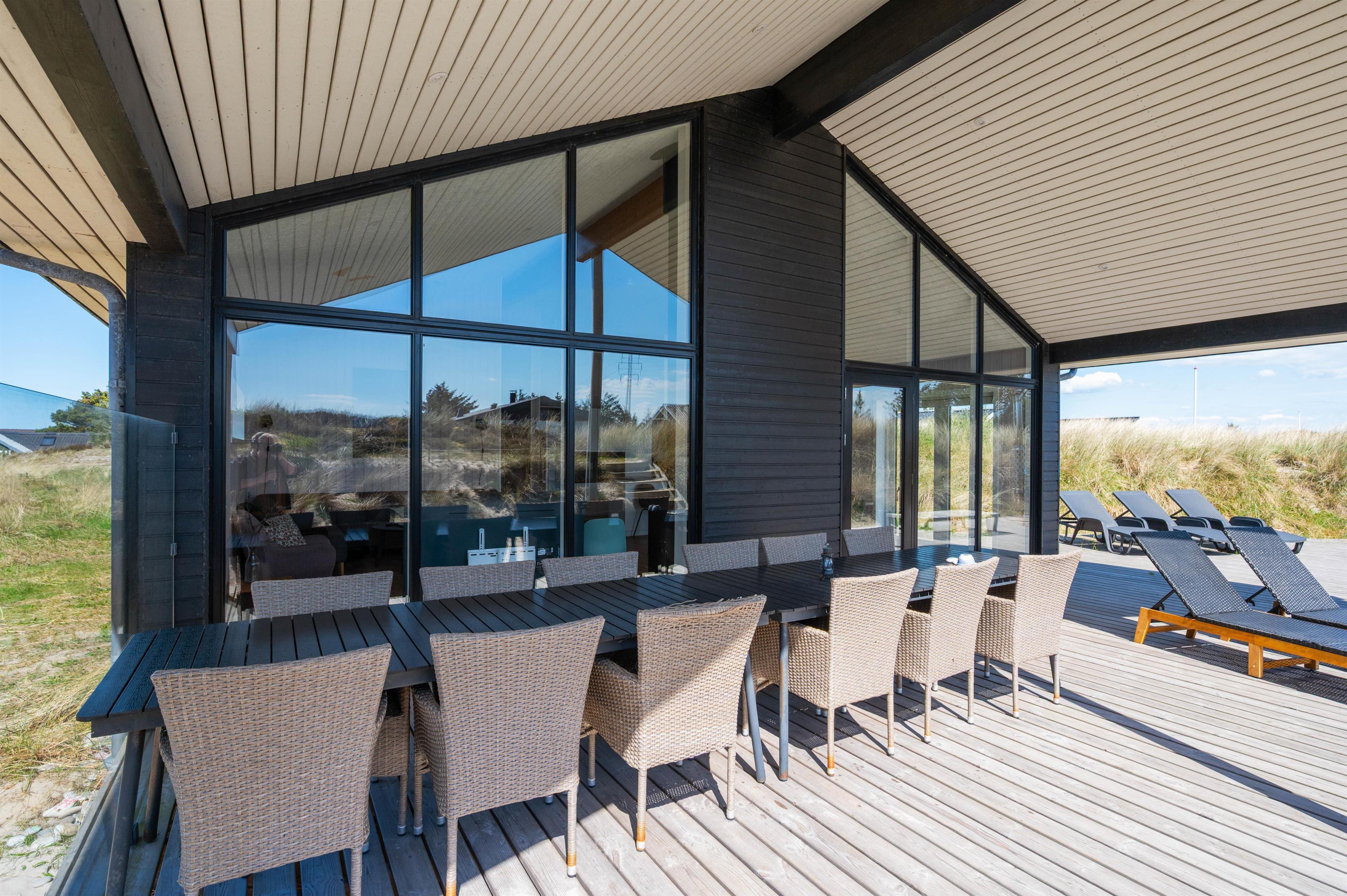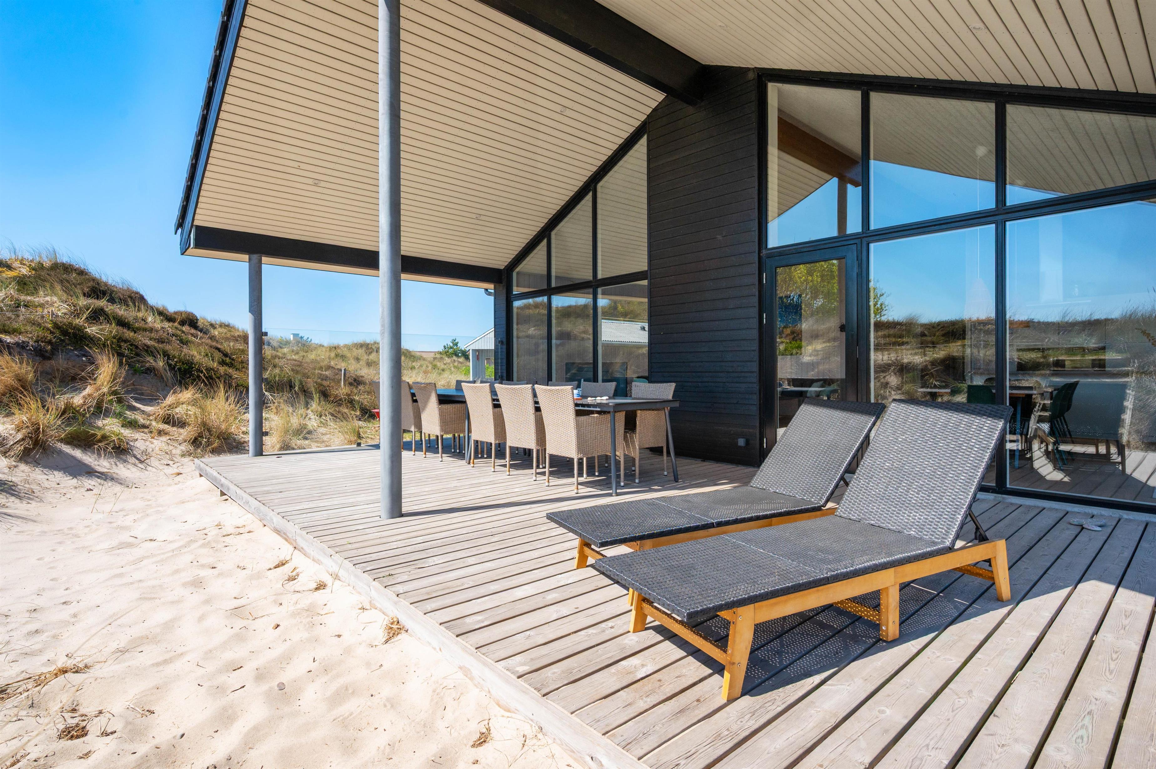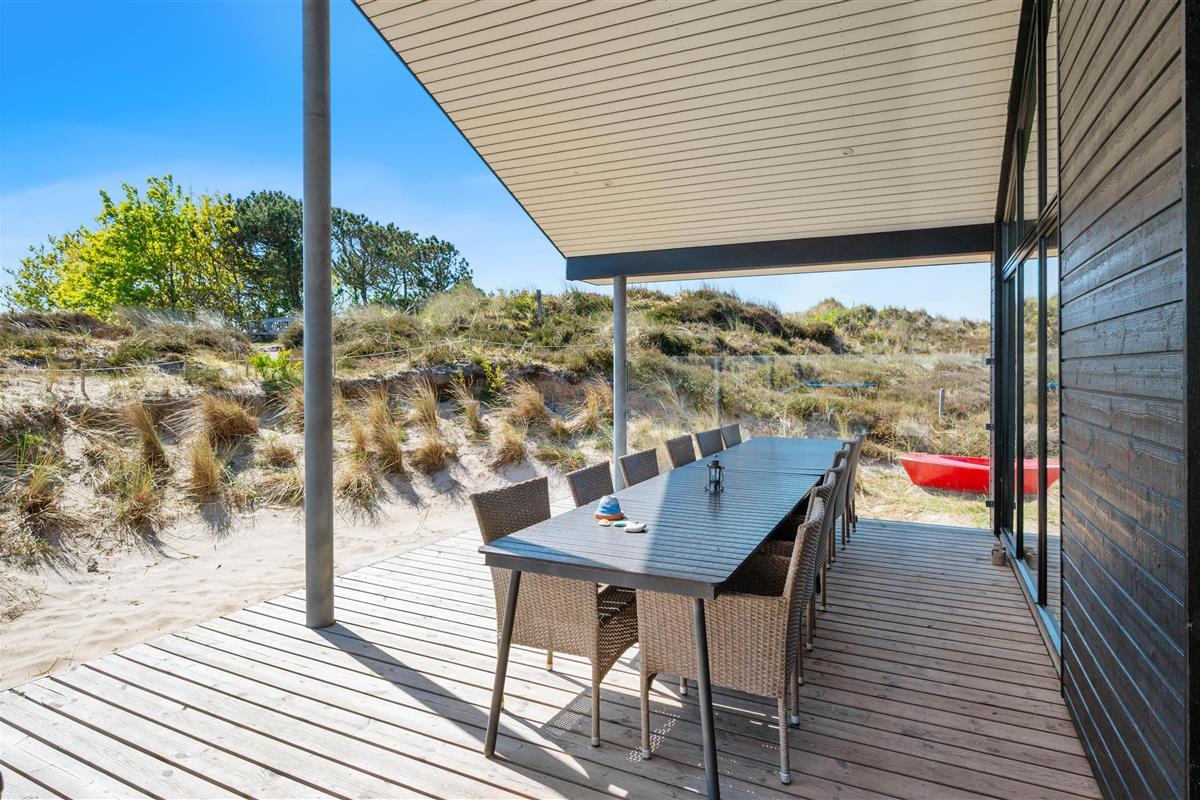 Three sides of the holiday home are surrounded by a solid wooden terrace, where you'll always find a comfortable and sunny spot to relax. The partially covered area offers both weather protection and shade for when the summer sun becomes too intense. Besides the terrace, the holiday home features a large area of fine beach sand, providing children with plenty of play opportunities.