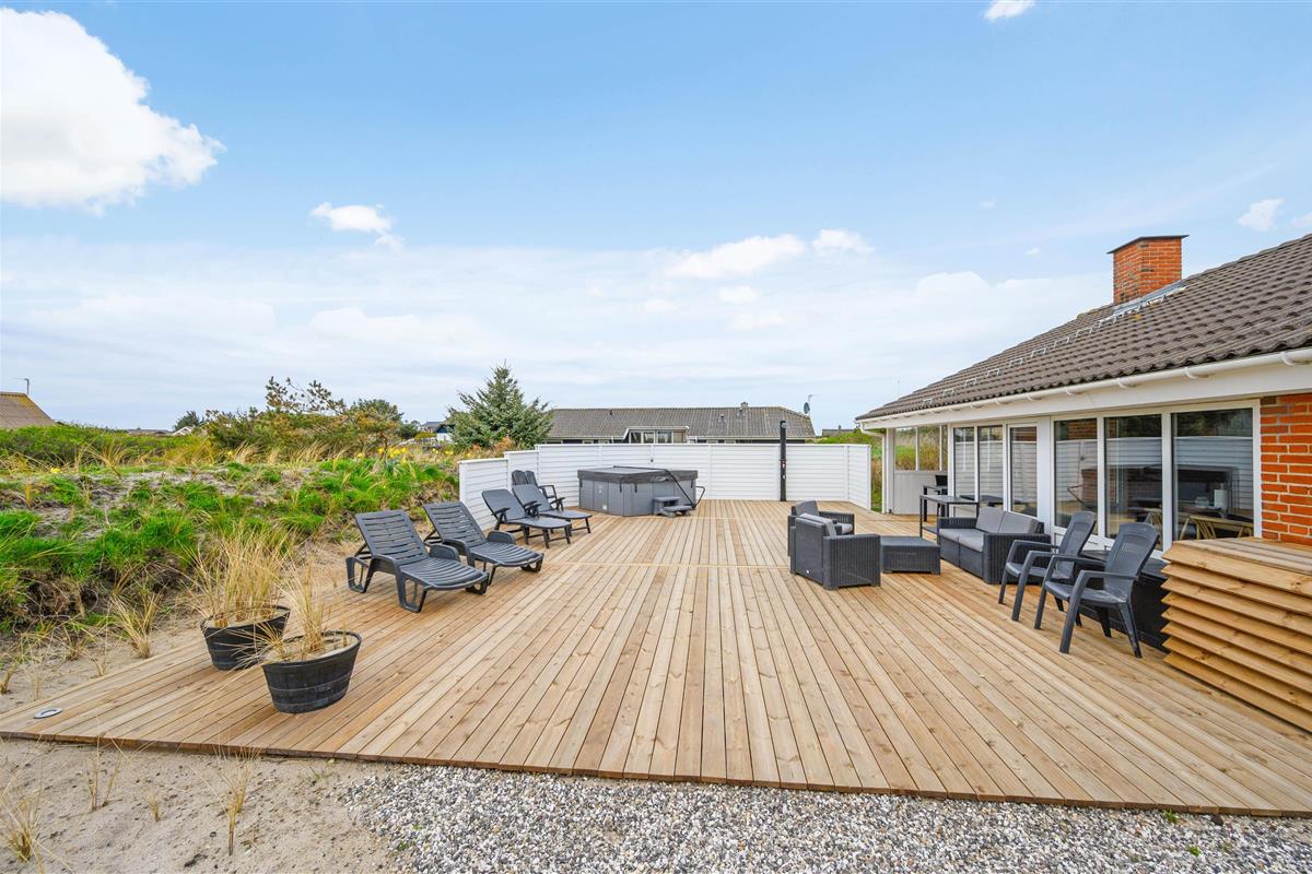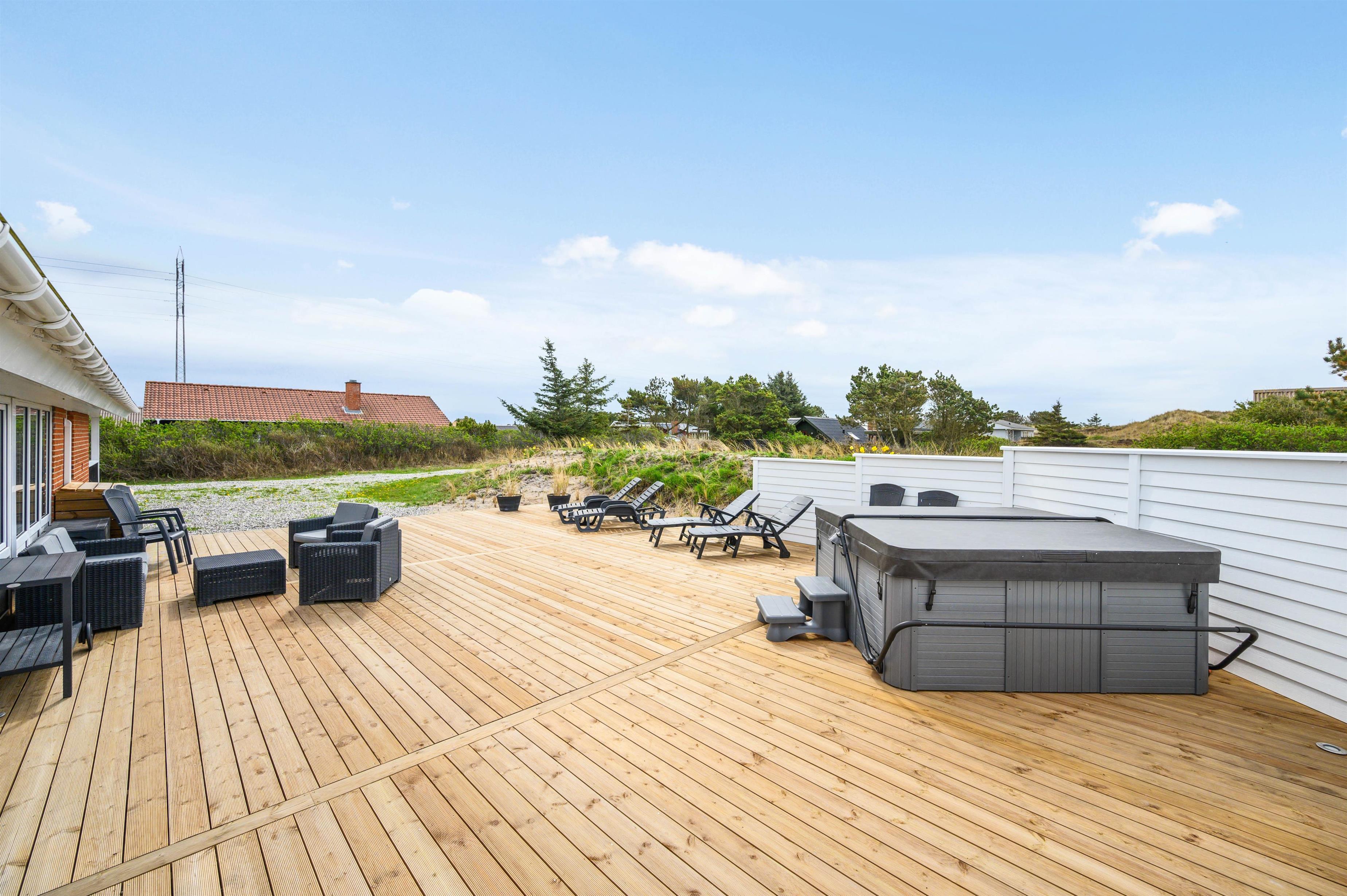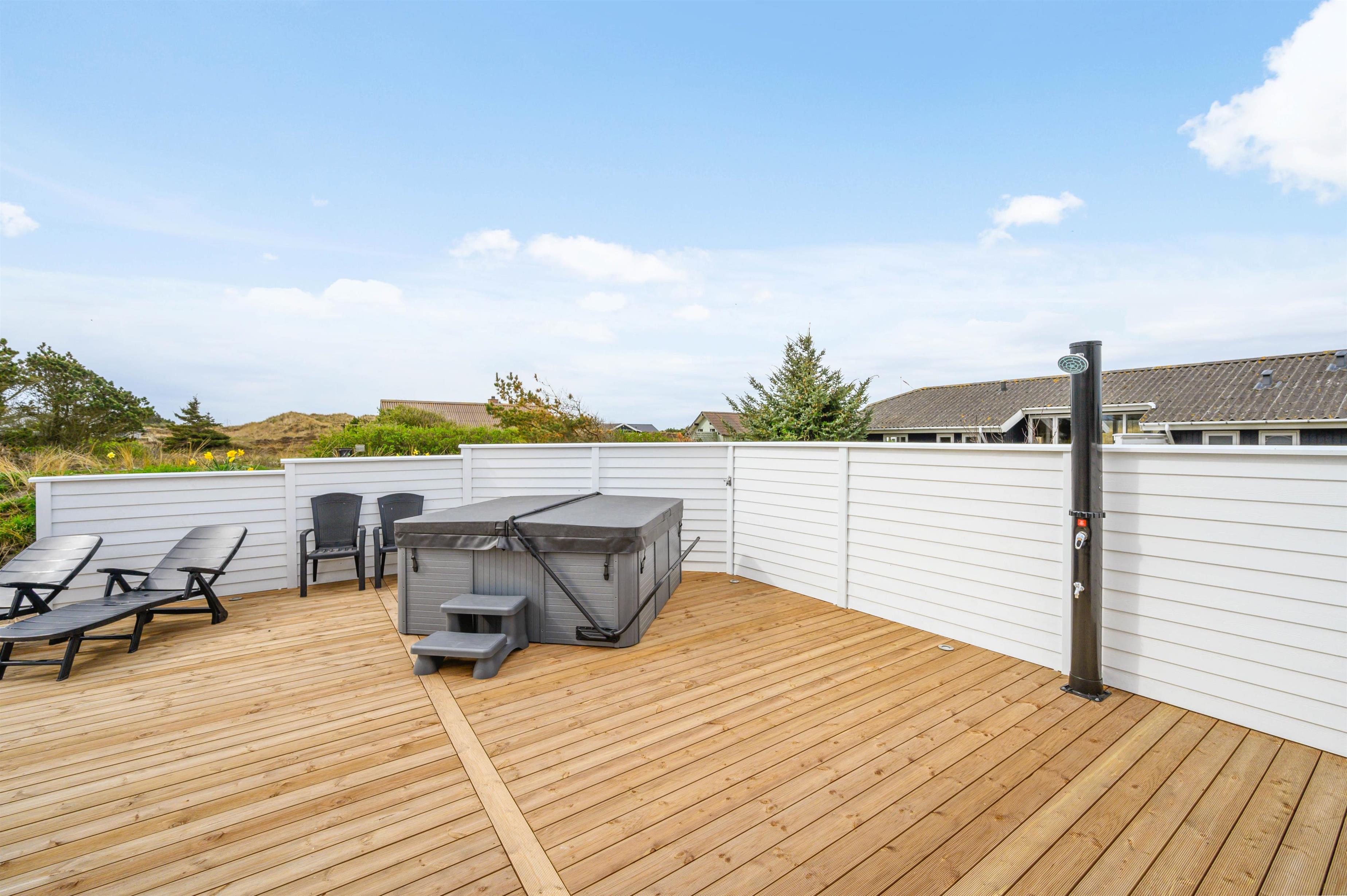Outside, you can relax in the hot tub whilst enjoying the fresh North Sea air. We recommend experiencing the starlit sky from the hot tub - it's truly memorable. Alongside the hot tub, the terrace features an outdoor shower available from April to November. It's perfect for rinsing sandy feet after trips to the North Sea, just 600 metres away, keeping sand out of the house. Afterwards, warm up in the sauna.