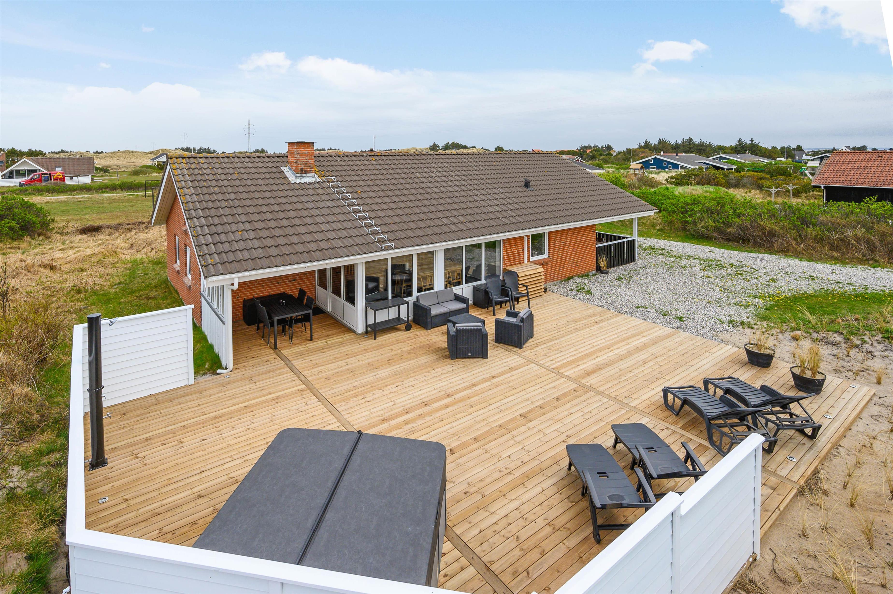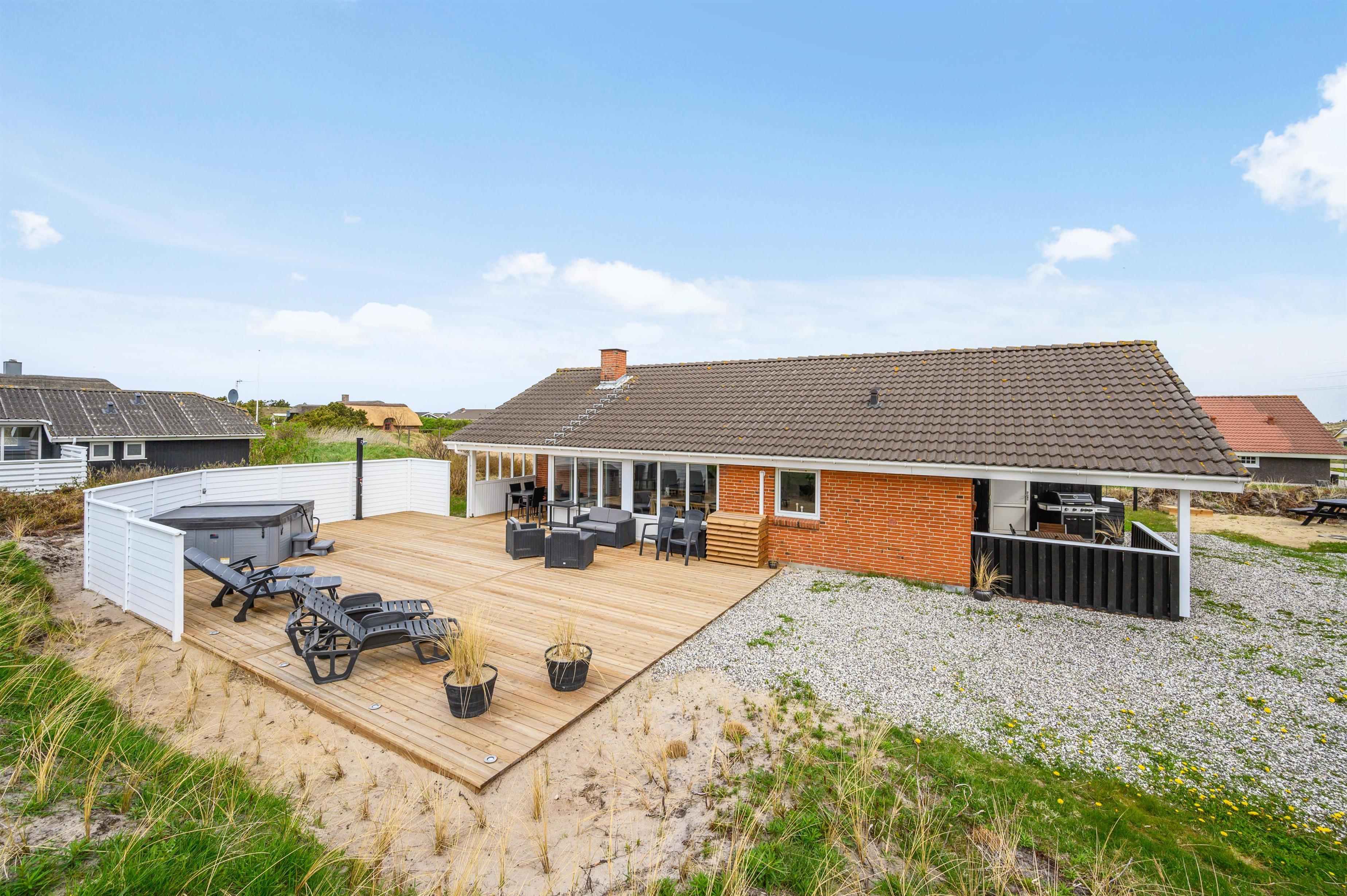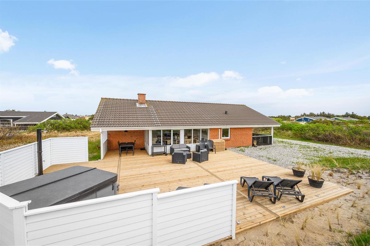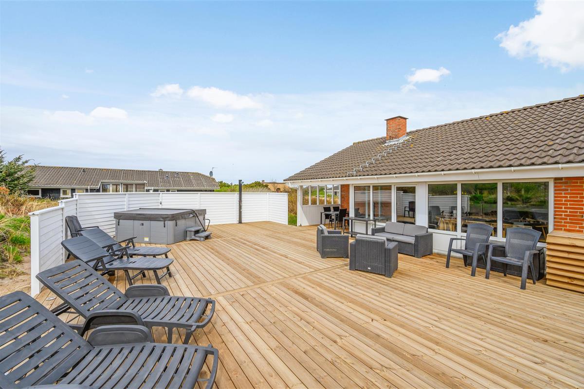 Outside, you can relax in the hot tub whilst enjoying the fresh North Sea air. We recommend experiencing the starlit sky from the hot tub - it's truly memorable. Alongside the hot tub, the terrace features an outdoor shower available from April to November. It's perfect for rinsing sandy feet after trips to the North Sea, just 600 metres away, keeping sand out of the house. Afterwards, warm up in the sauna.