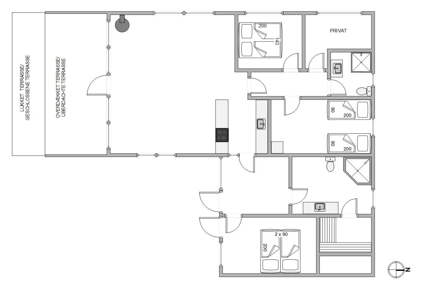 The bright and spacious open-plan living, dining and kitchen area forms the heart of the holiday home. Here you can cook together, sit by the fireplace sharing stories, or enjoy a fun games evening. The holiday home features two bathrooms.