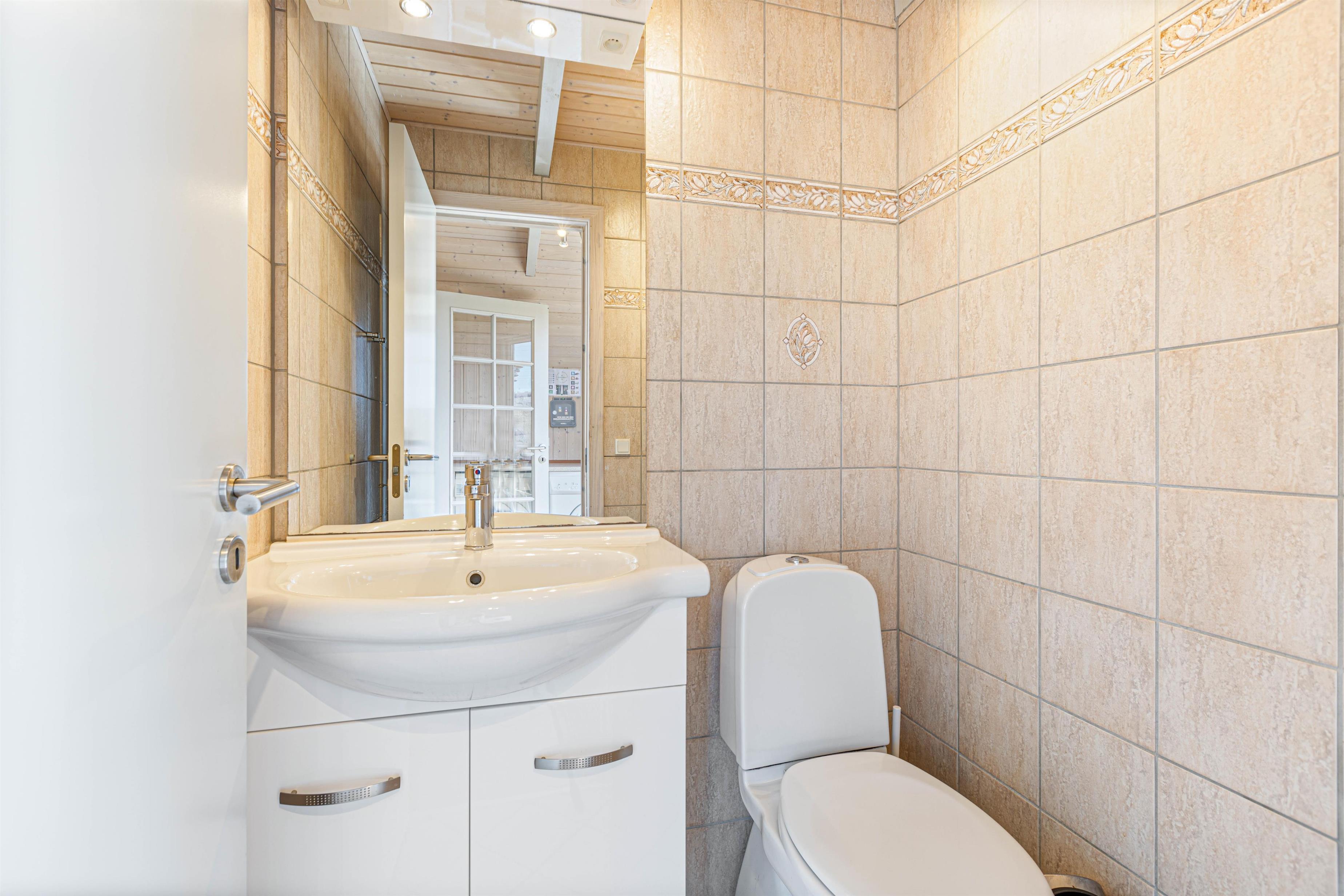 The kitchen, featuring tilt-and-turn windows, is fully equipped with everything you need. The floor is tiled and features underfloor heating, ensuring warm feet throughout your stay.