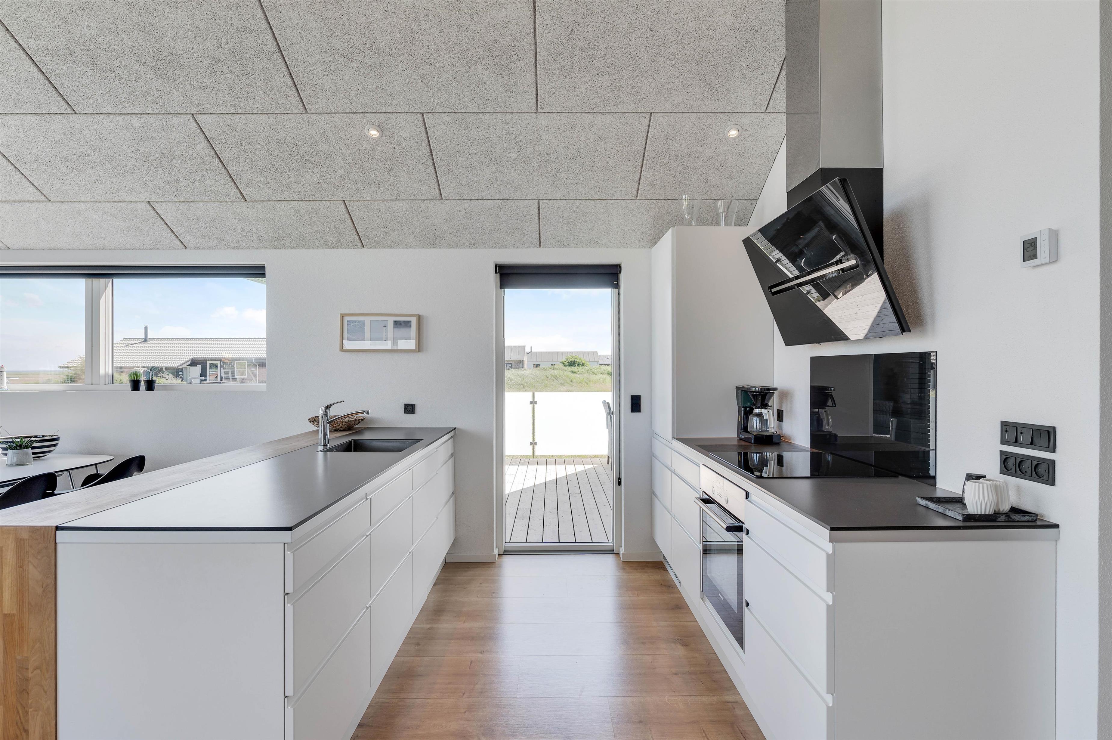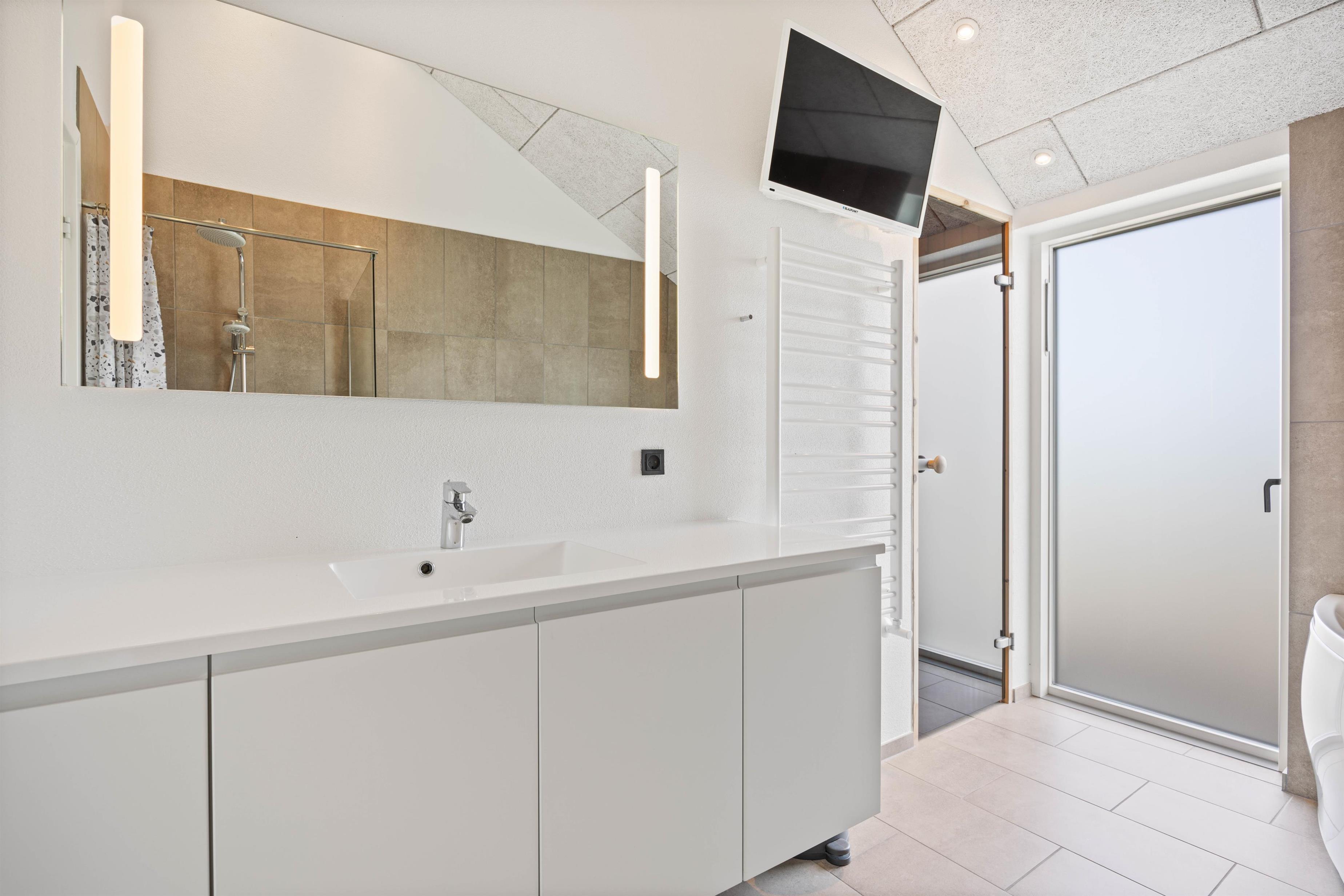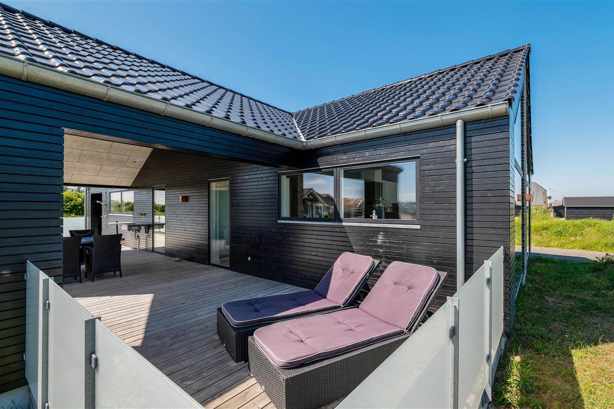 The beautiful south-facing wooden terrace offers opportunities to enjoy fresh air and green surroundings. The terrace features both partially and fully covered areas, catering to all preferences. Make yourself comfortable in the garden furniture and enjoy views towards Ringkøbing Fjord. There's also an outdoor shower and small cleaning station on the terrace.
