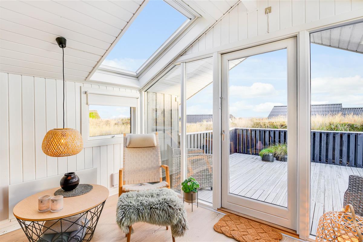 The outdoor area features both a partially covered and enclosed terrace. On sunny days, it's the perfect spot to relax on the garden furniture with a cup of coffee or cold drink while taking in the natural beauty of Denmark's west coast. You can even see Ringköbing Fjord from here.