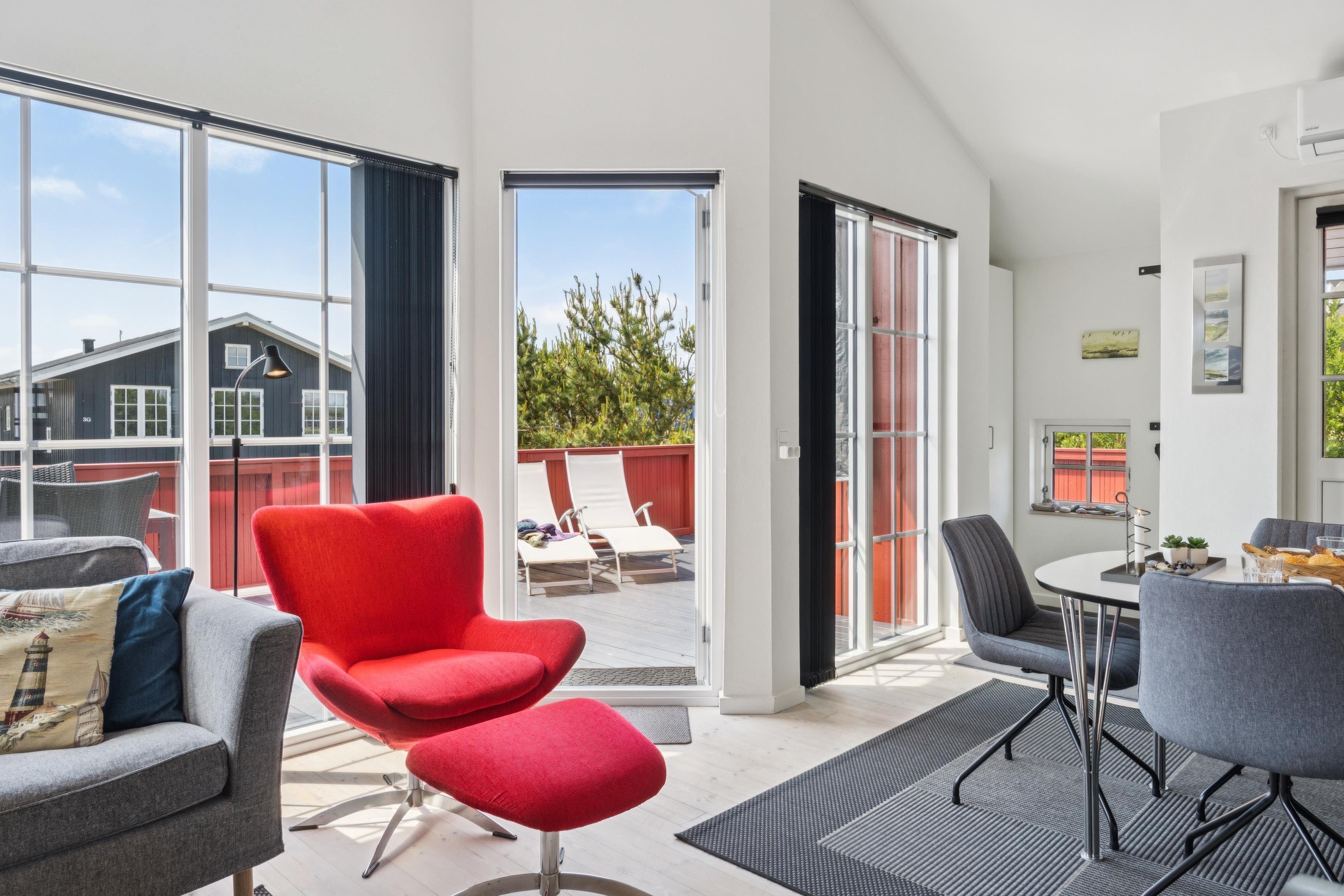 From the living room you can access a large, sunny south-facing terrace, where there is a table with comfortable chairs and a barbecue. Relax in the sun on the sun loungers provided or barbecue together under the open sky. For families with children, there is a nearby playground with swings and football goals.