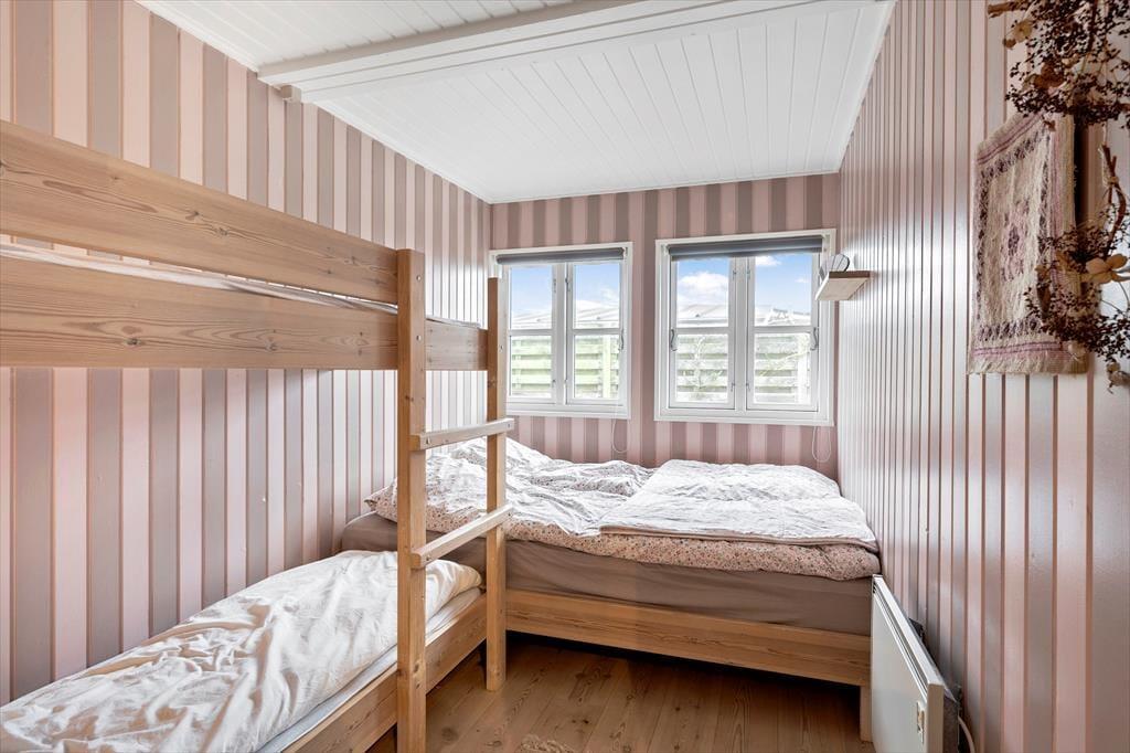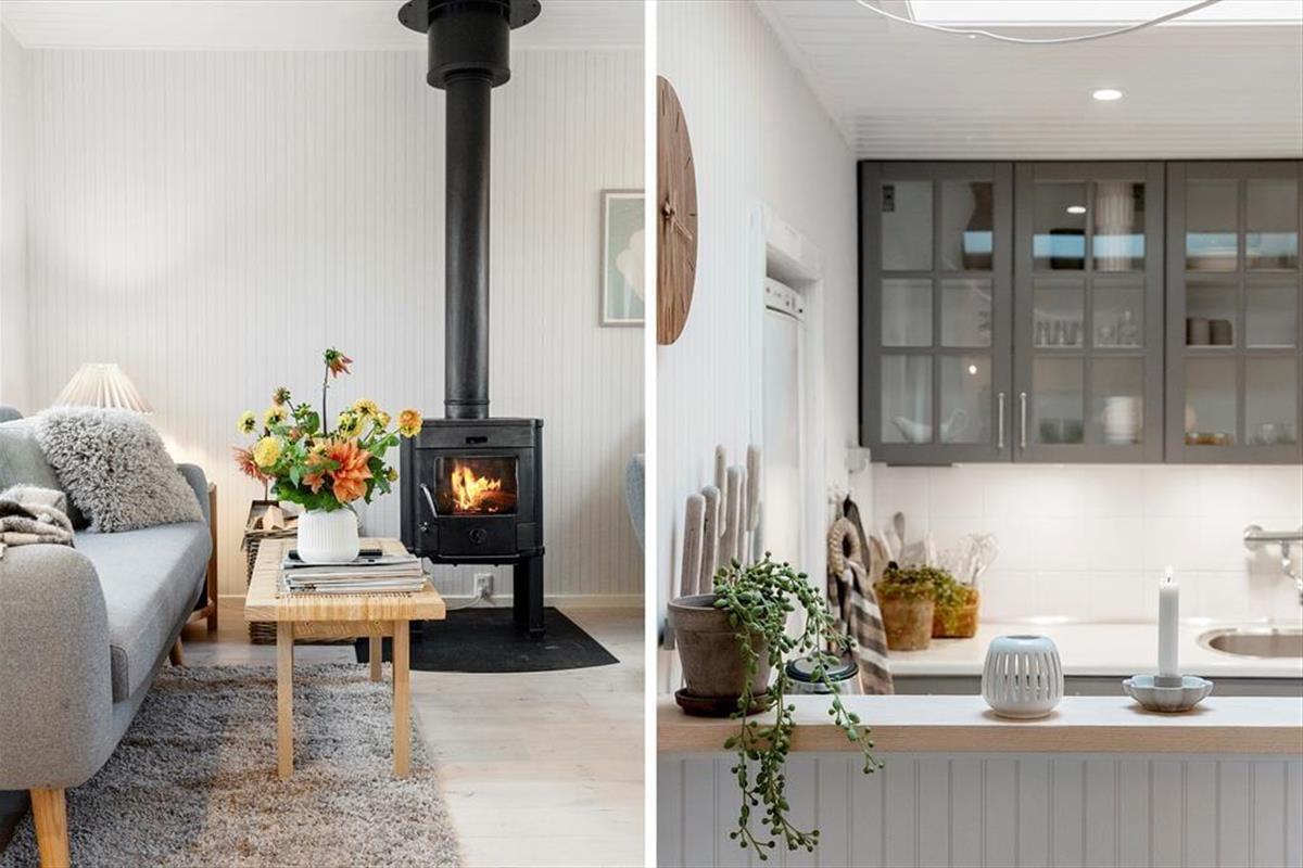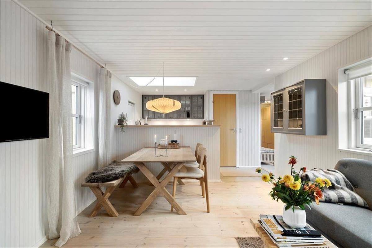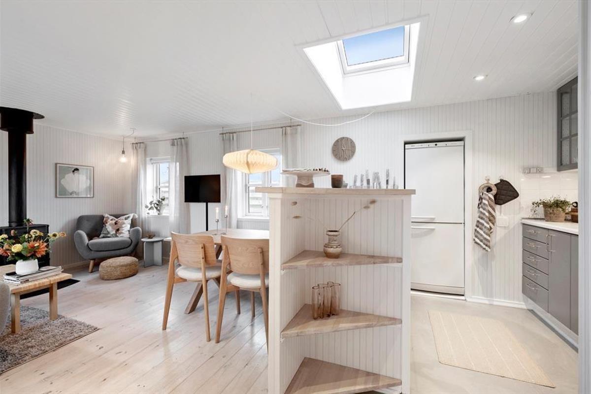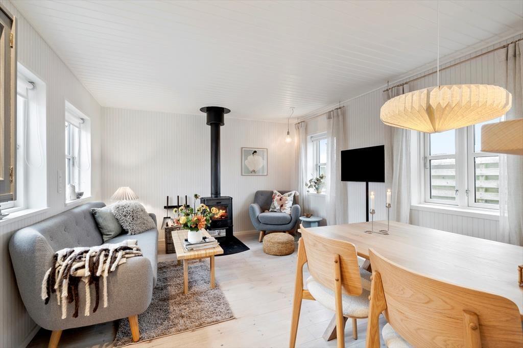 As you step inside the holiday home, you are immediately greeted by a light and inviting atmosphere. The open-plan living room and kitchen/dining area are the heart of the house, where you can easily gather with family or friends for cozy meals and relaxed moments. From the kitchen, you can step directly onto the large wooden terrace, which stretches along the house, where you can enjoy the view directly to the water. The wood stove in the living room provides warmth and a cozy atmosphere on cooler evenings, and the two lovely bedrooms ensure a good night's sleep, so you're ready to explore the area the next day. The bathroom is conveniently equipped with a shower, making it easy to refresh after a day of activities.