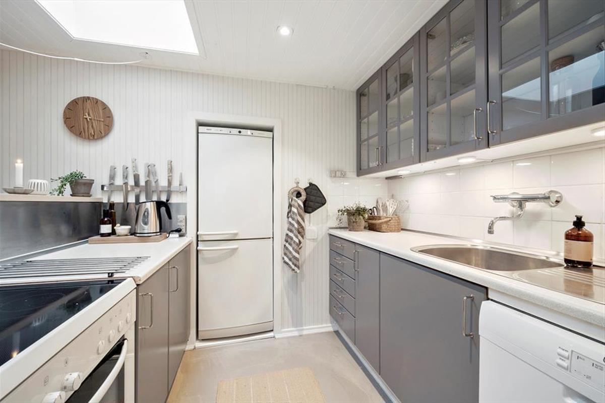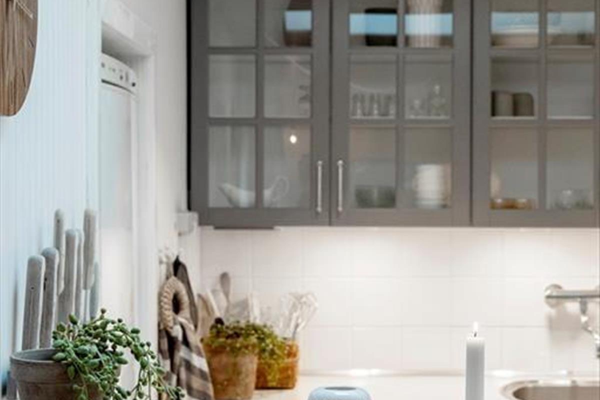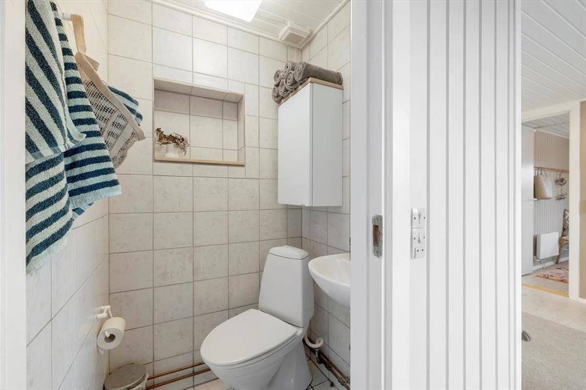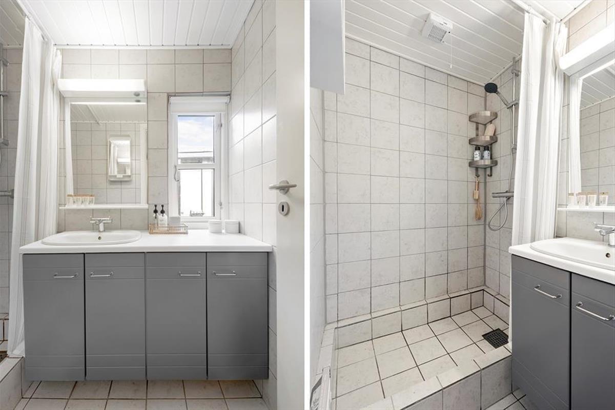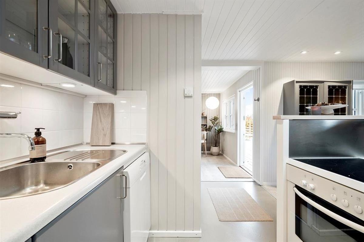 As you step inside the holiday home, you are immediately greeted by a light and inviting atmosphere. The open-plan living room and kitchen/dining area are the heart of the house, where you can easily gather with family or friends for cozy meals and relaxed moments. From the kitchen, you can step directly onto the large wooden terrace, which stretches along the house, where you can enjoy the view directly to the water. The wood stove in the living room provides warmth and a cozy atmosphere on cooler evenings, and the two lovely bedrooms ensure a good night's sleep, so you're ready to explore the area the next day. The bathroom is conveniently equipped with a shower, making it easy to refresh after a day of activities.